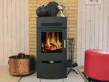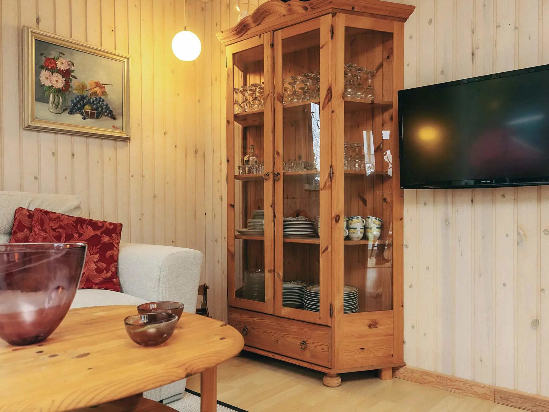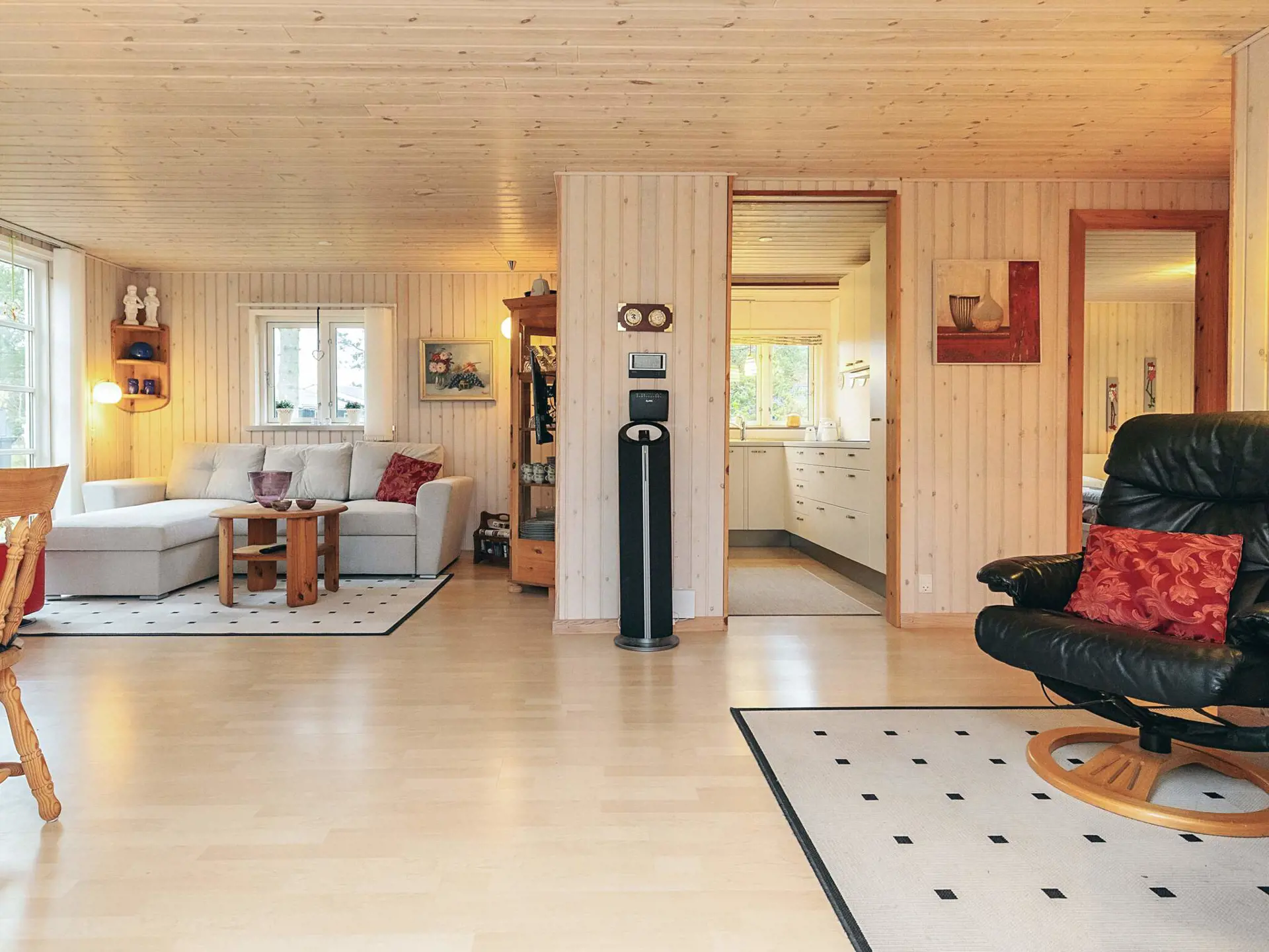 Im Inneren finden Sie ein gemütliches Wohnzimmer mit Platz sowohl für eine Sitzecke als auch für einen Essbereich. Das Wohnzimmer ist der zentrale Treffpunkt mit einem Holzofen, der Wärme und Atmosphäre schafft. Von hier aus gibt es eine offene Verbindung zu einer hellen Küche, die in hellen Farben gehalten ist und viel Platz zum Kochen bietet.