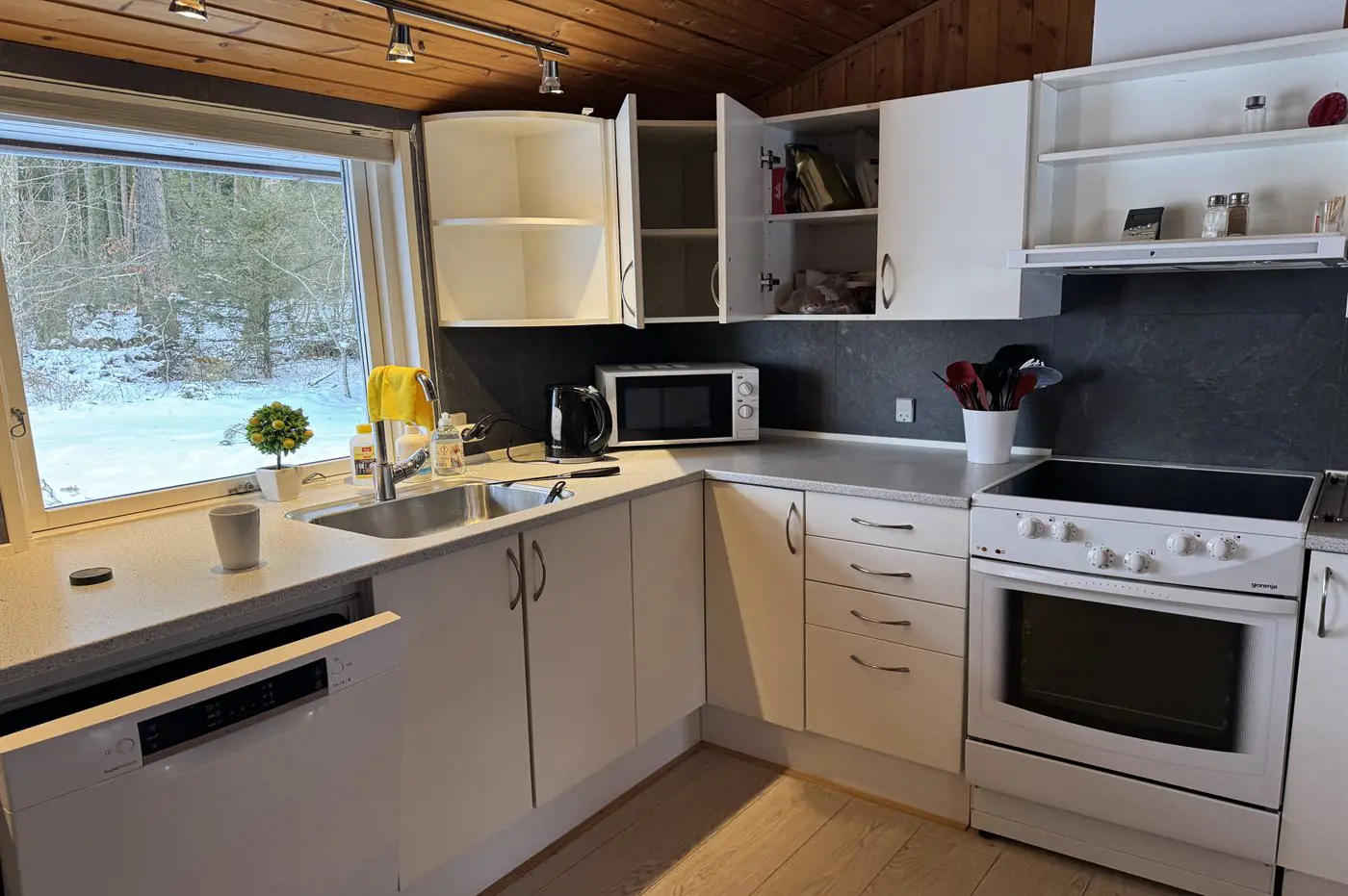 Schönes Ferienhaus in ruhiger Umgebung mit Blick auf Wald und offene Felder, wo du die Natur und das reiche Tierleben ganz aus der Nähe erleben kannst. Hier hast du gute Chancen, Rehe, viele Vogelarten und die friedliche Stimmung zu beobachten, die echte Ferienhausidylle ausmacht.