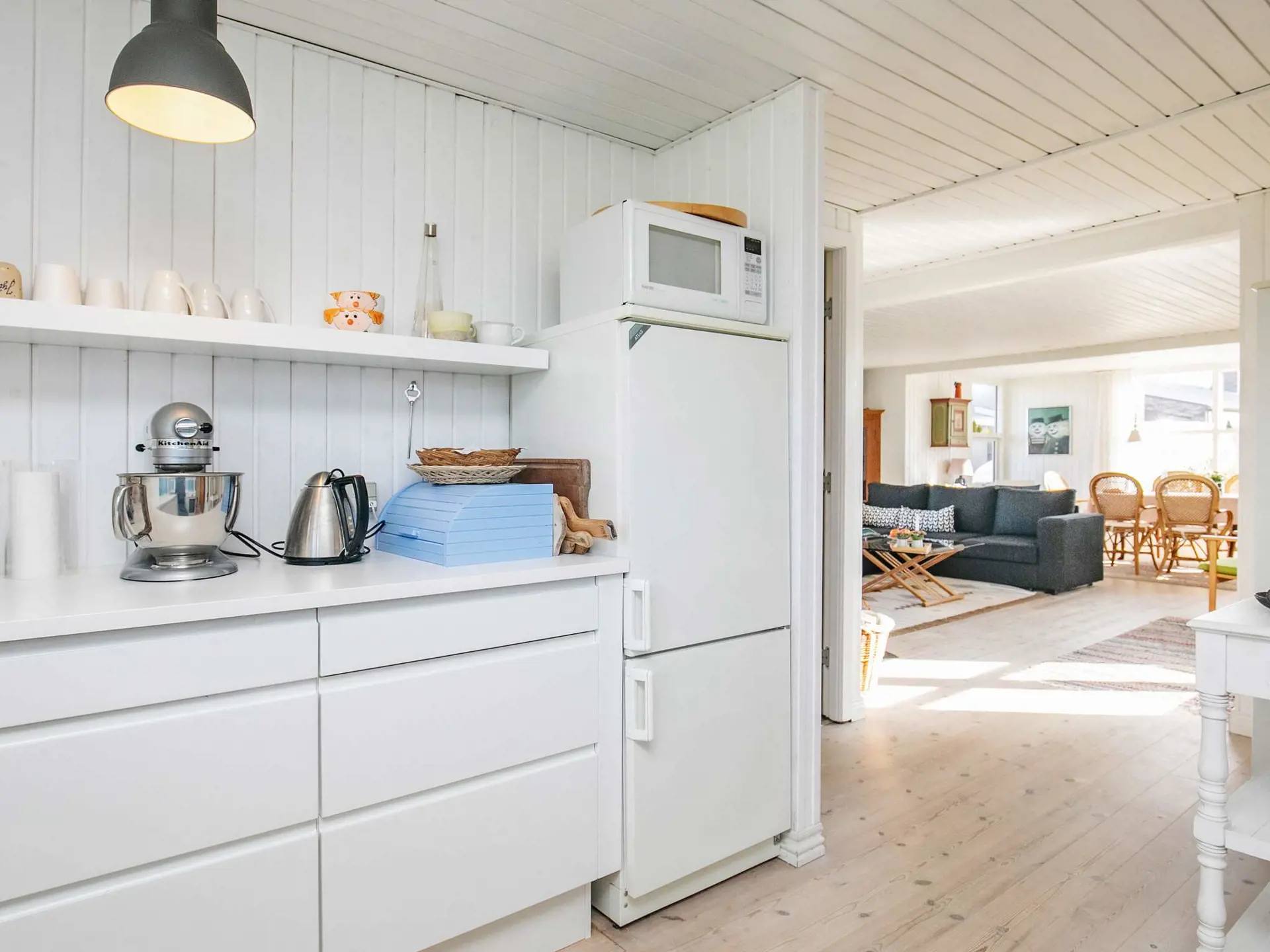 Im Haus offener Küchen-/Wohnbereich mit Ess- und Sitzecke sowie Holzofen für kühlere Abende. Außerdem steht eine klimafreundliche Wärmepumpe zur Verfügung. Die vielen Fenster im Raum sorgen für ein helles Wohnambiente und schönen Ausblick, teils zum Wasser.