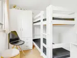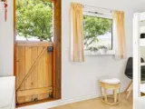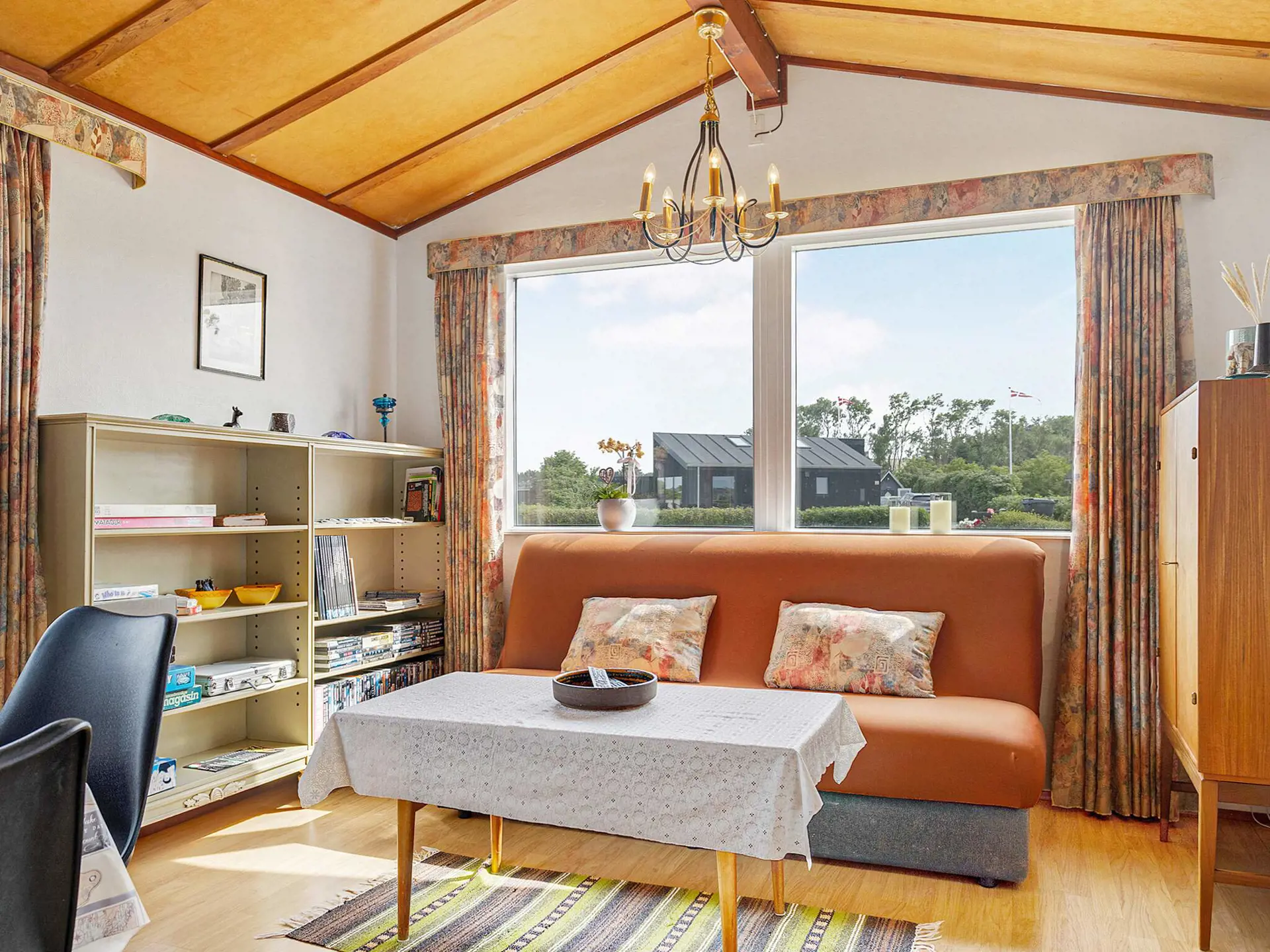 Das Häuschen besteht aus einem offenen Küchen-/Wohnbereich für das Familienleben, mit Esstisch und Schlafsofa. Außerdem stehen zwei kleine Schlafzimmer bereit; eines mit einem Etagenbett mit zwei Kojen, das andere mit einem 120 cm breiten Einzelbett. Badezimmer mit Dusche.