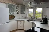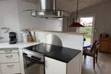 Die Küche ist mit Kühlschrank ausgestattet. Außerdem gibt es 4 Keramik-Kochfelder, Umluftofen.