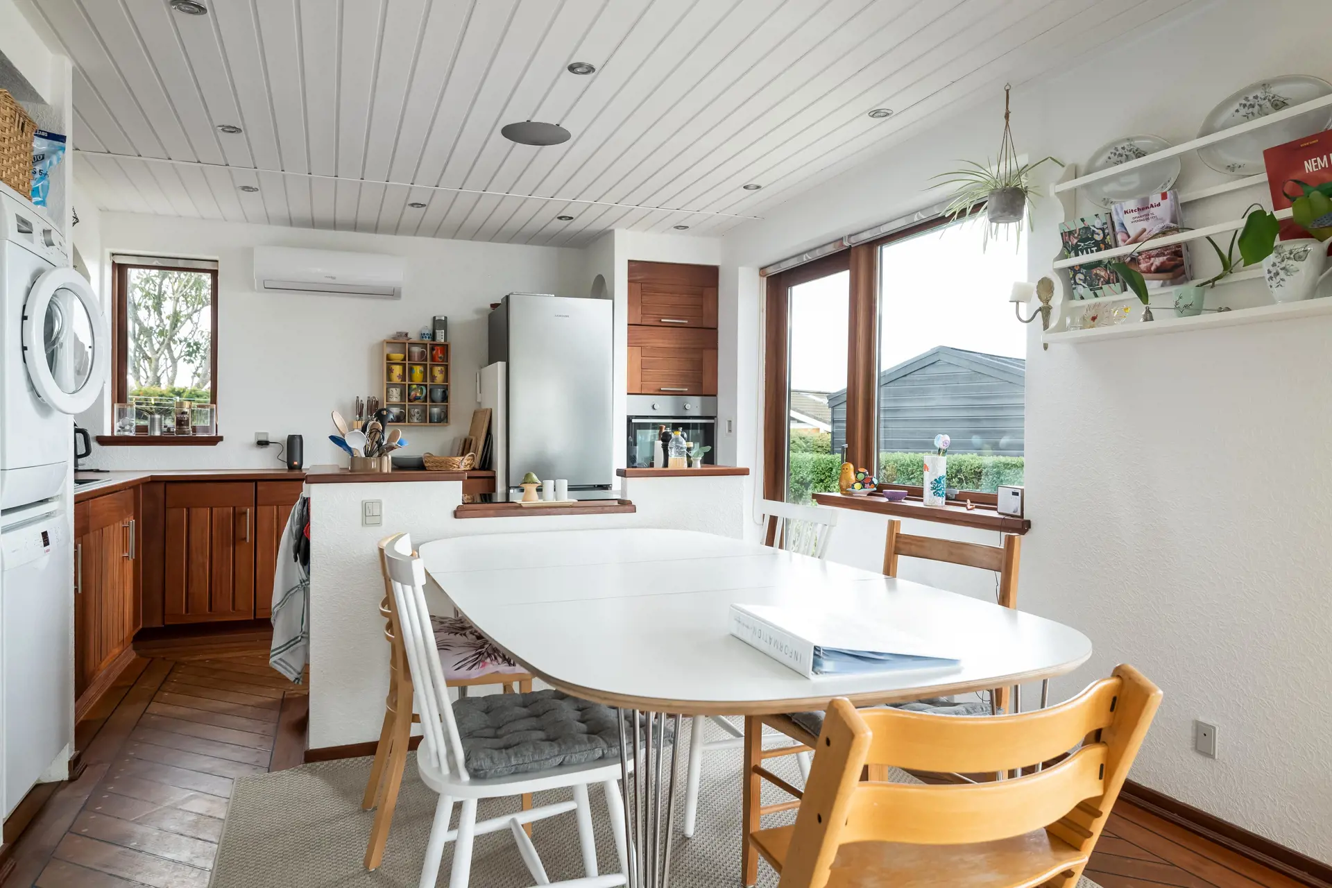Das Haus wurde 2002 umfassend renoviert und seither sehr gut gepflegt – was sich auch deutlich sehen und spüren lässt. Die Küche ist mit Geschirrspüler, Kühl-/Gefrierkombination, Kaffeemaschine, diversen Küchenutensilien, viel Arbeitsfläche sowie einer Kochinsel mit Induktionsherd zur Wohnseite hin ausgestattet. So wird Kochen sicher nicht zur einsamen Tätigkeit. Im Badezimmer befinden sich eine Dusche und eine Waschmaschine. Ein Trockner steht im Geräteschuppen zur Verfügung.