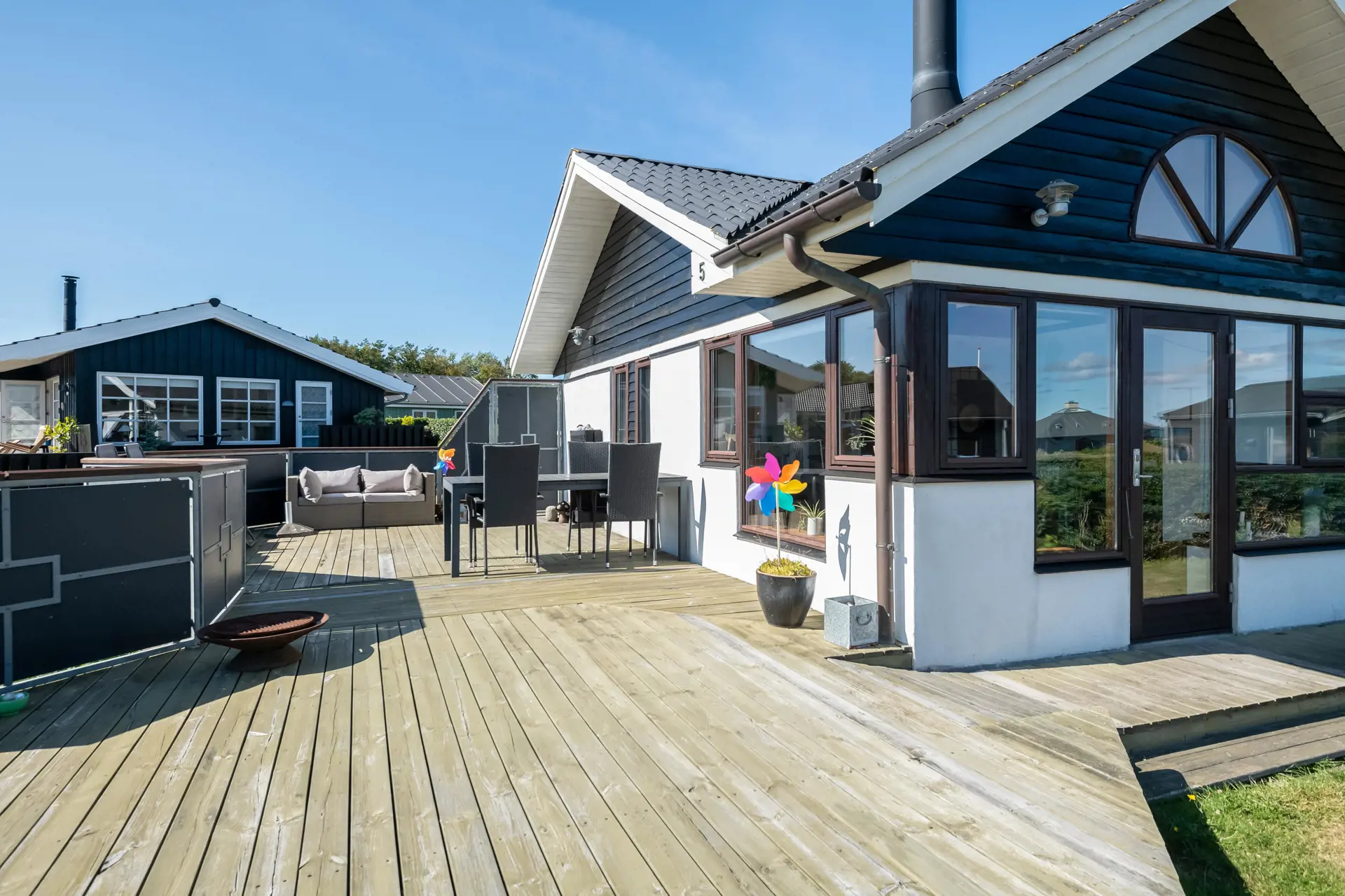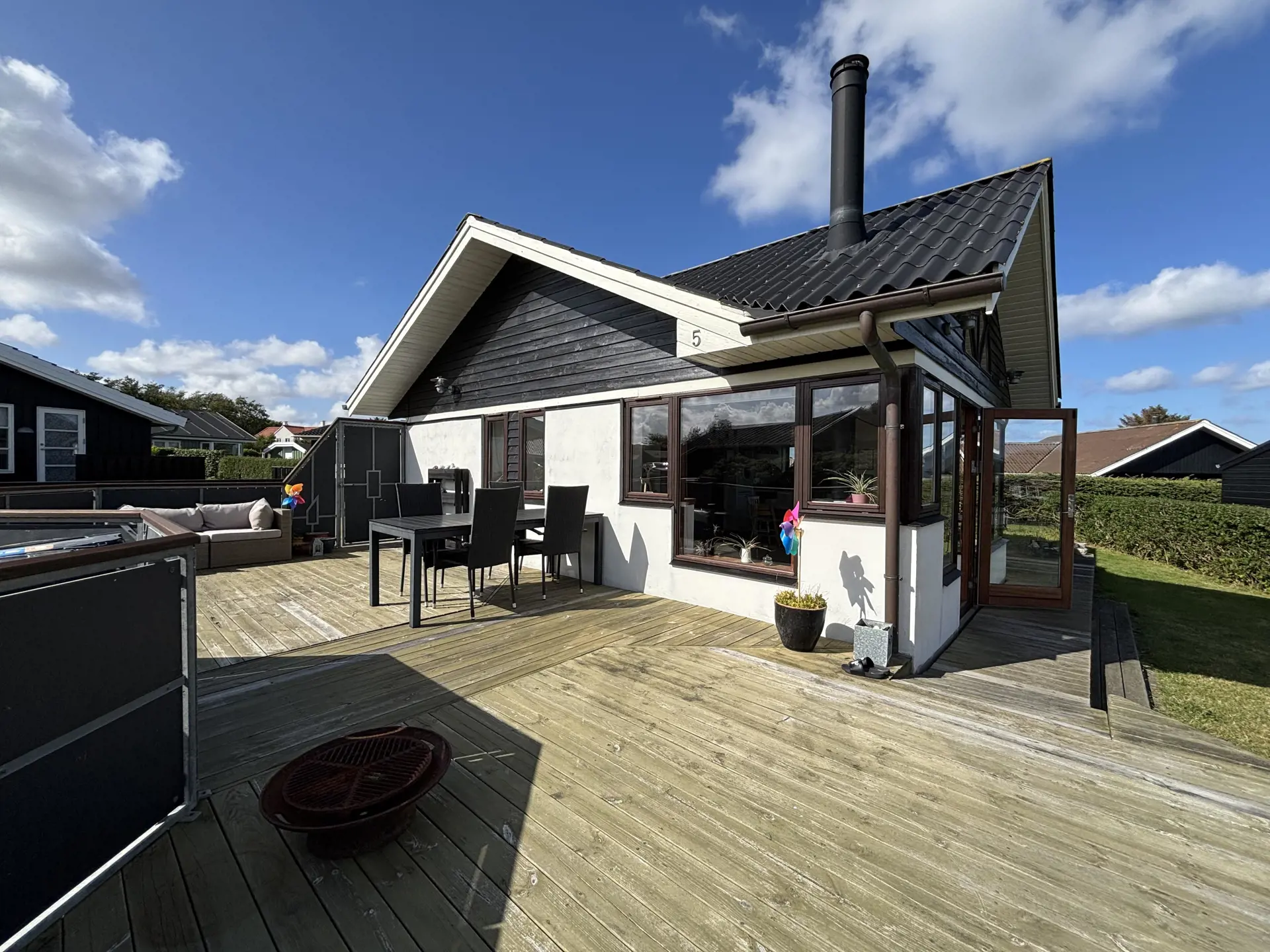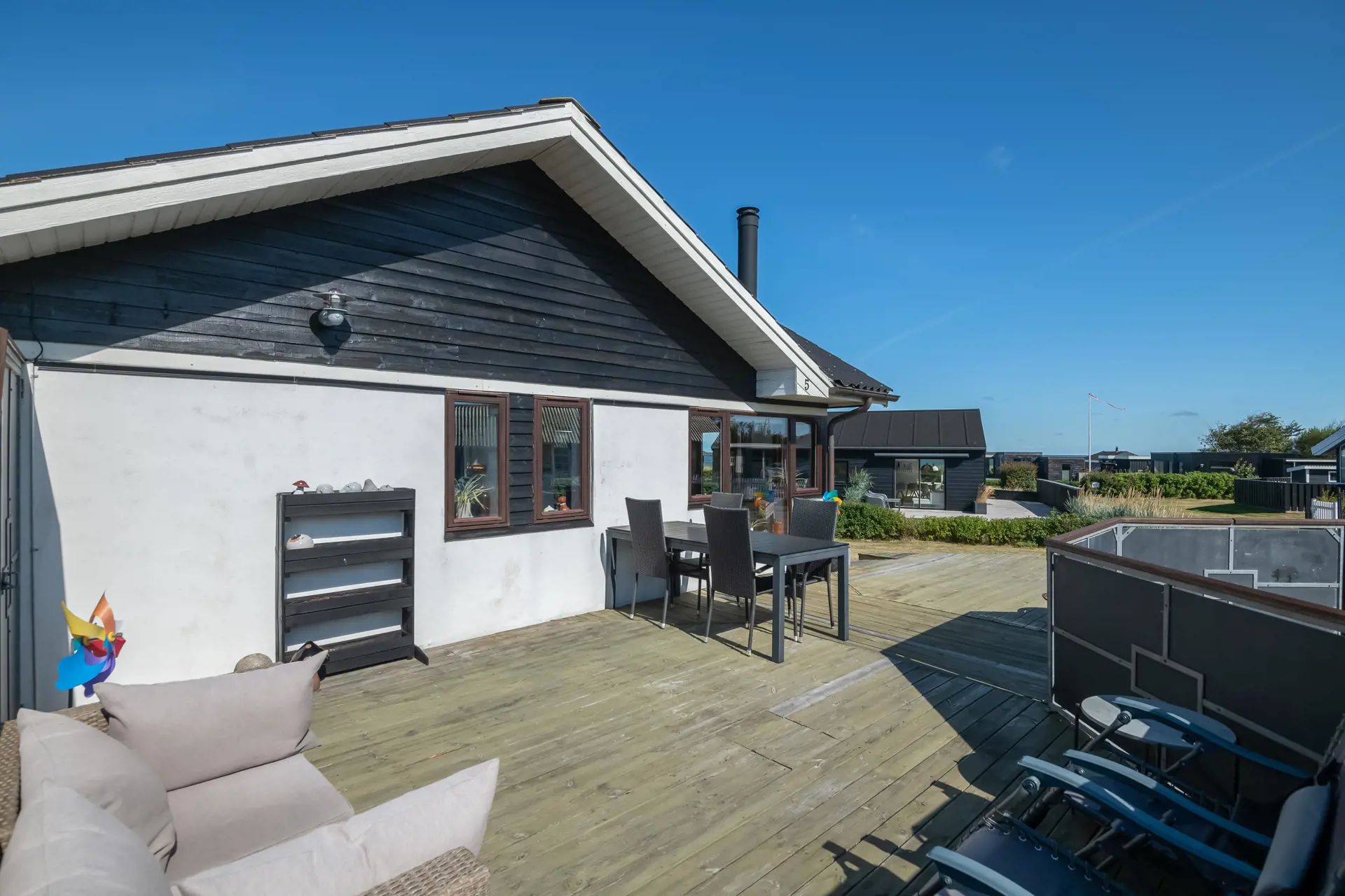 Küche und Wohnzimmer sind offen gestaltet und verleihen dem Haus mit Schiffsboden, Holzküche, Holztüren, Holz-/Metalltreppe und der gesamten Einrichtung einen schönen maritimen Look. Rund um das Haus erstreckt sich eine große Holzterrasse mit mehreren gemütlichen Ecken und Zugängen sowohl vom Wohnzimmer als auch von der Küche. Die Terrasse ist so angelegt, dass sie vom Parkplatz aus mit einem Rollstuhl befahrbar ist – allerdings gibt es kleine Türschwellen am Ein- und Ausgang des Hauses. Auf der Rückseite befindet sich eine Außendusche, ideal zum Abspülen des Sands nach einem Besuch des nahegelegenen Strandes mit der Blauen Flagge.