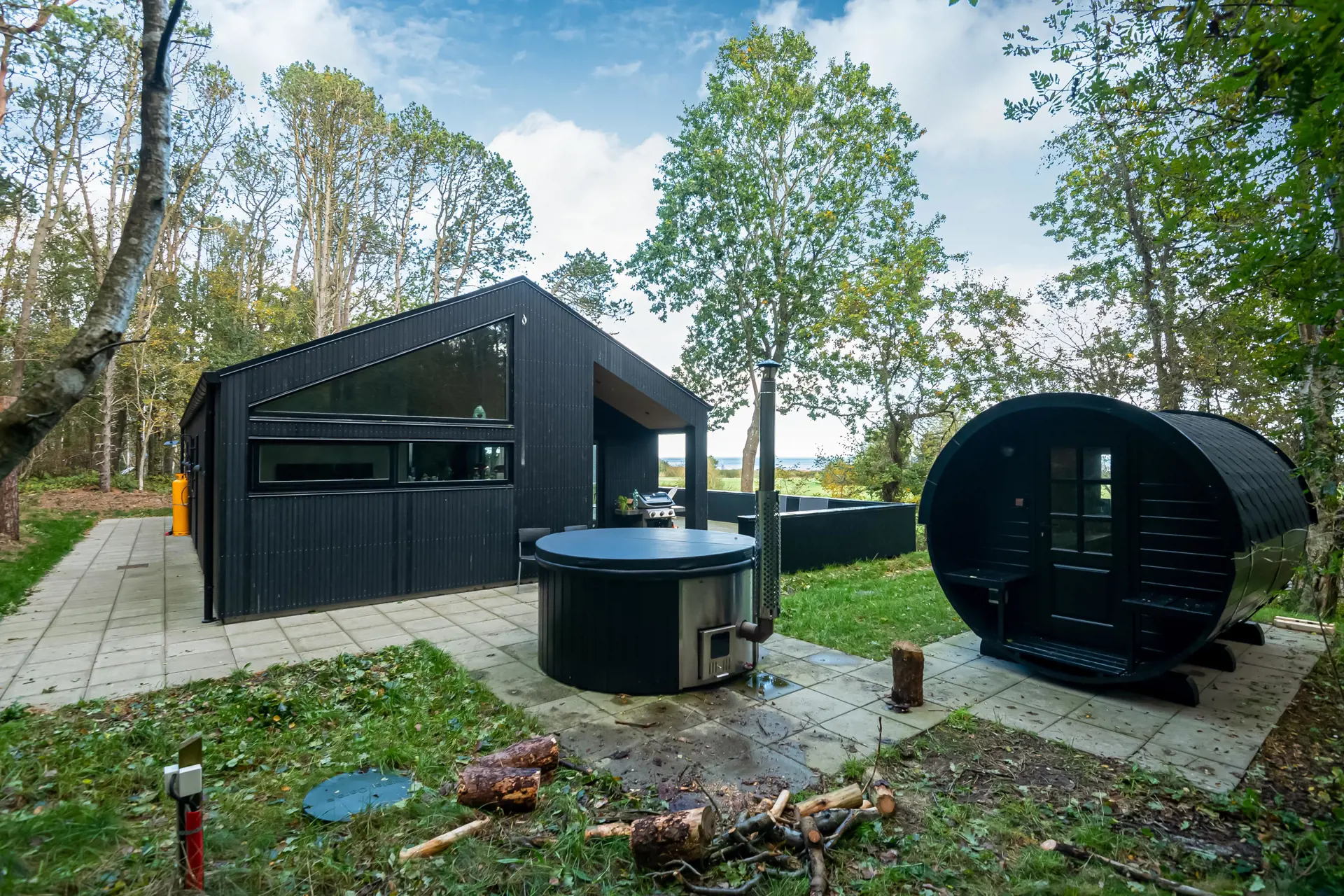 Draußen steht pure Entspannung im Mittelpunkt. Lassen Sie sich im warmen Badezuber treiben oder genießen Sie die wohlige Wärme der Sauna mit Blick in die Natur. Die Terrasse eignet sich perfekt für Mahlzeiten im Freien und lange Sommerabende.