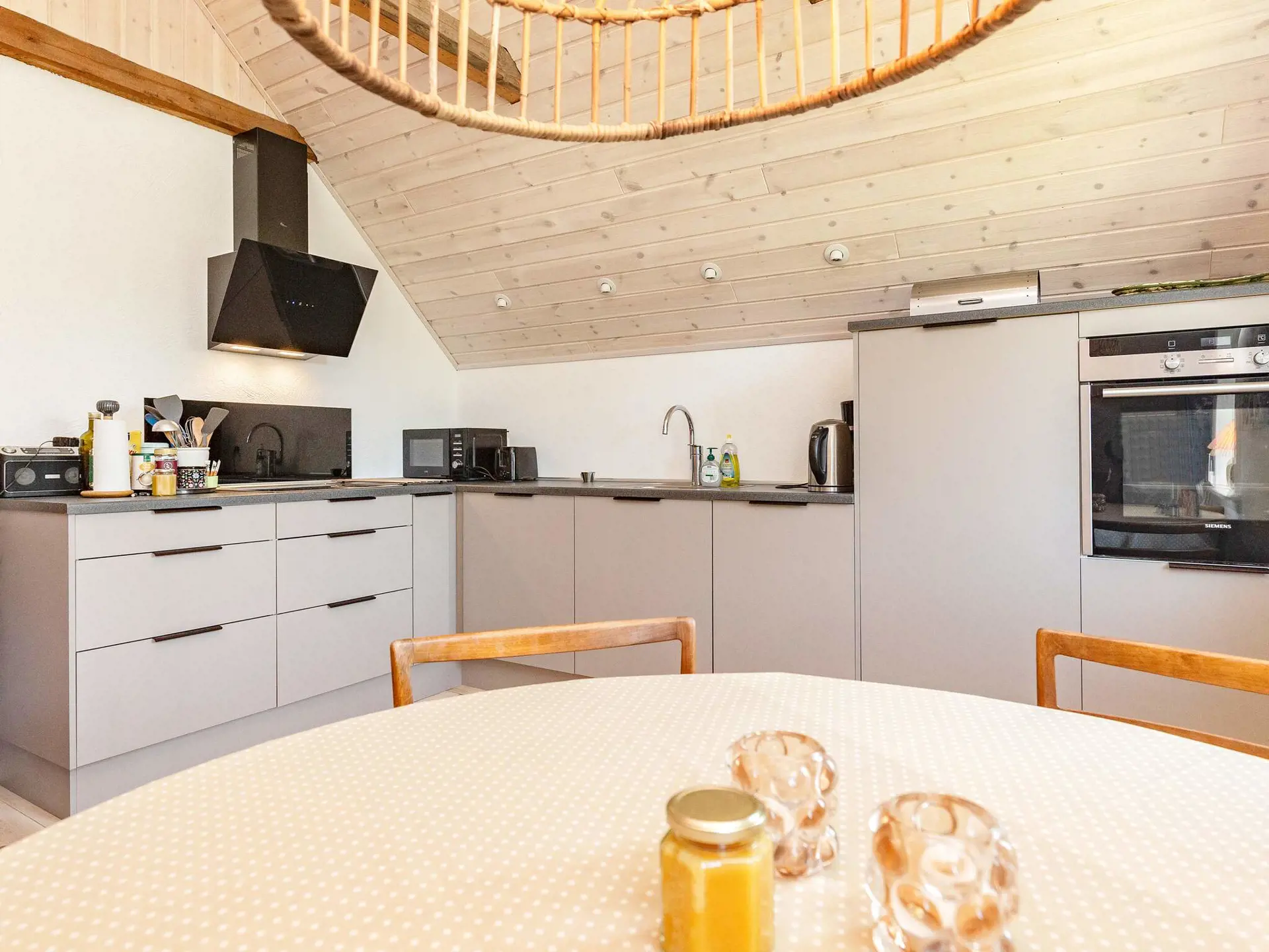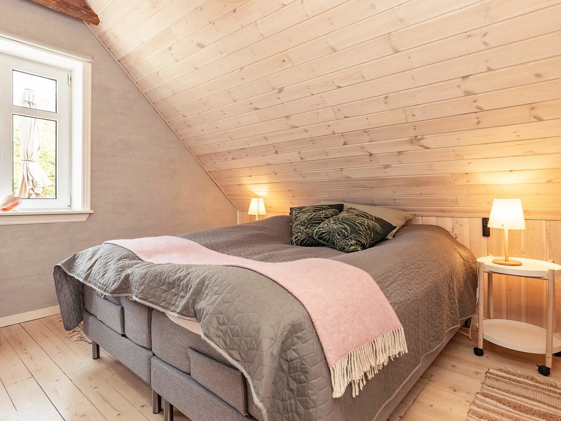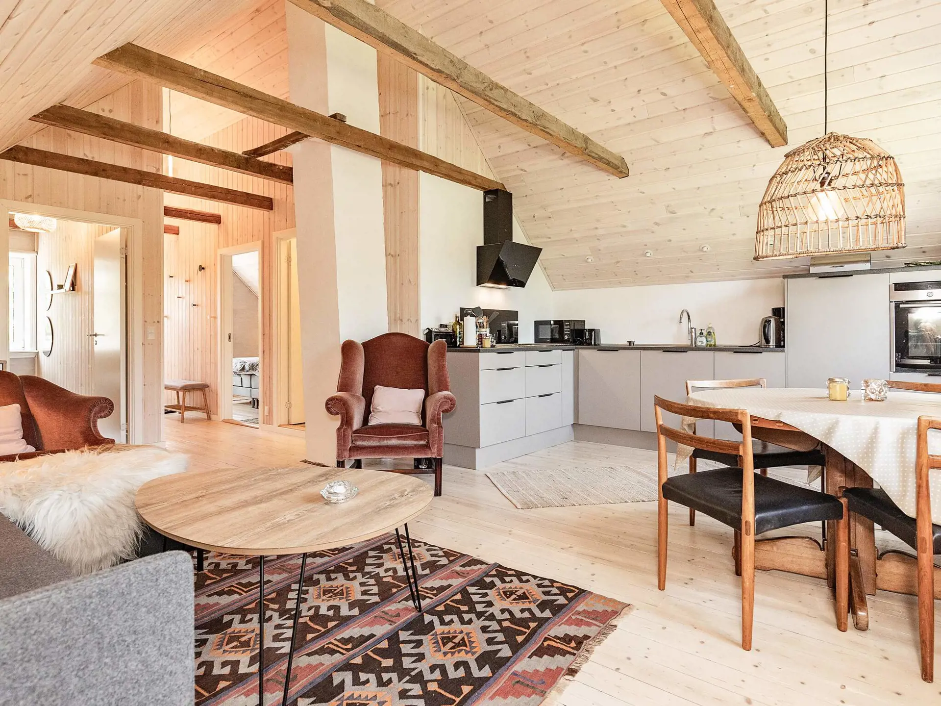 Das helle Apartment verfügt über Dachschrägen und ist in typisch nordischem Stil eingerichtet. Es gibt zwei Schlafzimmer mit je einem Doppelbett, in einem Zimmer sind die Betten auseinanderschiebbar. Wohnzimmer und Küche in einem.
