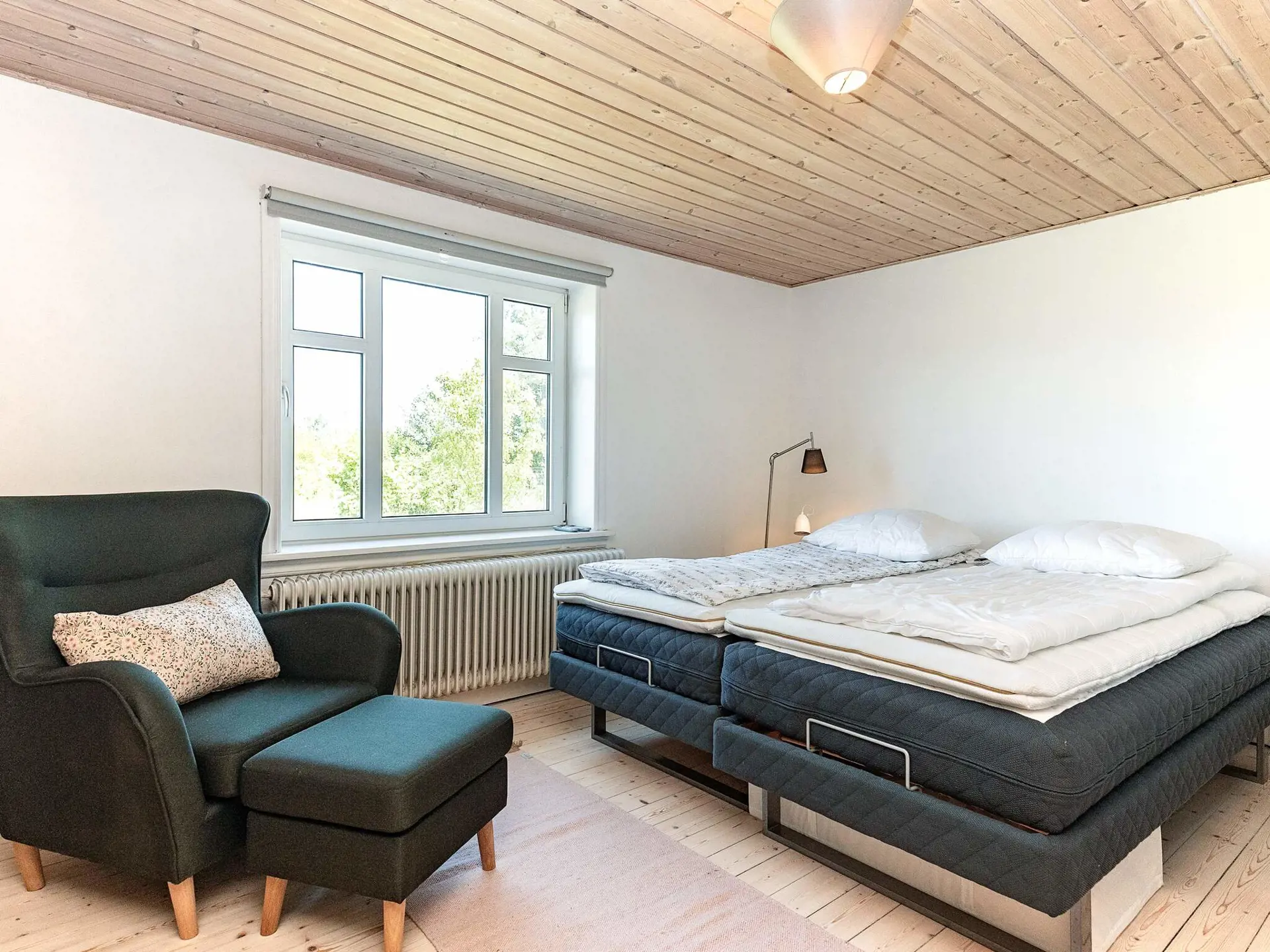 Die helle Wohnung ist in typisch nordischem Stil eingerichtet. Sie hat ein Schlafzimmer mit Doppelbett. Wohnzimmer und Küche in einem.