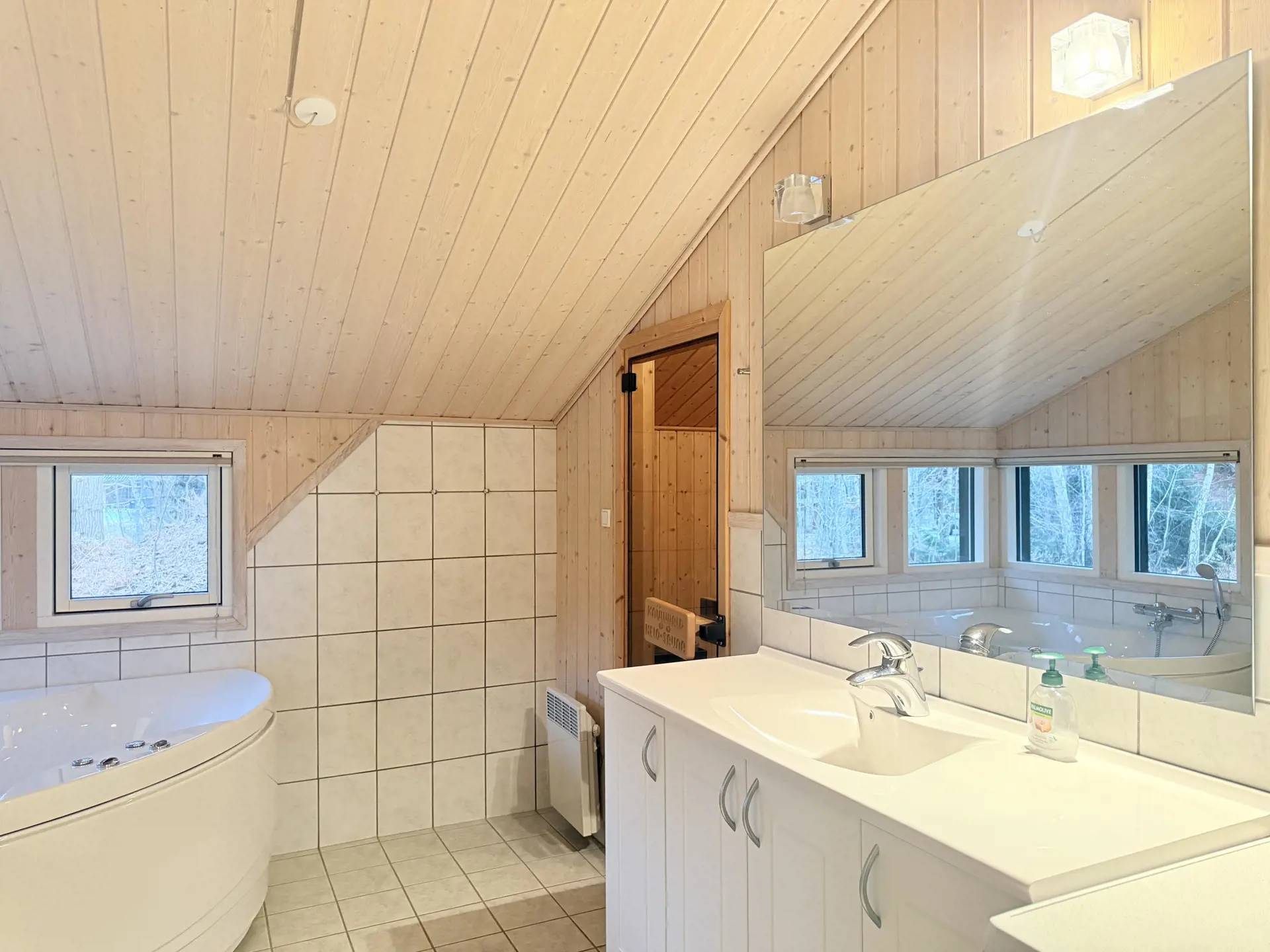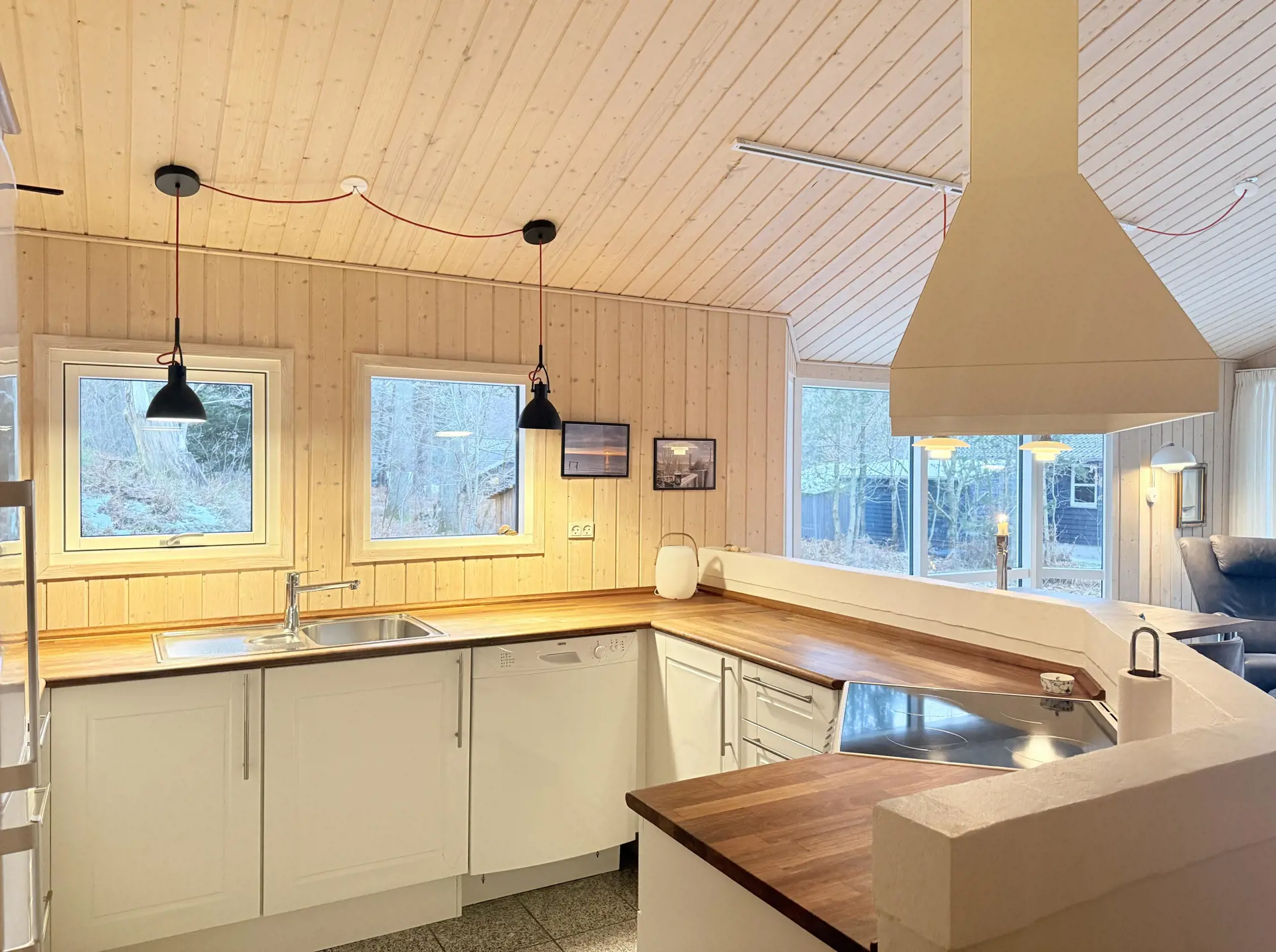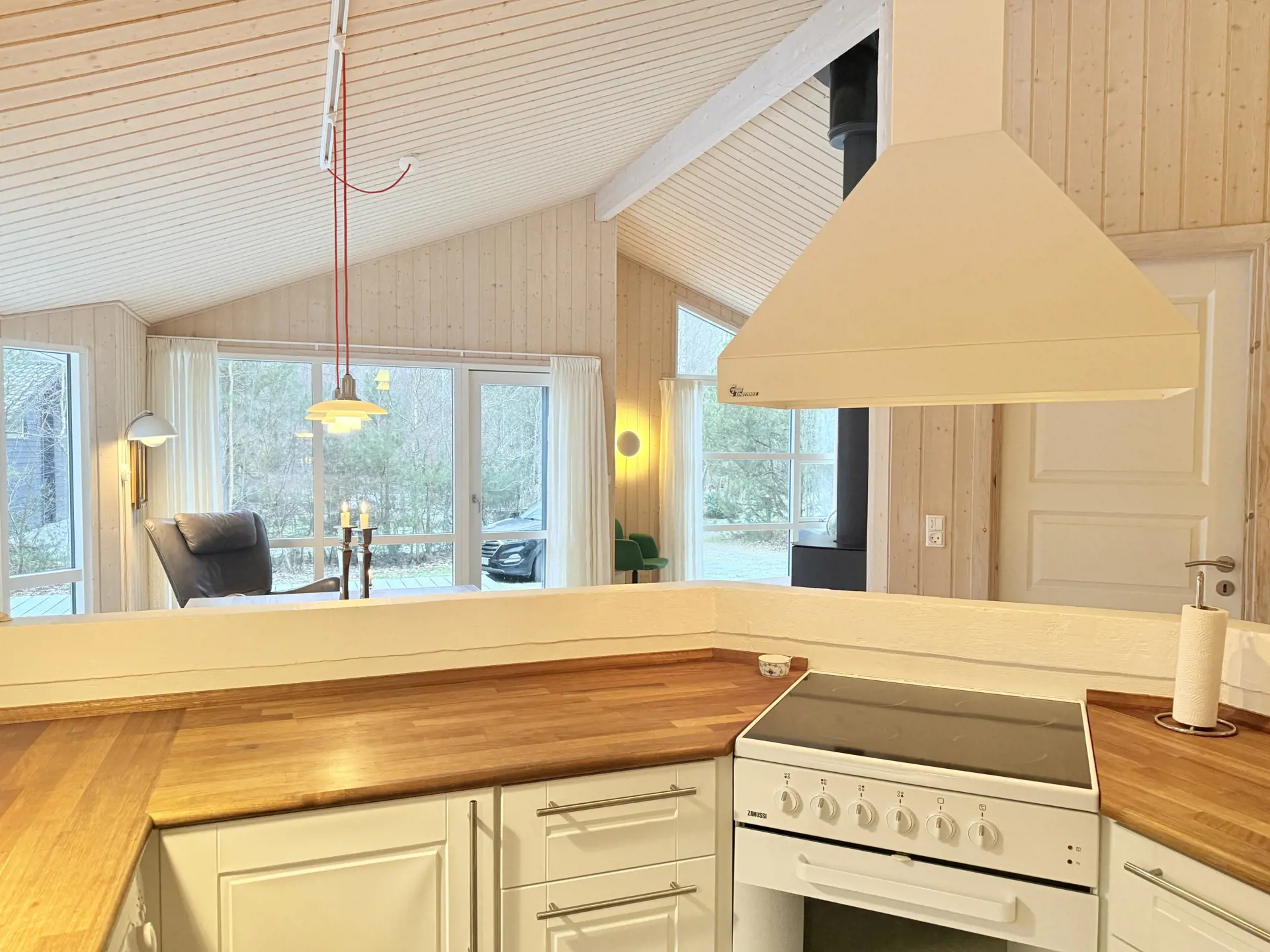 Neu im Team Læsø. Ein wirklich bezauberndes Ferienhaus in ruhiger Lage inmitten der Natur mit vielen Annehmlichkeiten im Innen- und Außenbereich. Das Haus mit Satteldach wirkt hell und einladend und ist komfortabel eingerichtet. Im Zentrum befindet sich eine geräumige Wohnküche mit einer schönen, großen Küche, einem Essbereich und einer gemütlichen Sofaecke mit Kaminofen. Von hier aus gelangt man auf die Holzterrasse des Ferienhauses, die sonnige Plätzchen zum Verweilen und gemütliche Grillabende bietet. Das Haus verfügt über drei komfortable Schlafzimmer, zwei davon mit Doppelbetten und eines mit Schlafcouch. Das sehr schöne und geräumige Badezimmer ist mit Whirlpool, Dusche und Sauna ausgestattet.