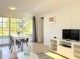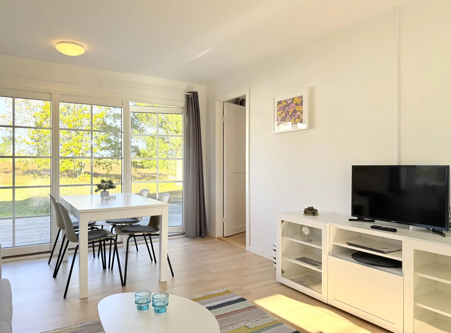 Schönes, neu renoviertes Golfhaus in herrlicher Lage in Nordmarken. Das Haus ist ein Doppelhaus und Teil des Ferienhausdorfs am Læsø Seaside Golfplatz. Das Haus hat einen überdachten Eingang mit kleiner Terrasse, eine schöne Eingangshalle und ein Badezimmer mit Dusche. Schöne Küche, gemütliches Wohnzimmer mit Esstisch und Sofa und Fernseher mit Chromecast. Es gibt ein großes Fenster mit schöner Aussicht und Zugang zur Terrasse. Von der Terrasse aus hat man einen Blick auf das Golfhotel und die Stranddünen. Das Haus hat 2 Zimmer – eines mit 2 Einzelbetten und eines mit einem 120-Bett. Das Haus ist für 4 Personen geeignet und es besteht die Möglichkeit, das Schlafsofa im Wohnzimmer zu nutzen. Das Haus ist mit einer Luft-Luft-Wärmepumpe und Glasfaser-Internet ausgestattet. Es sind nur ca. 100 Meter bis zu einer Ladestation für Elektroautos.