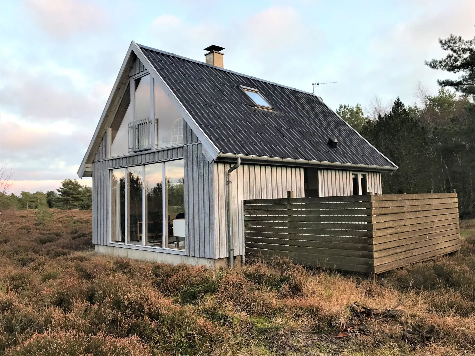 Das Haus selbst verfügt über eine große Wohnküche mit Essbereich und Sofaecke mit Holzofen. Schönes Licht und schöne Aussicht. Außerdem befinden sich im Erdgeschoss das Badezimmer mit Waschmaschine und ein Schlafzimmer mit Eizelbett. Von der Küche aus hat man Zugang zu einer gemütlichen, privaten Holzterrasse. Im 1. Stock gibt es einen Platz, um den Blick auf das einzigartige, reizvolle Heidegebiet zu genießen und auf das Meer zu blicken. Darüber hinaus ist die 1. Etage mit einem Doppelbett und einem Einzelbett ausgestattet.