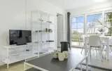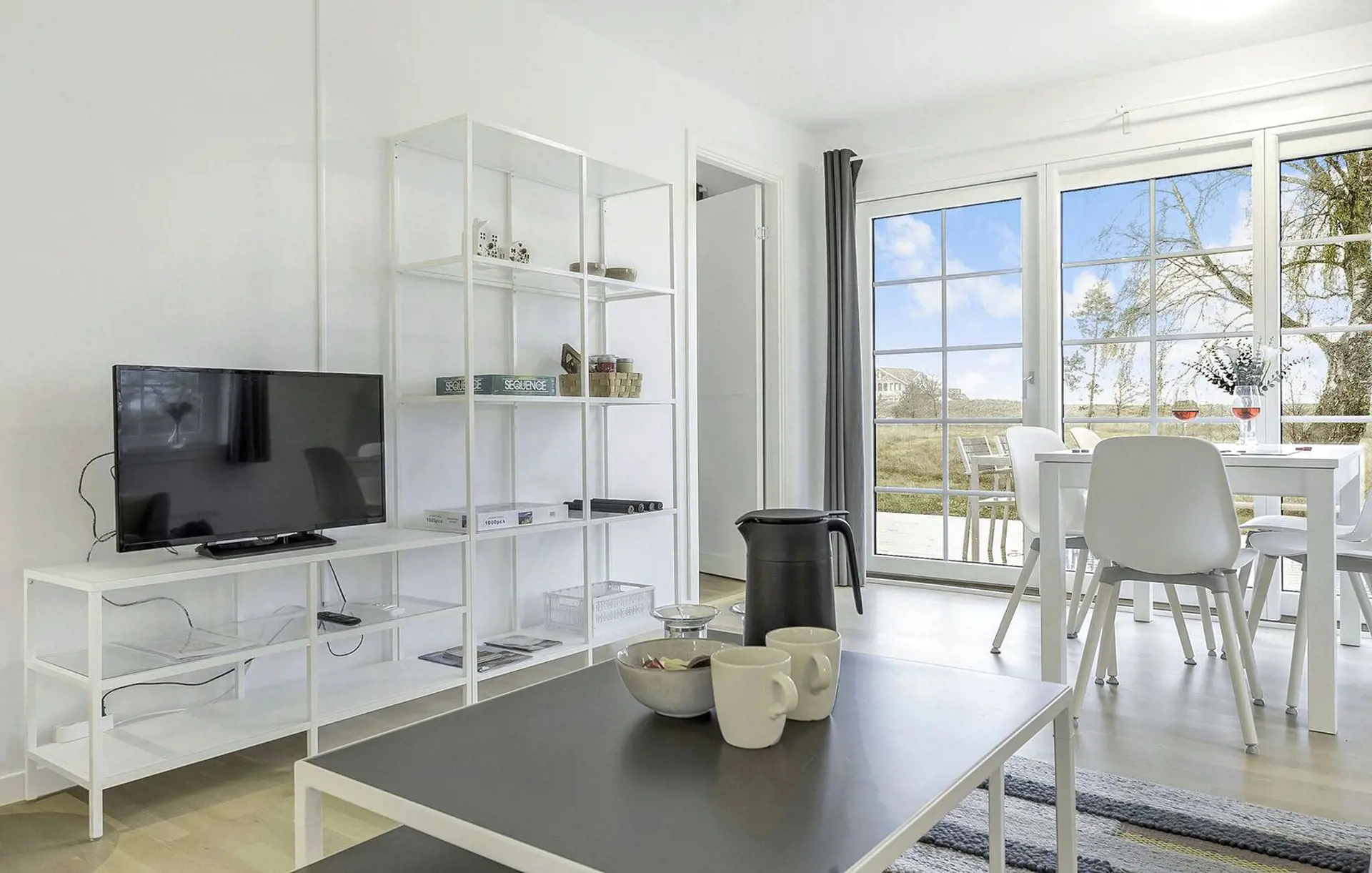 Treten Sie ein und lassen Sie den Alltag hinter sich. Diese helle Erdgeschosswohnung lädt dazu ein, die Ruhe der Insel in vollen Zügen zu genießen. Große Fensterfronten geben den Blick auf das Meer frei und füllen den Raum mit Licht und einer freundlichen Atmosphäre. Machen Sie es sich auf dem großen Sofa bequem und genießen Sie die moderne, klare Einrichtung mit sanften Farbtönen und stilvollen Details. Bereiten Sie in der offenen Wohnküche Ihr Frühstück oder ein gemütliches Abendessen zu und essen Sie am hellen Esstisch mit Blick auf die Landschaft. Die Wohnung ist durchdacht gestaltet und bietet allen Komfort für einen entspannten Aufenthalt.