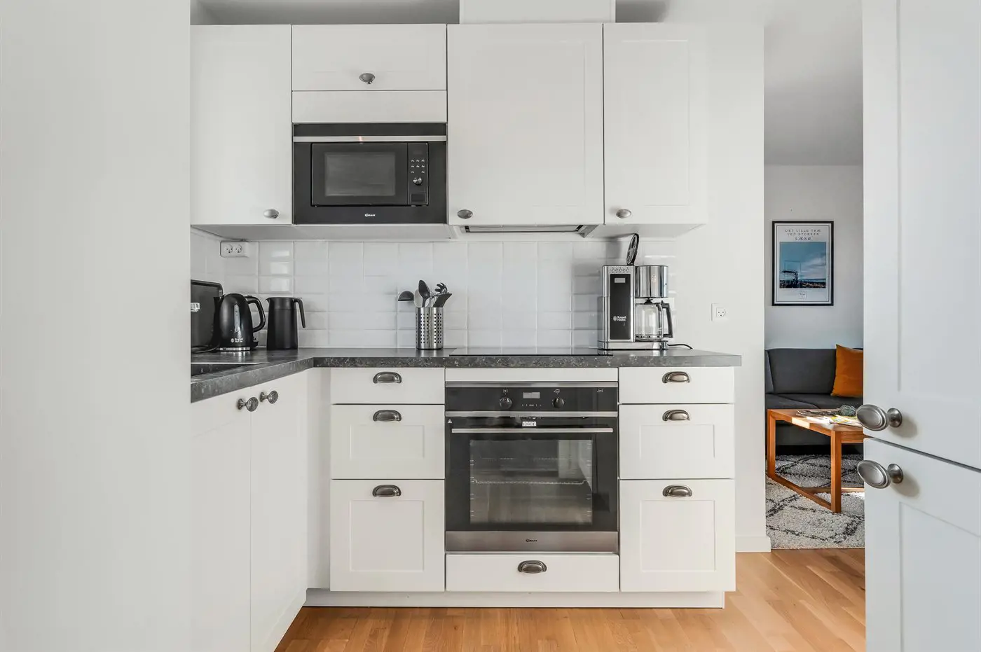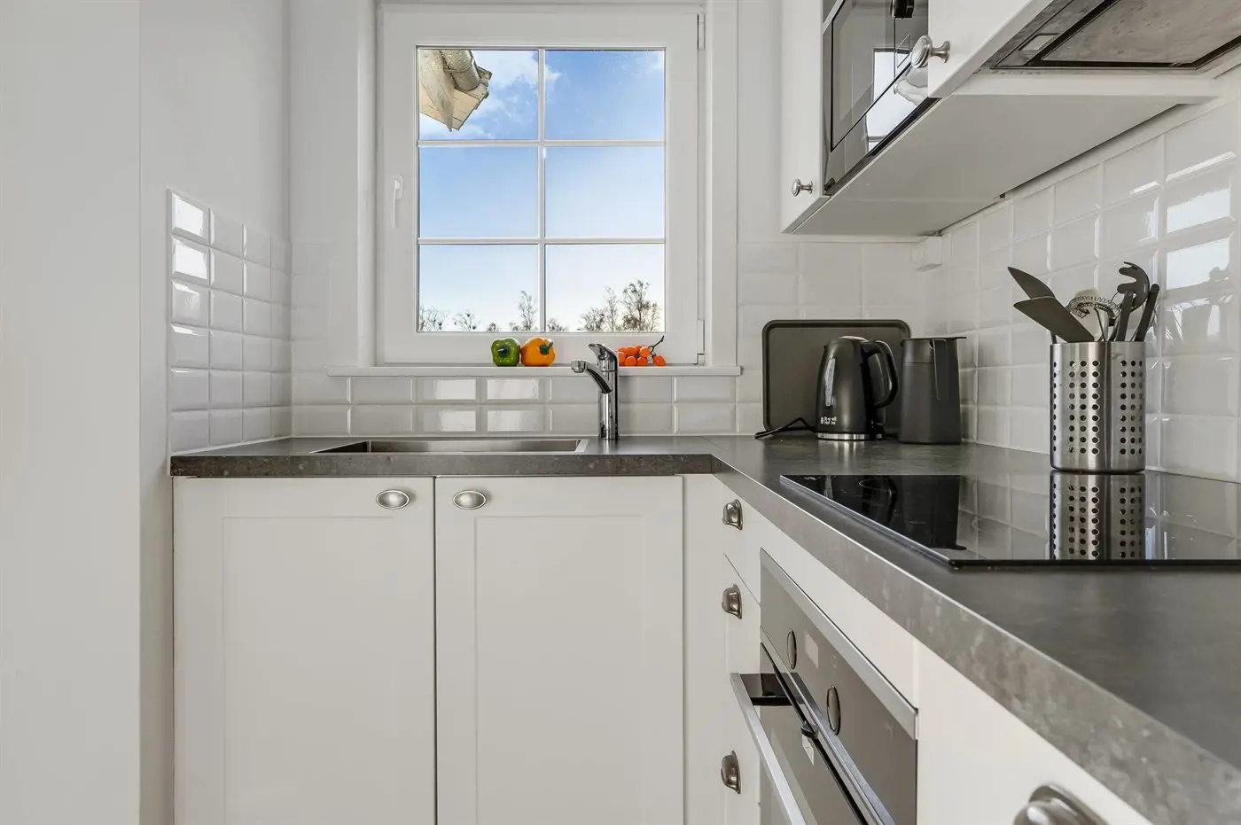 Die Küche ist mit Kühlschrank ausgestattet. Außerdem gibt es 4 Induktions-Kochzonen, Umluftofen, Mikrowelle.