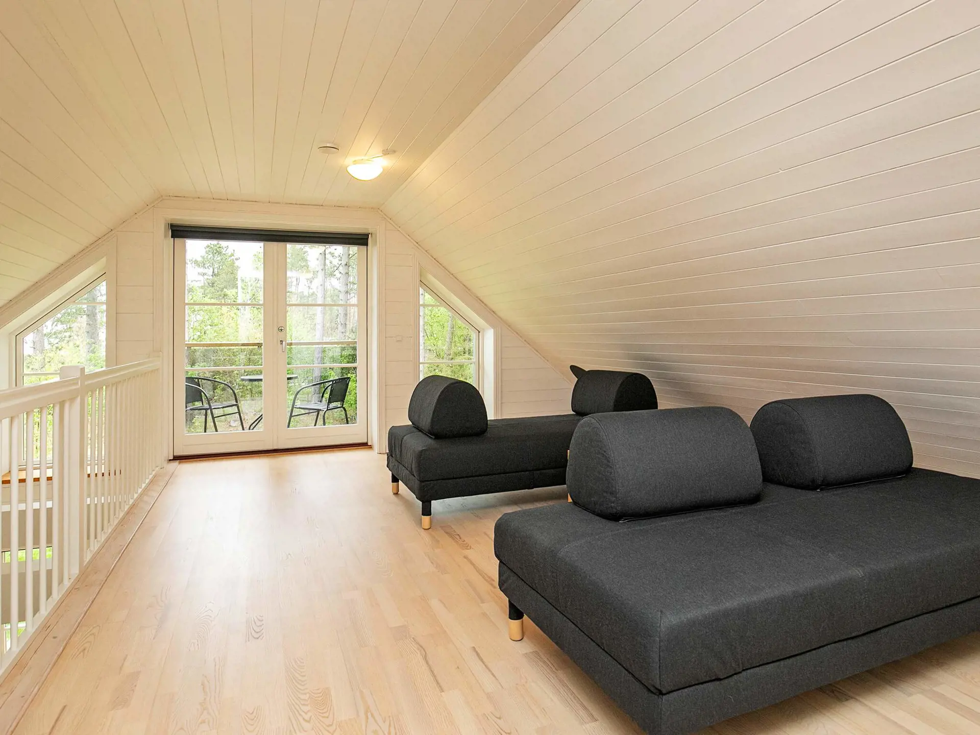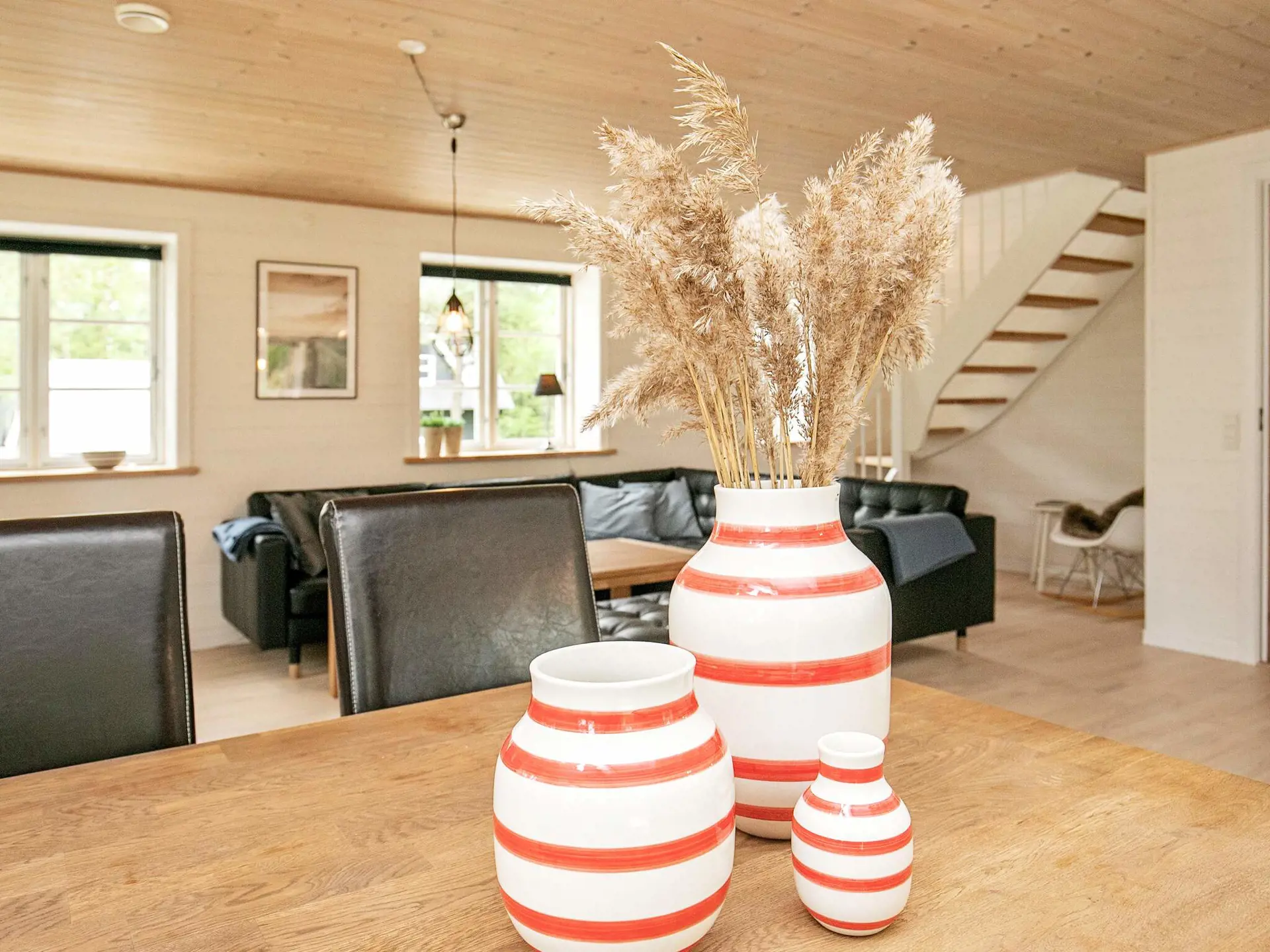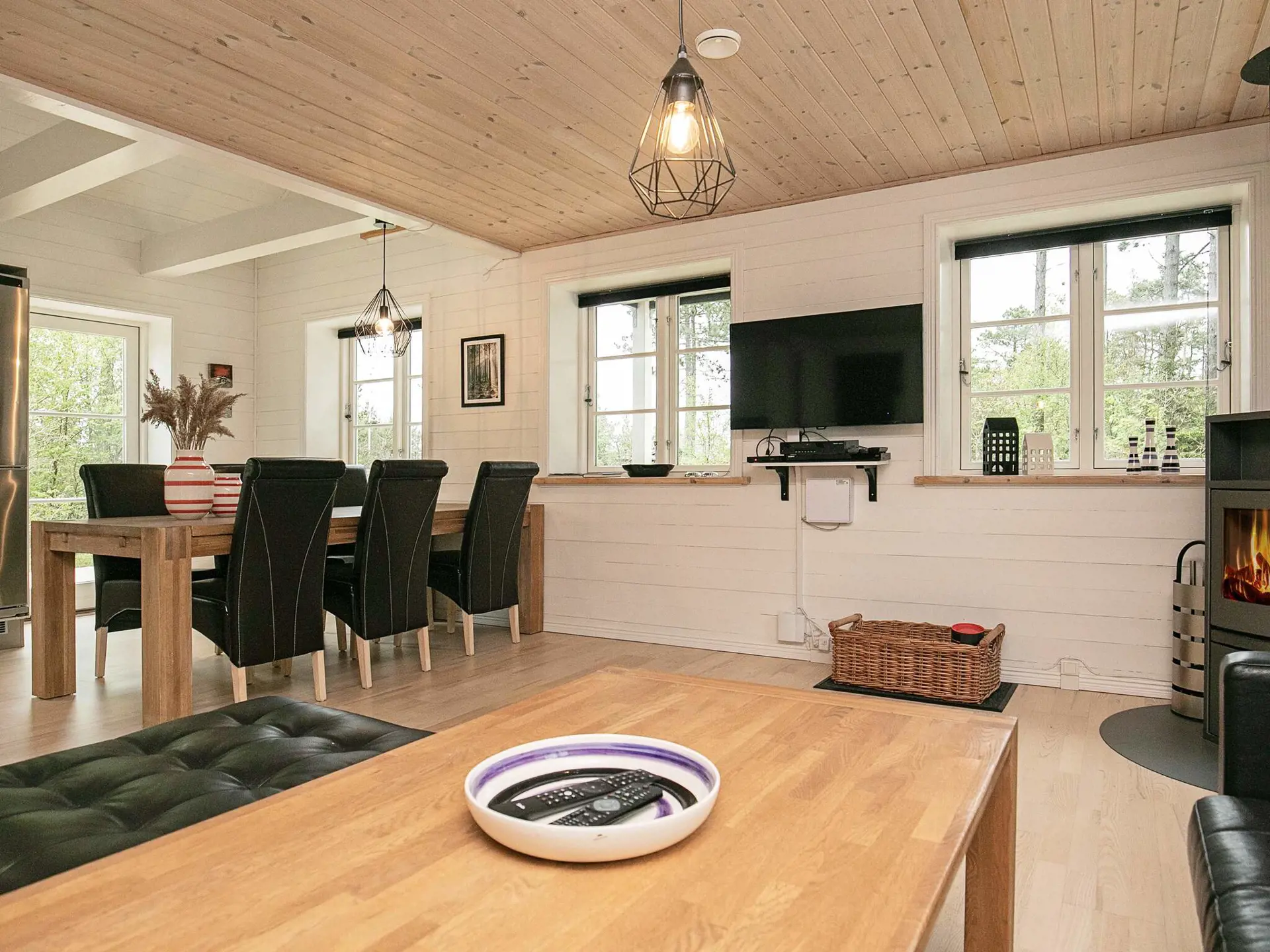 Das Ferienhaus hat einen praktischen Hauswirtschaftsraum im Erdgeschoss, zwei gute Schlafzimmer mit Stauraum und ein großes Badezimmer mit Whirlpool und Sauna. Das Herzstück des Familienlebens ist der offene Küchen-/Wohnbereich mit Essecke und Holzofen für kühlere Abende. Der große Raum ist auf einer Seite bis zum Dachfirst offen, was zum luftigen Wohnambiente beiträgt. Von hier aus haben Sie auch Zugang zu einer großen, überdachten Terrasse. Im Dachgeschoss befinden sich ein großes Schlafzimmer und das Gäste-WC sowie ein schöner Wohnbereich mit Blick bis zur Küste.