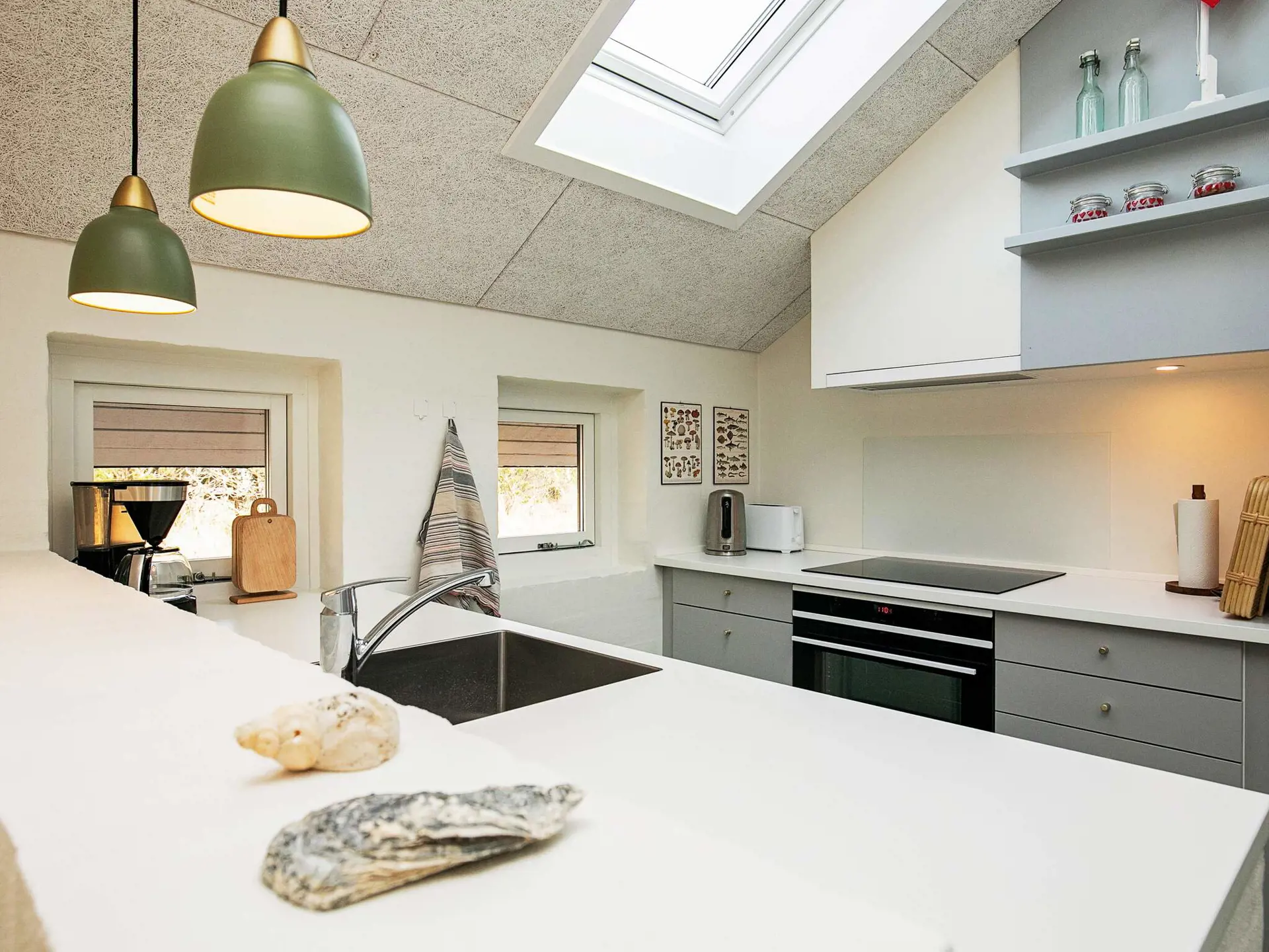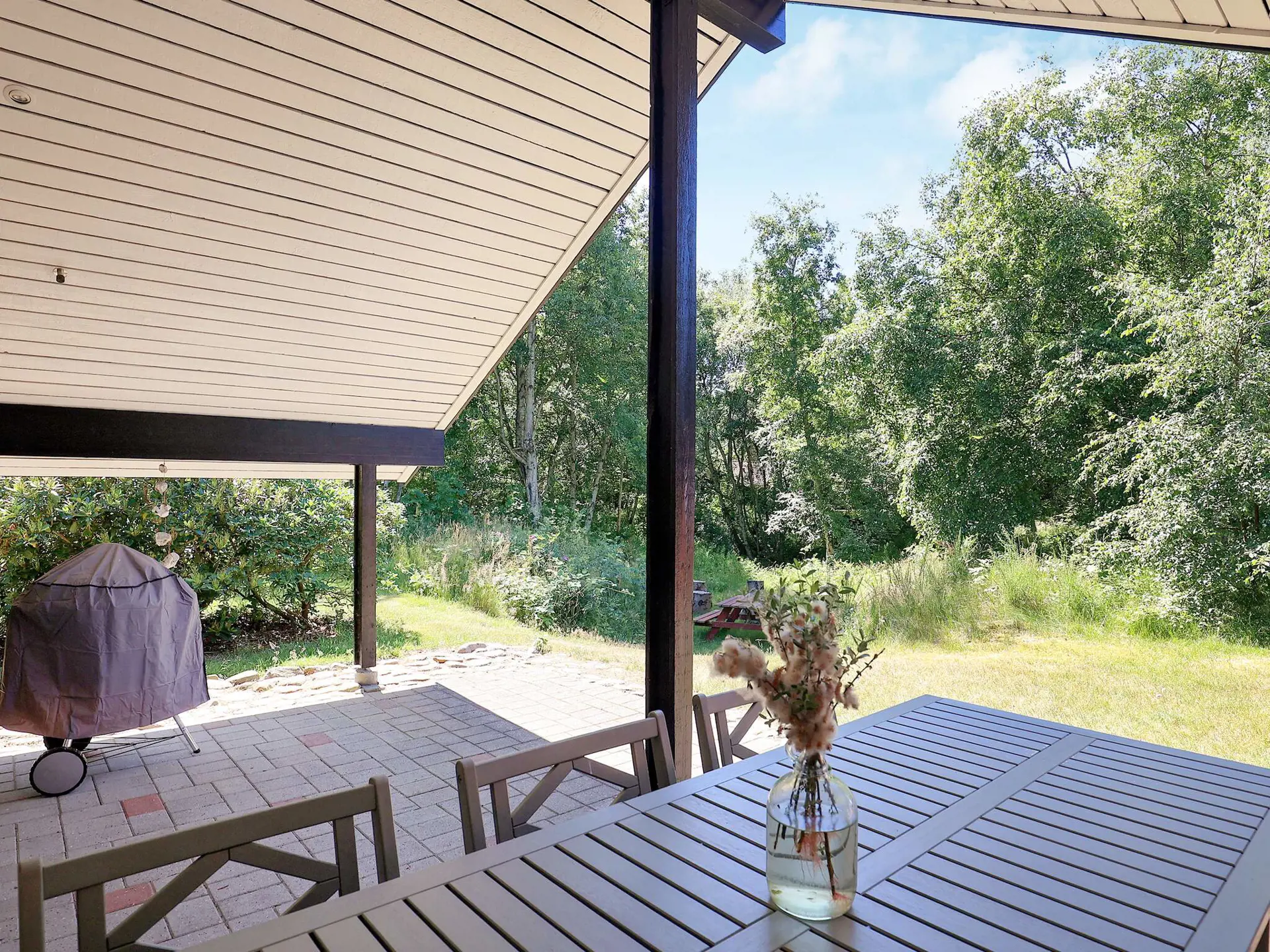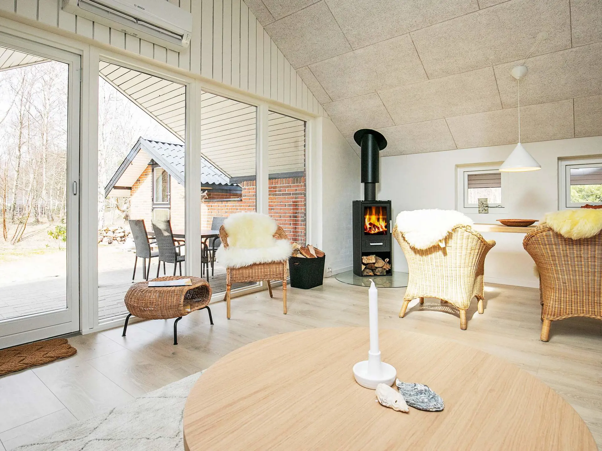 Die offene Zimmerdecke trägt zum luftigen Ambiente im Küchen-/Wohnbereich bei. Für kühlere Tage steht ein Holzofen bereit, zudem gibt es eine klimafreundliche Wärmepumpe im Haus. Vor dem Wohnbereich liegt die teils überdachte, geschützte Terrasse für Sonnentage und Grillabende. Genießen Sie hier den Ausblick in die grüne Umgebung.