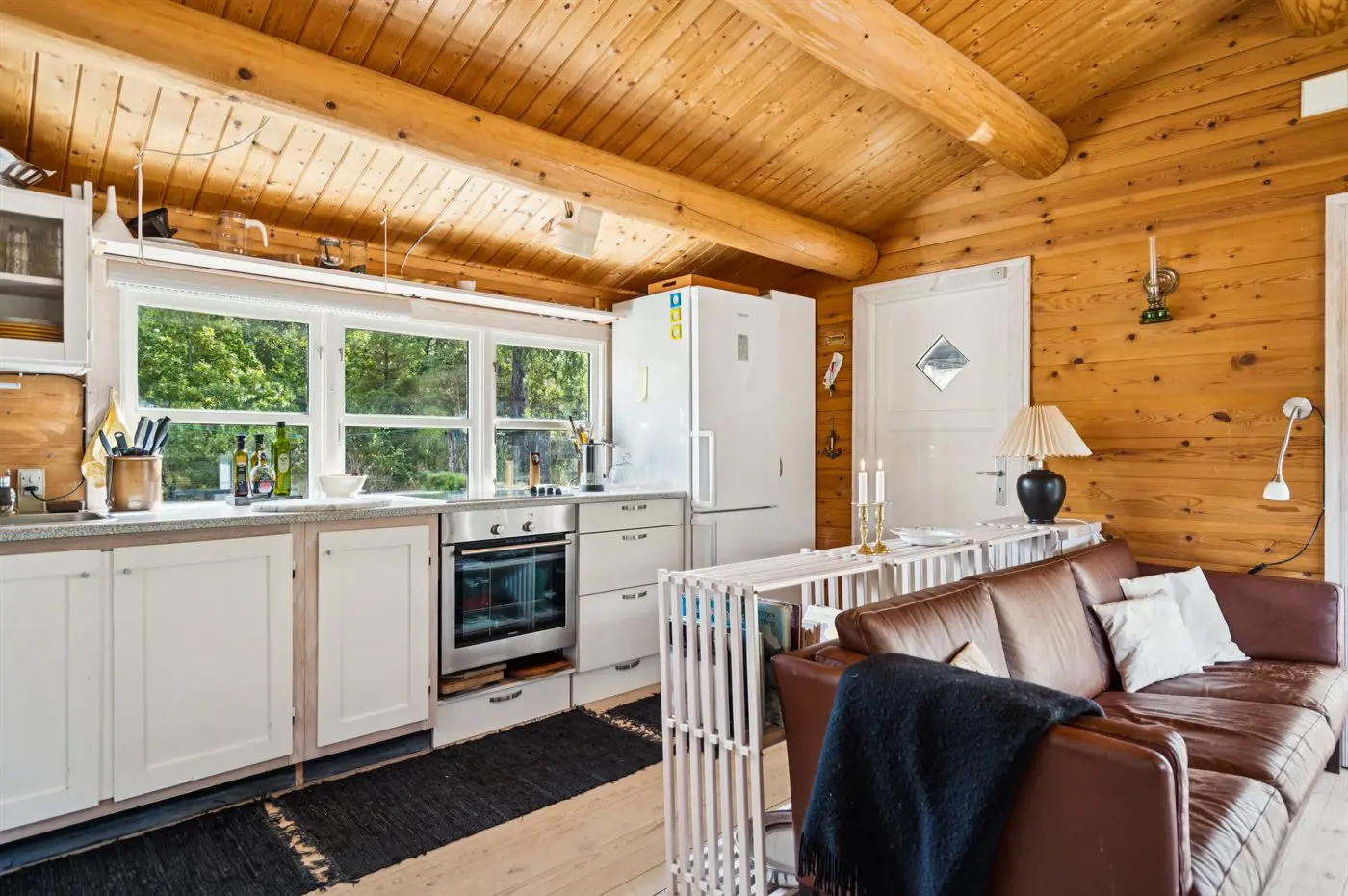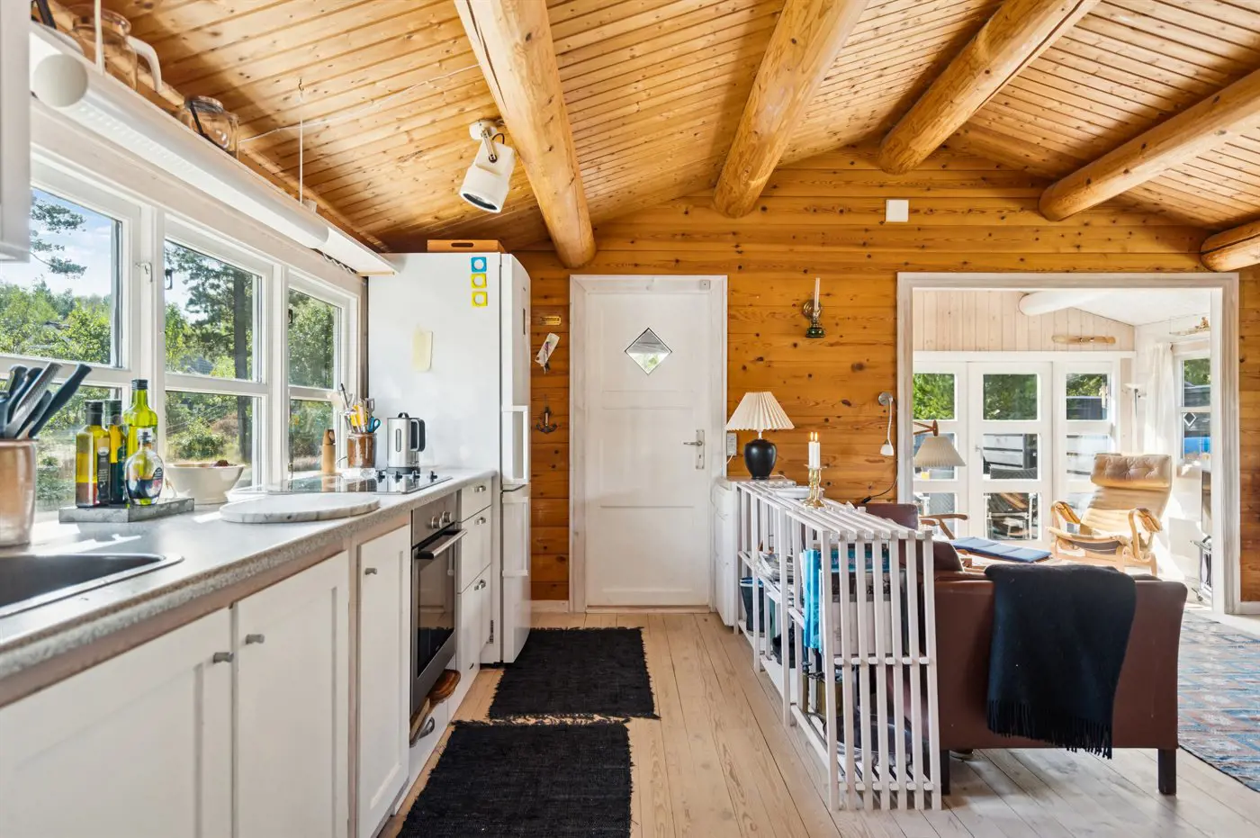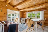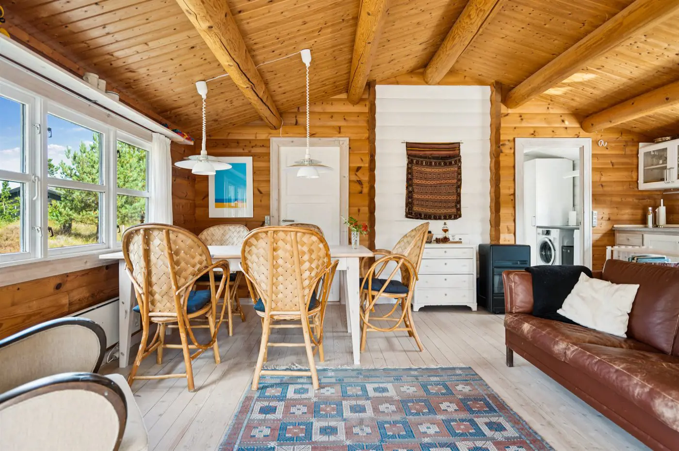 Das Ferienhaus präsentiert sich hell und einladend mit einer guten und funktionalen Einrichtung, die sowohl Raum für Gemeinschaft als auch für Privatsphäre bietet. Wohnbereich und Küche gehen nahtlos ineinander über und bilden den Rahmen für gemeinsame Mahlzeiten, Brettspiele und entspannte Stunden nach einem Tag in der Natur.