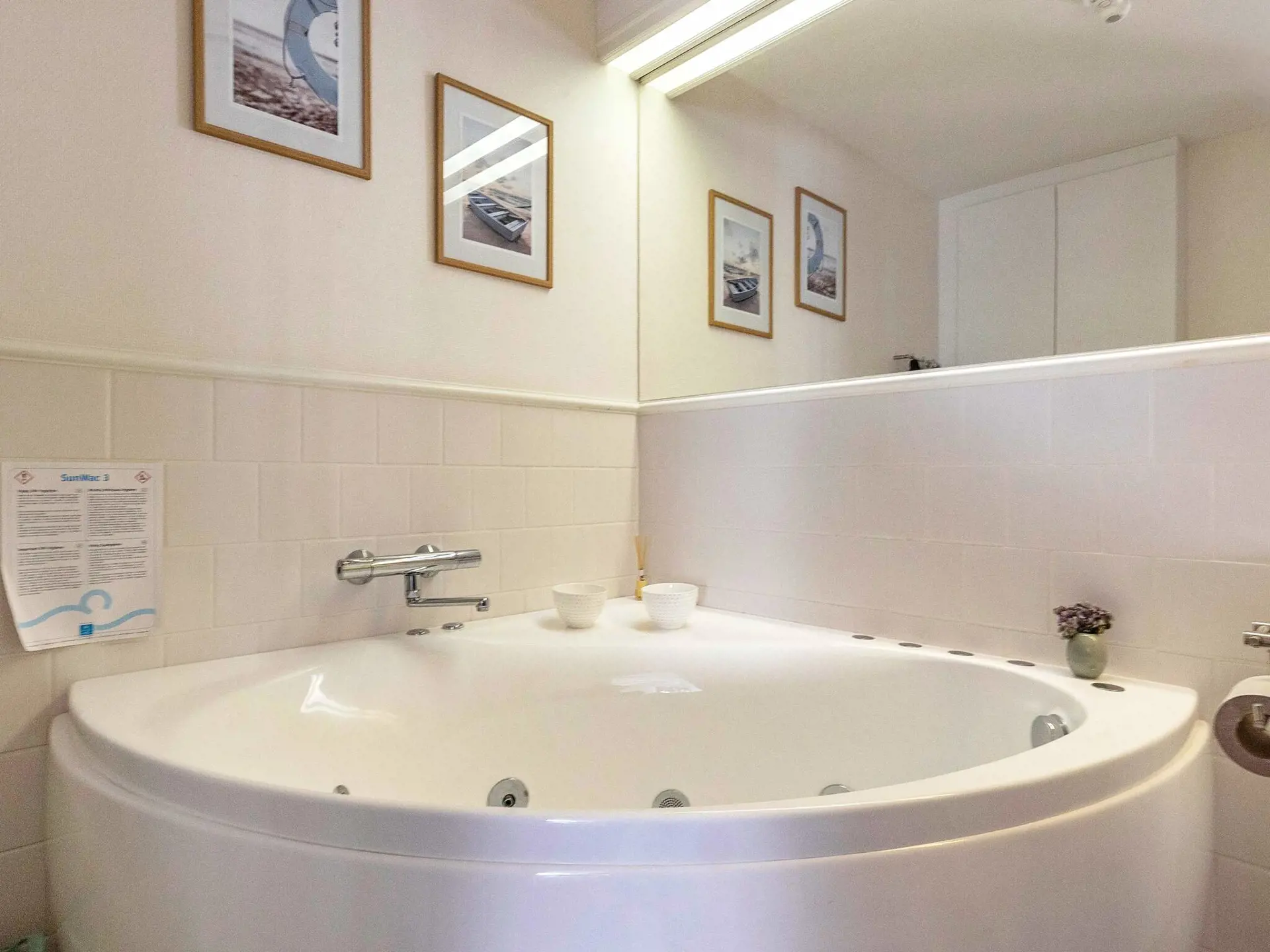 Die Wohnfläche verteilt sich auf zwei Etagen. Die Einrichtung mit modernem Mobiliar ist ansprechend. Im Parterre befinden sich eine Garderobe, ein kombiniertes Wohn-/Esszimmer sowie eine moderne Küche und ein Schlafzimmer. Im Familienzimmer gibt es einen Esstisch, Holzofen, TV via Streaming und eine gemütliche Sitzecke mit zwei Sesseln. In der gesamten Wohnung gibt es freies WLAN. Es besteht die Möglichkeit, eigene TV-Anbieter zu streamen. Badezimmer mit Whirlpool für zwei Personen, ebenerdiger Dusche und Sauna für drei Personen. In der oberen Etage findet man drei Schlafzimmer sowie ein angrenzendes Badezimmer mit Dusche und einen zusätzlichen Aufenthaltsbereich mit TV zum Streamen. Alle Zimmer bieten schönen Ausblick in die Umgebung.