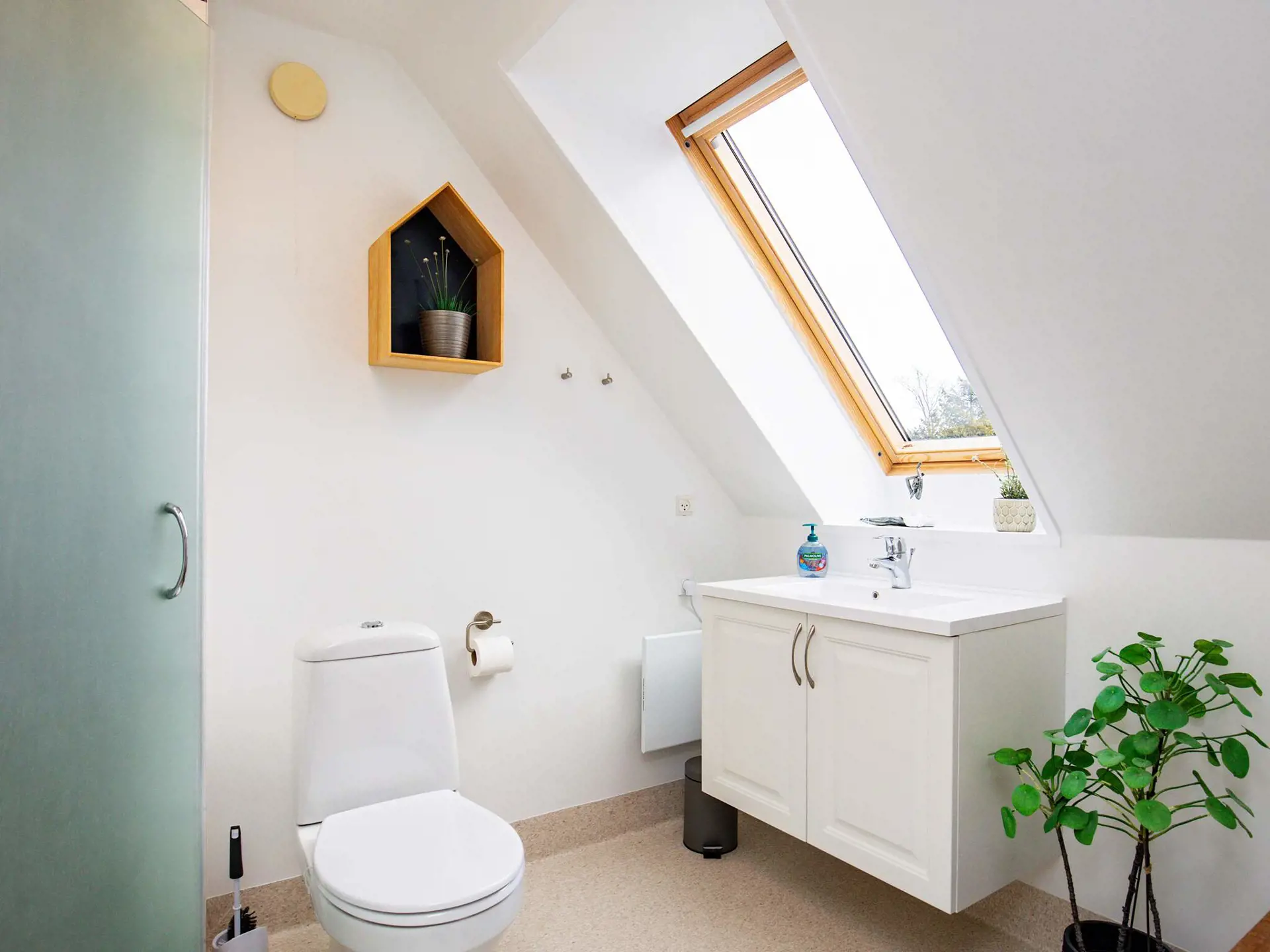 Oben im Dachgeschoss findet man einen hellen Aufenthaltsbereich mit Radio und TV, ein Schlafzimmer mit Einzelbetten und das zweite Bad des Hauses. Vom 11 m² großen Balkon aus haben Sie eine sehr schöne Aussicht. Die großen Fenster lassen zudem viel Tageslicht in den Innenraum.
