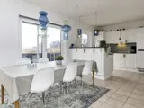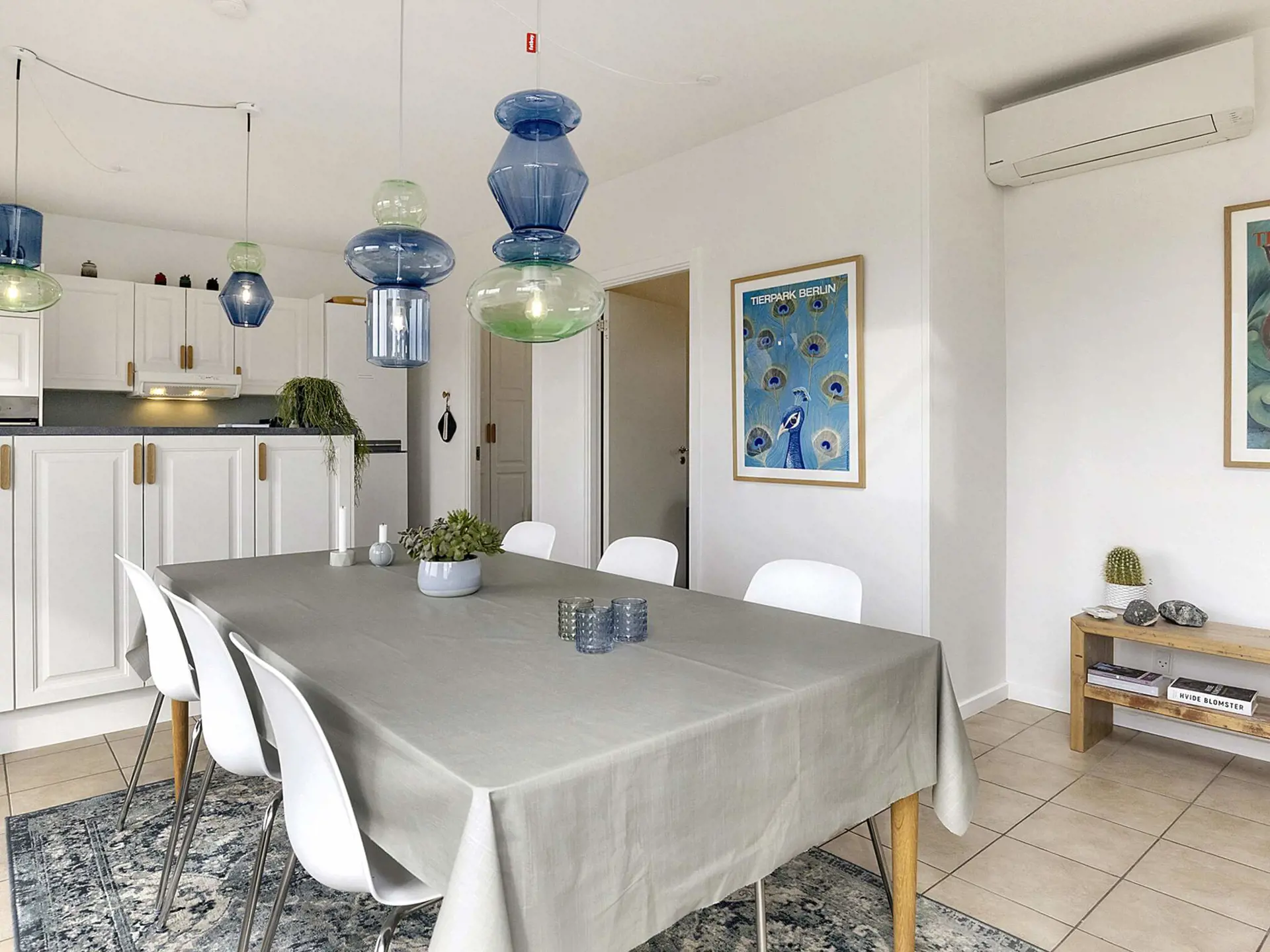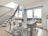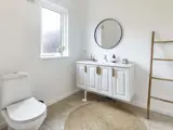 Im Erdgeschoss finden Sie zwei Schlafzimmer, ein Badezimmer, einen Hauswirtschaftsraum und eine große Wohnküche, die den Rahmen für alle Aktivitäten der Familie bildet. Vom Familienzimmer aus haben Sie direkten Zugang zur großzügigen Terrassenfläche, von der Sie den Blick auf einen kleinen See genießen können. Die Küche ist gut ausgestattet, u.a. mit Cerankochfeld, Heißluftofen und Geschirrspüler.