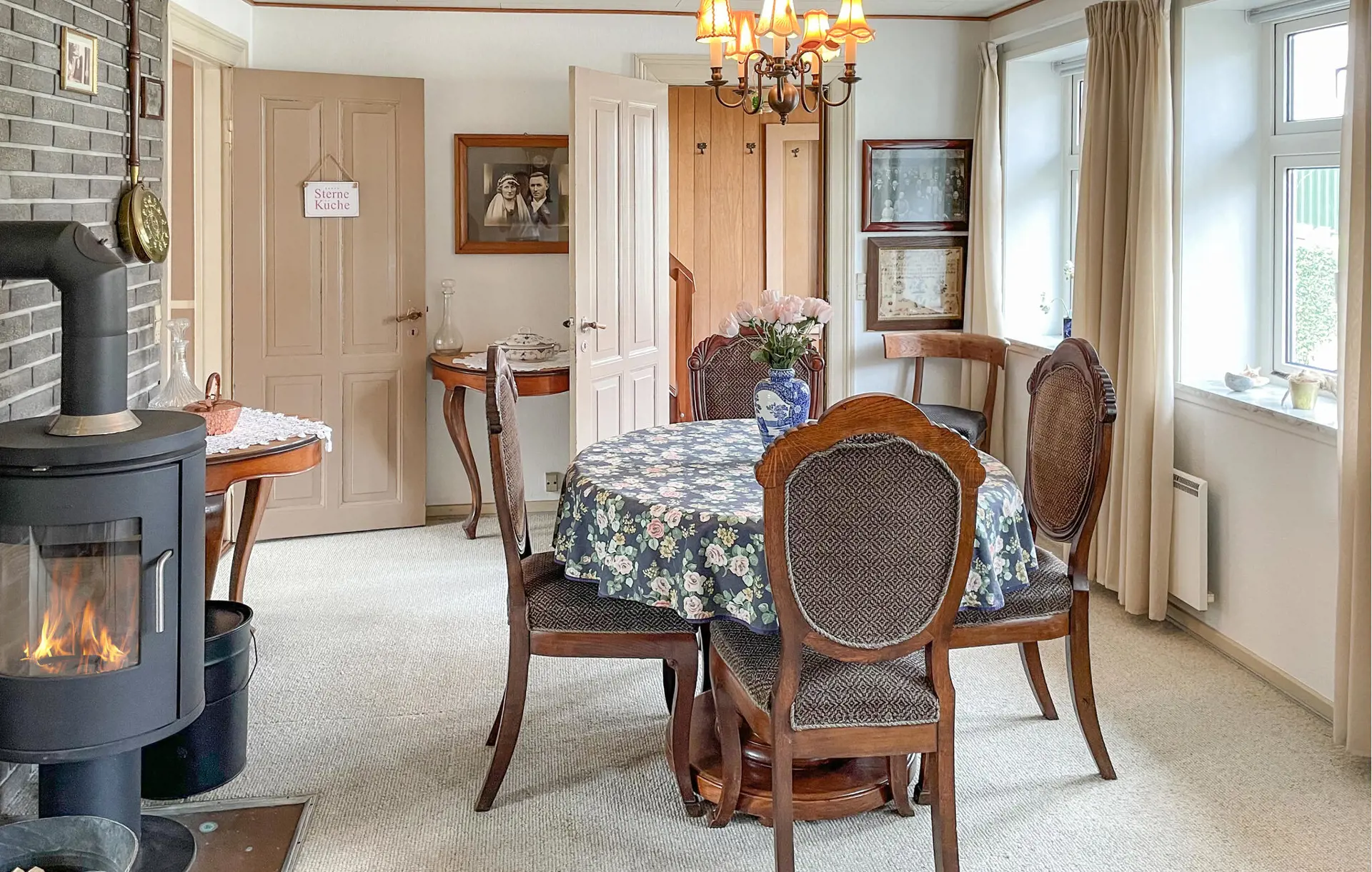 In diesem gemütlich eingerichteten Haus erleben Sie eine Atmosphäre, die zu Erholung in nostalgischer Umgebung einlädt. Am Esstisch lässt es sich wunderbar bei einem ausgedehnten Frühstück zusammensitzen oder einen Spieleabend verbringen. Die bequemen Sessel laden dazu ein, ein gutes Buch zu lesen oder einfach die Ruhe auf sich wirken zu lassen. Und wenn es kühler ist, verbringen Sie entspannte Stunden am Kaminofen und genießen die wohlige Wärme.