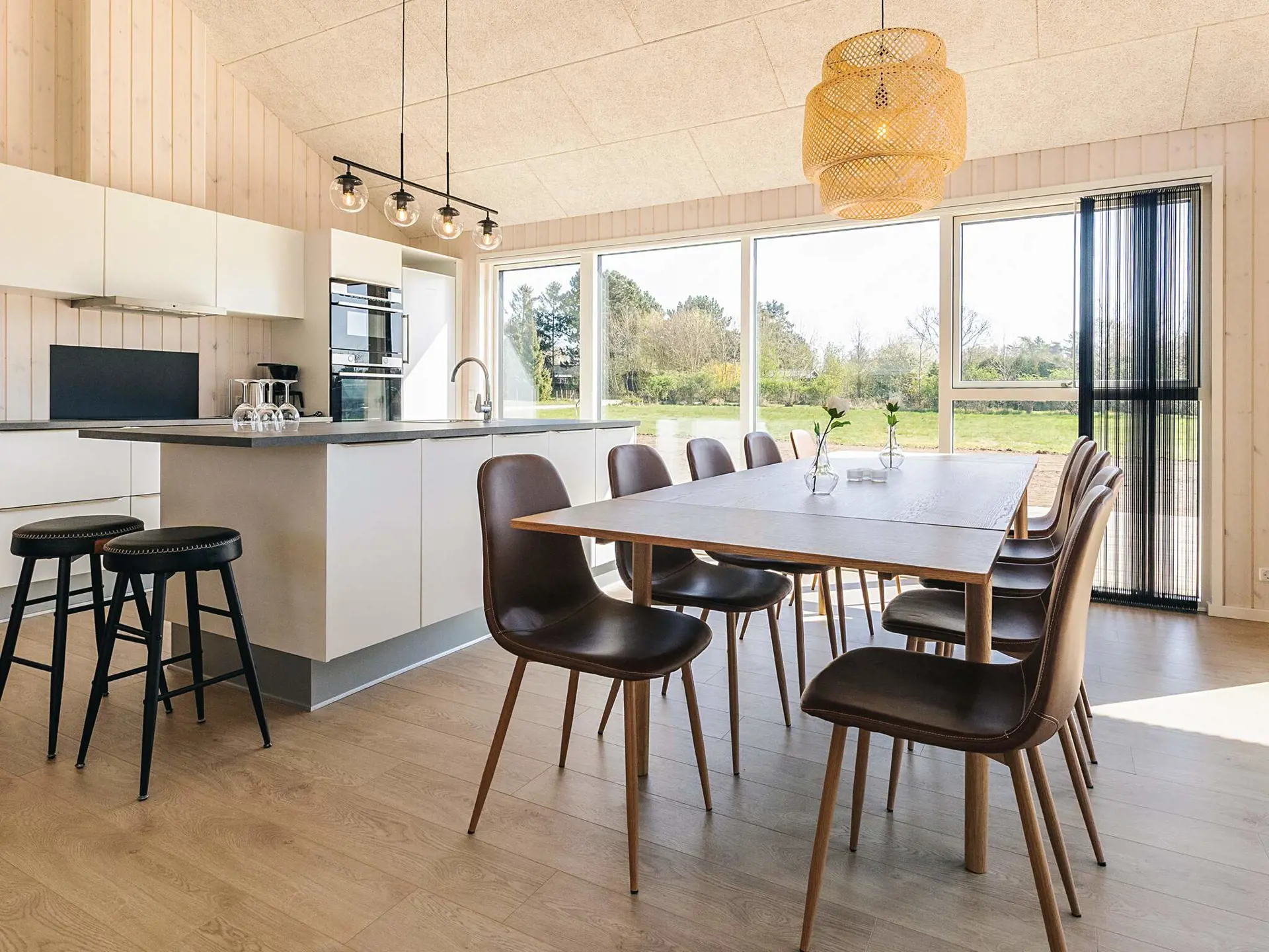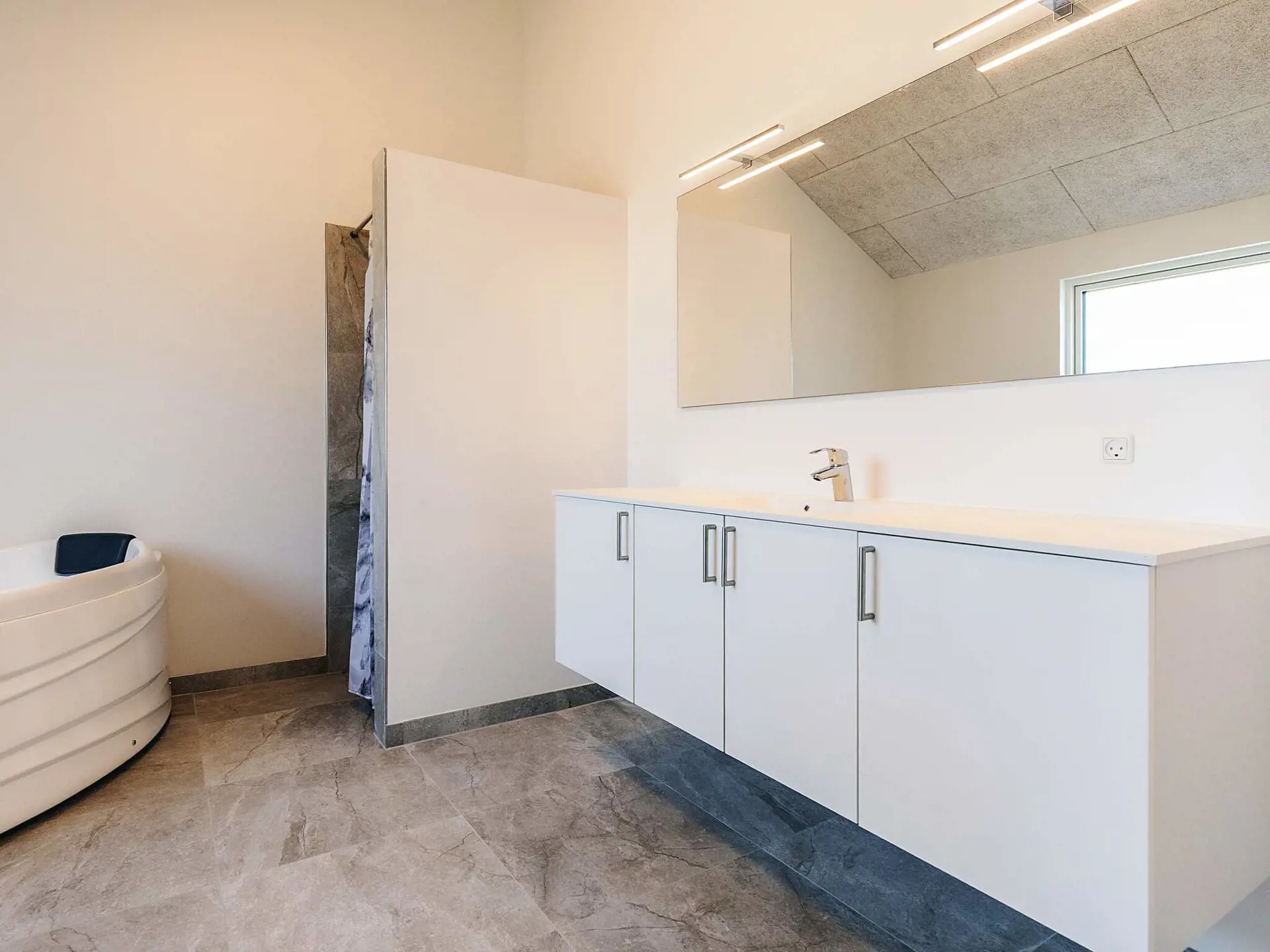 Dieses geräumige Ferienhaus bietet mit vier Doppelbetten und dazu ein Loft mit einem zusätzlichen Doppelbett. Eine komfortable und gut ausgestattete Unterkunft für Gruppen mit bis zu 10 Personen oder Familien. Damit sich alle Gäste wohlfühlen können, stehen zwei moderne Badezimmer mit Dusche, Waschbecken und Toilette zur Verfügung. Der Wohnbereich ist gemütlich und einladend eingerichtet, u.a. stehen Billardtisch und Tischfußball für Unterhaltung bereit. Beheizt wird das Ferienhaus teils mit Elektroheizung, teils mit einer klimafreundlichen Luft/Luft-Wärmepumpe, die ganzjährig für behagliche Innentemperatur sorgt.