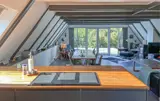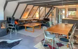 Ihr Ferienhaus besticht durch seine besondere Architektur mit spitzem Giebeldach und hellem, offenem Wohnkonzept. Betreten Sie den großzügigen Wohnraum und lassen Sie sich vom modernen skandinavischen Stil begeistern. Die Kombination aus hellen Flächen, dunklen Holzelementen und großen Fensterfronten schafft ein luftiges und zugleich gemütliches Ambiente. Machen Sie es sich auf der bequemen Couch vor dem Kaminofen gemütlich oder genießen Sie gemeinsame Mahlzeiten am langen Esstisch. Die offene Küche mit eleganten Fronten, Holzarbeitsflächen und moderner Ausstattung lädt zum gemeinsamen Kochen und Genießen ein.