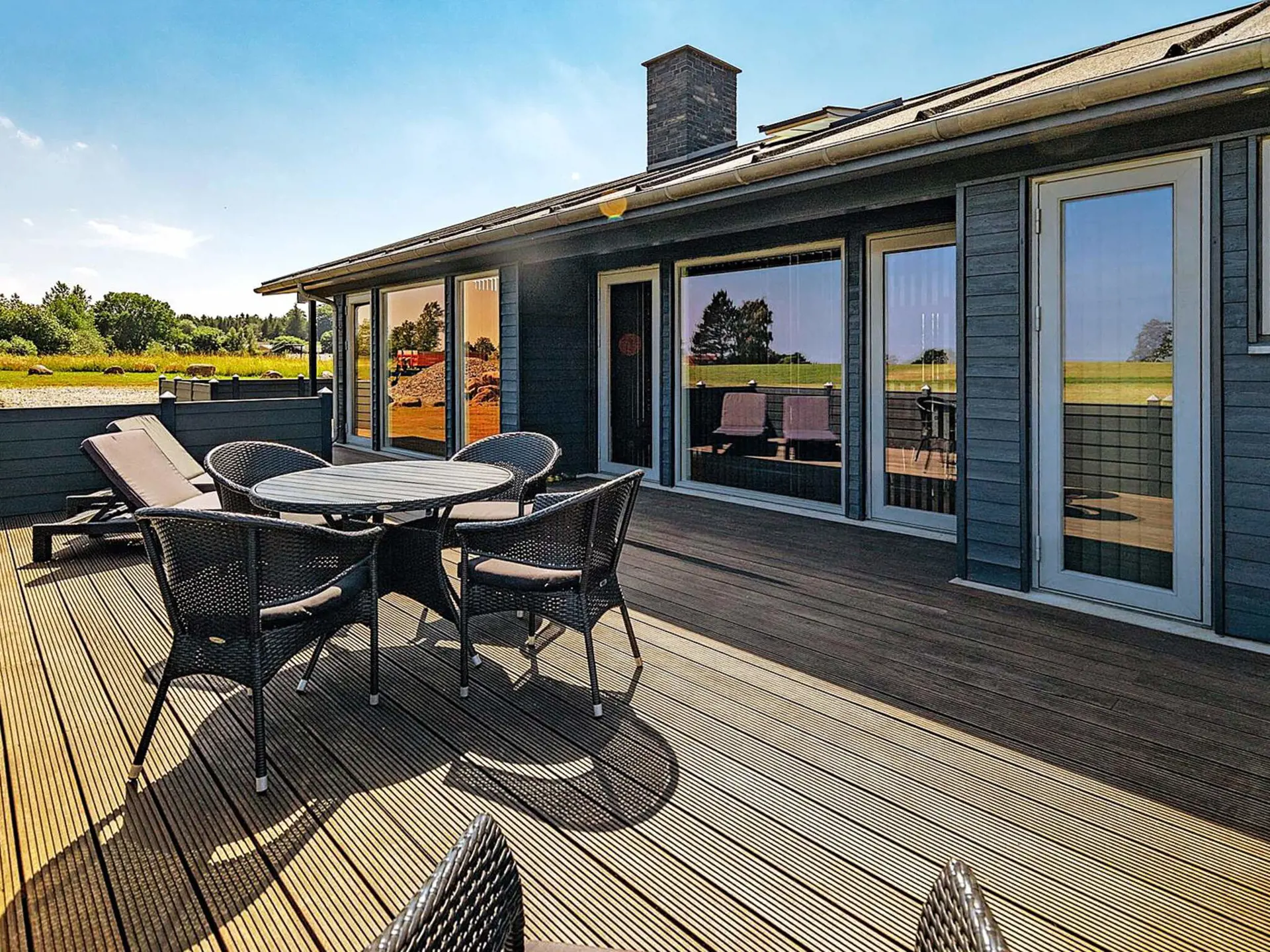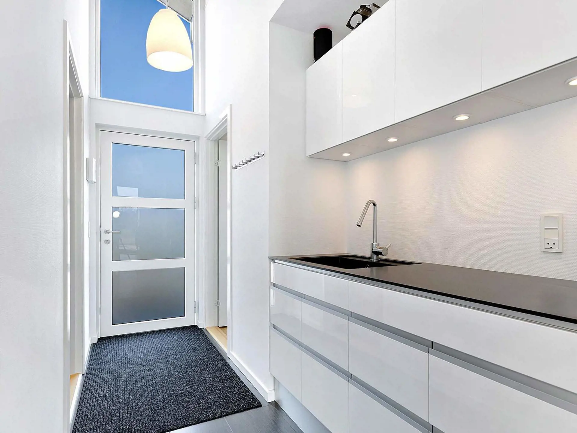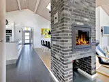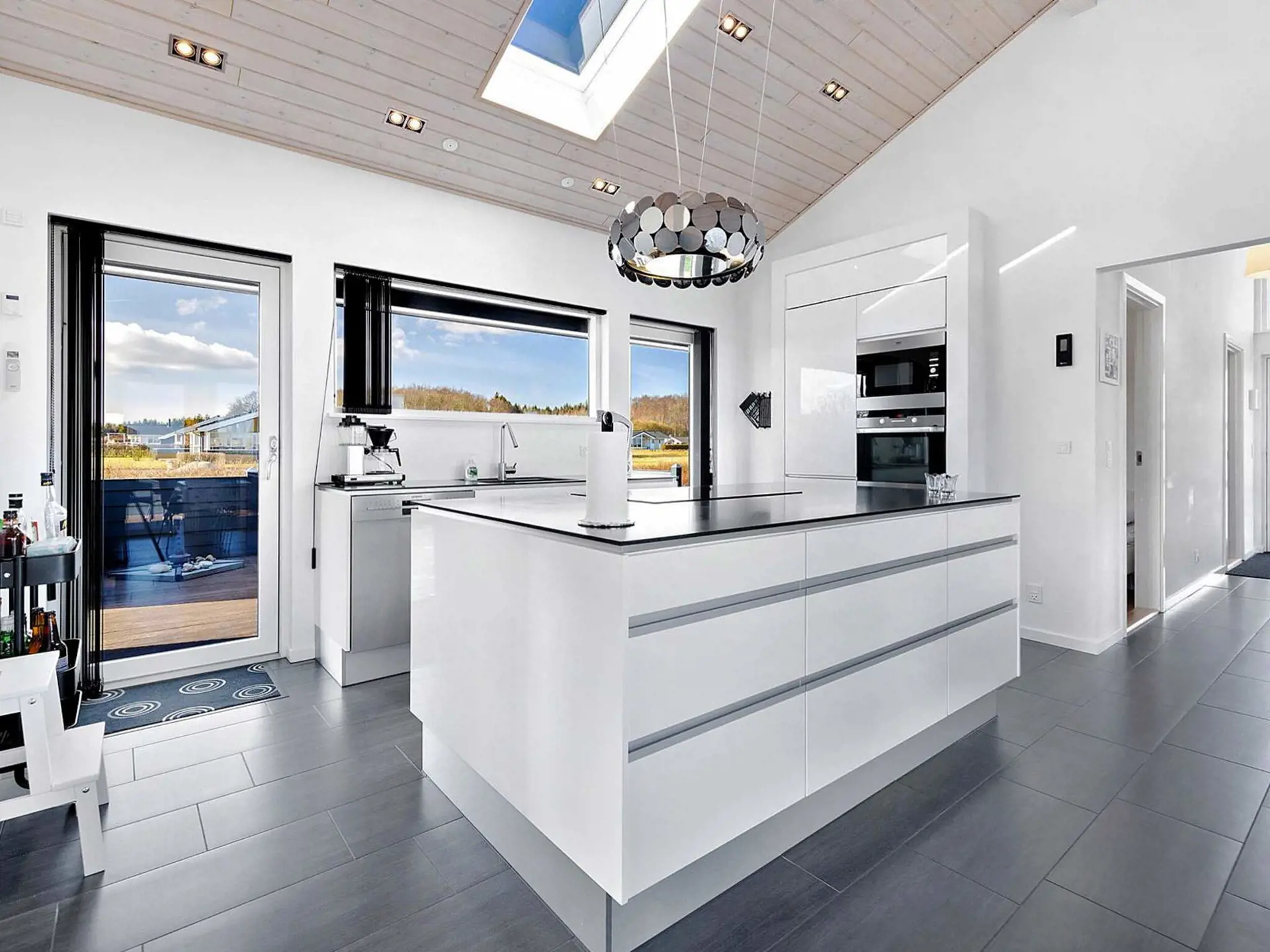 Vom Eingangsbereich aus gelangt man in ein Badezimmer mit Whirlpool und Sauna sowie in ein Schlafzimmer. Von hier aus gelangt man in den großzügigen, offenen Küchen- und Wohnbereich, der ideal für Familienfeiern ist. Der Raum verfügt über eine offene Decke bis zum First, Oberlichter, eine großzügige Küche mit Kochinsel und Zugang zu den nach Osten und Westen ausgerichteten Terrassen. Ein großer Dachboden (Hems) bietet zusätzlichen Platz. Die Fußbodenheizung im gesamten Haus sorgt ganzjährig für Komfort. Das Haus verfügt über vier gut eingerichtete Schlafzimmer und zwei Badezimmer, eines davon mit Waschmaschine und Trockner. Zur Unterhaltung gehört eine PlayStation 2 mit verschiedenen Spielen. Eine moderne Luft-Luft-Wärmepumpe mit Kühlfunktion sorgt für ein angenehmes Raumklima.