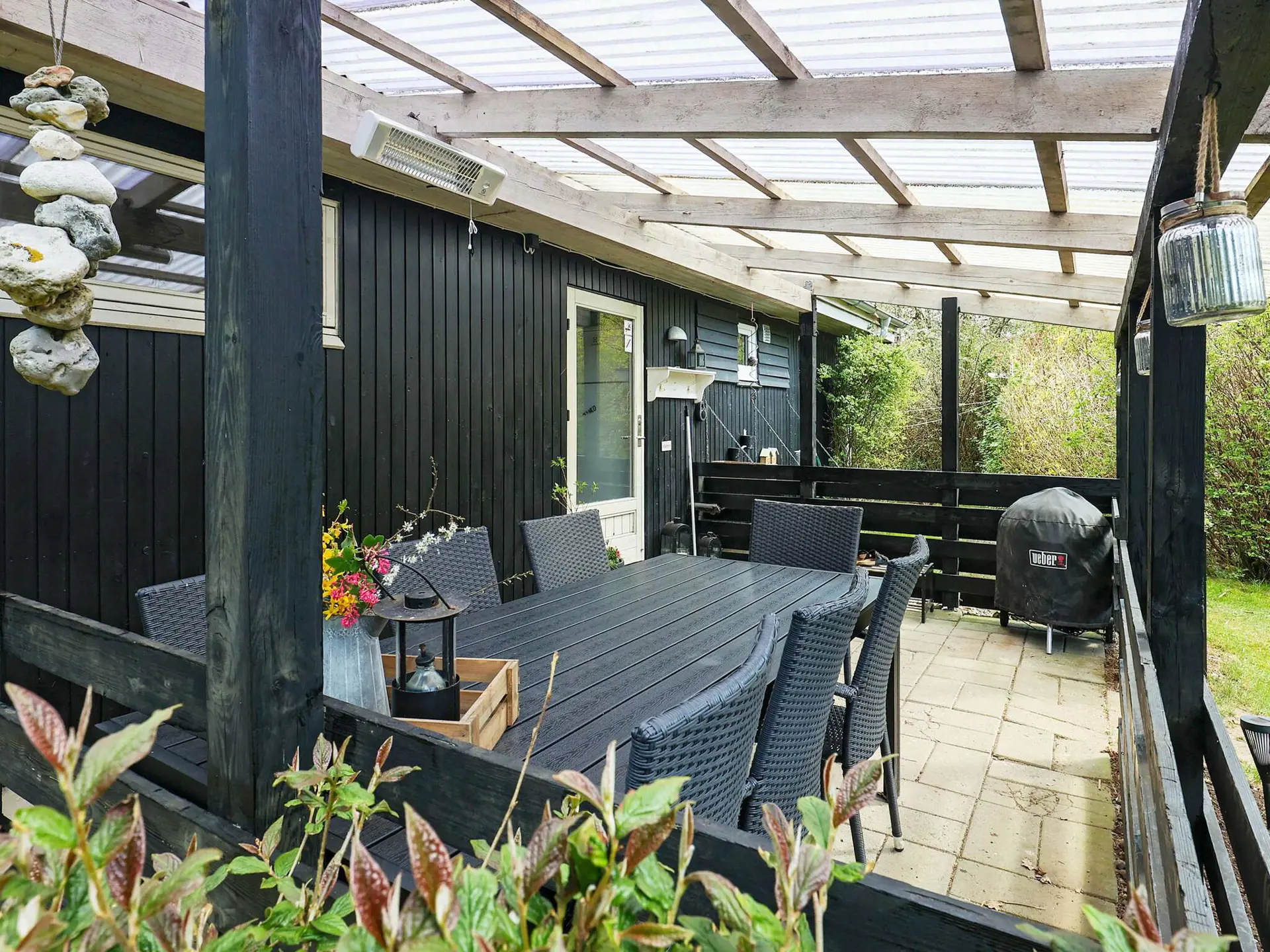 Vom Wohnbereich aus hat man direkten Zugang zur teils überdachten Terrassenfläche des Hauses. Auf dem Grundstück stehen zwei separate Annexe mit Licht und elektrischer Heizung bereit, die jedoch nicht isoliert und nur für die Sommermonate genutzt werden können. Der eine Annex wird auch als Stauraum für verschiedene Outdoor-Aktivitäten genutzt. Auf dem Grundstück gibt es u.a. ein Gartentrampolin und eine Feuerstelle (Nutzung nur auf eigenes Risiko).