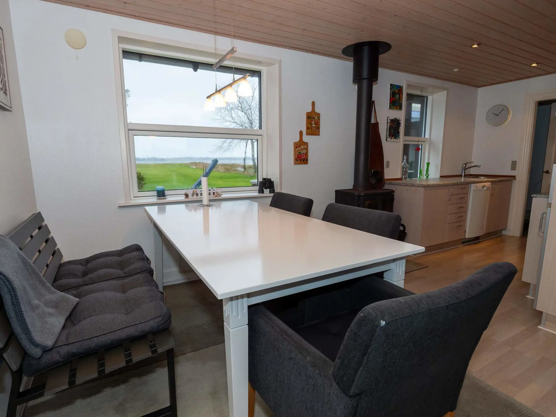 Das helle und einladende Wohnzimmer mit Kaminofen sorgt an kühlen Tagen und Abenden für eine behagliche Atmosphäre. Hier finden Sie viel Platz zum Verweilen mit Familie und Freunden. Insgesamt stehen Ihnen 3 Fernseher zur Verfügung, auf denen Sie Ihre eigenen Streaming-Dienste nutzen können. Es gibt keine TV-Kanäle.