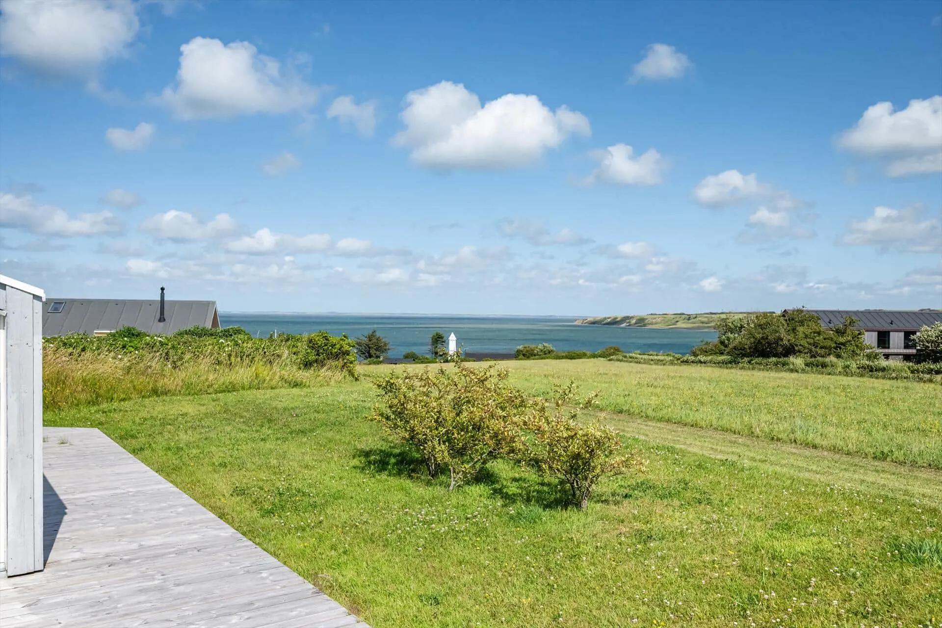Wenn man in einem Ferienhaus wie diesem wohnt, fällt es leicht, sich vom Leben draußen verlocken zu lassen. Die schöne Holzterrasse ist nach Südosten ausgerichtet, sodass du die Sonne vom Morgen bis in den späten Nachmittag genießen kannst. Die Terrasse zieht sich um das Haus und bietet sowohl windgeschützte als auch schattige Plätze – perfekt für ein Frühstück im Freien oder ein sommerliches Abendessen vom Grill mit Blick in die Natur. Der Garten rund ums Haus ist grün und ruhig, ideal zum Spielen und Toben – für Kinder ebenso wie für den Hund. Während die Kleinen sich austoben, kannst du dich entspannt zurücklehnen und den Ausblick auf den Fjord genießen. Das ist genau die Art von Außenleben, die neue Energie schenkt und inneren Frieden bringt.