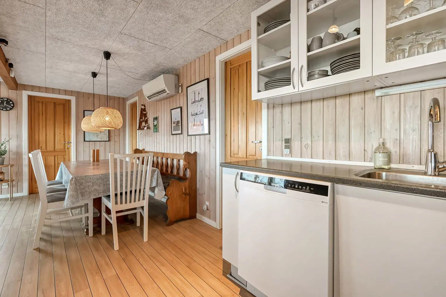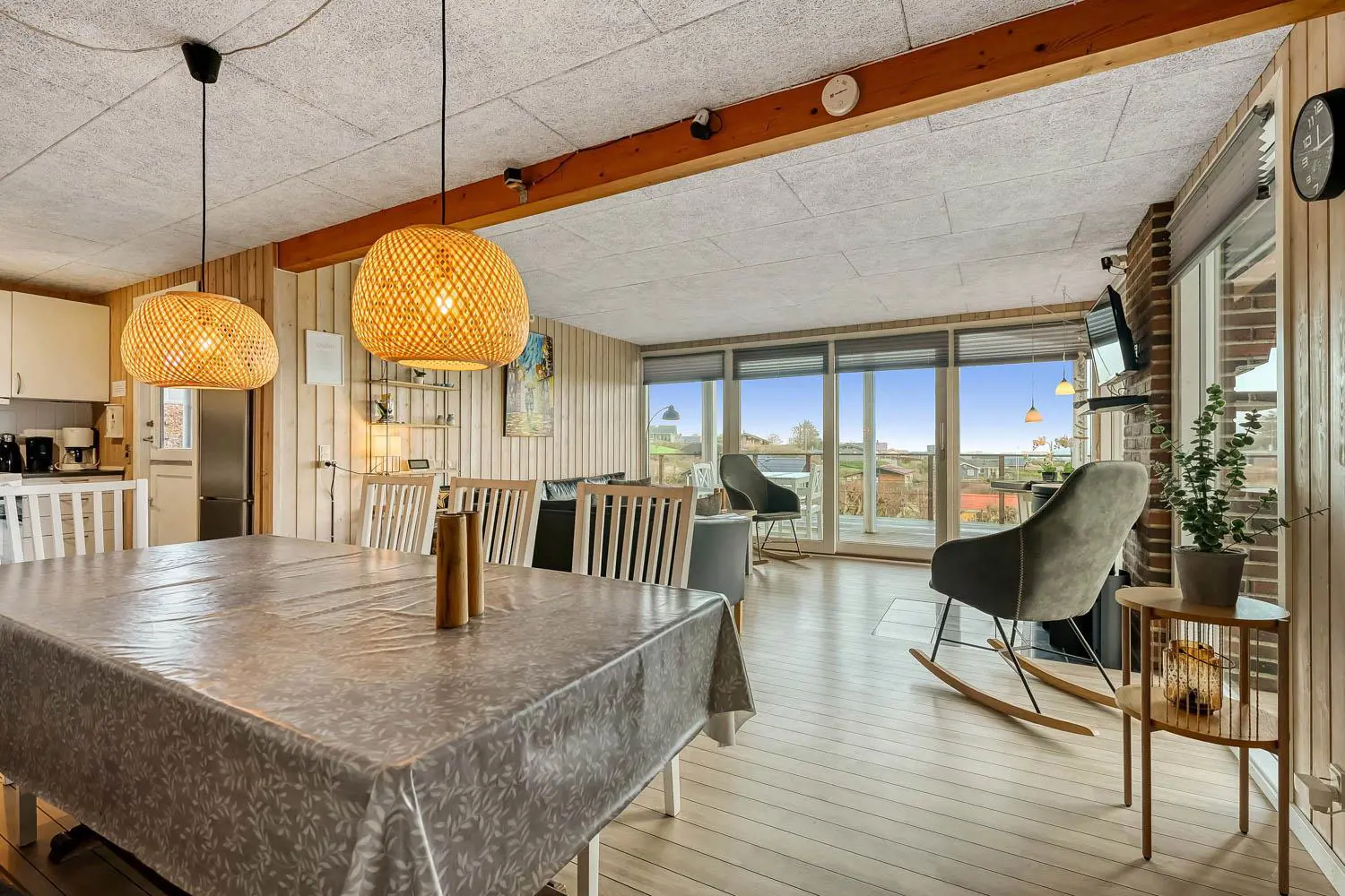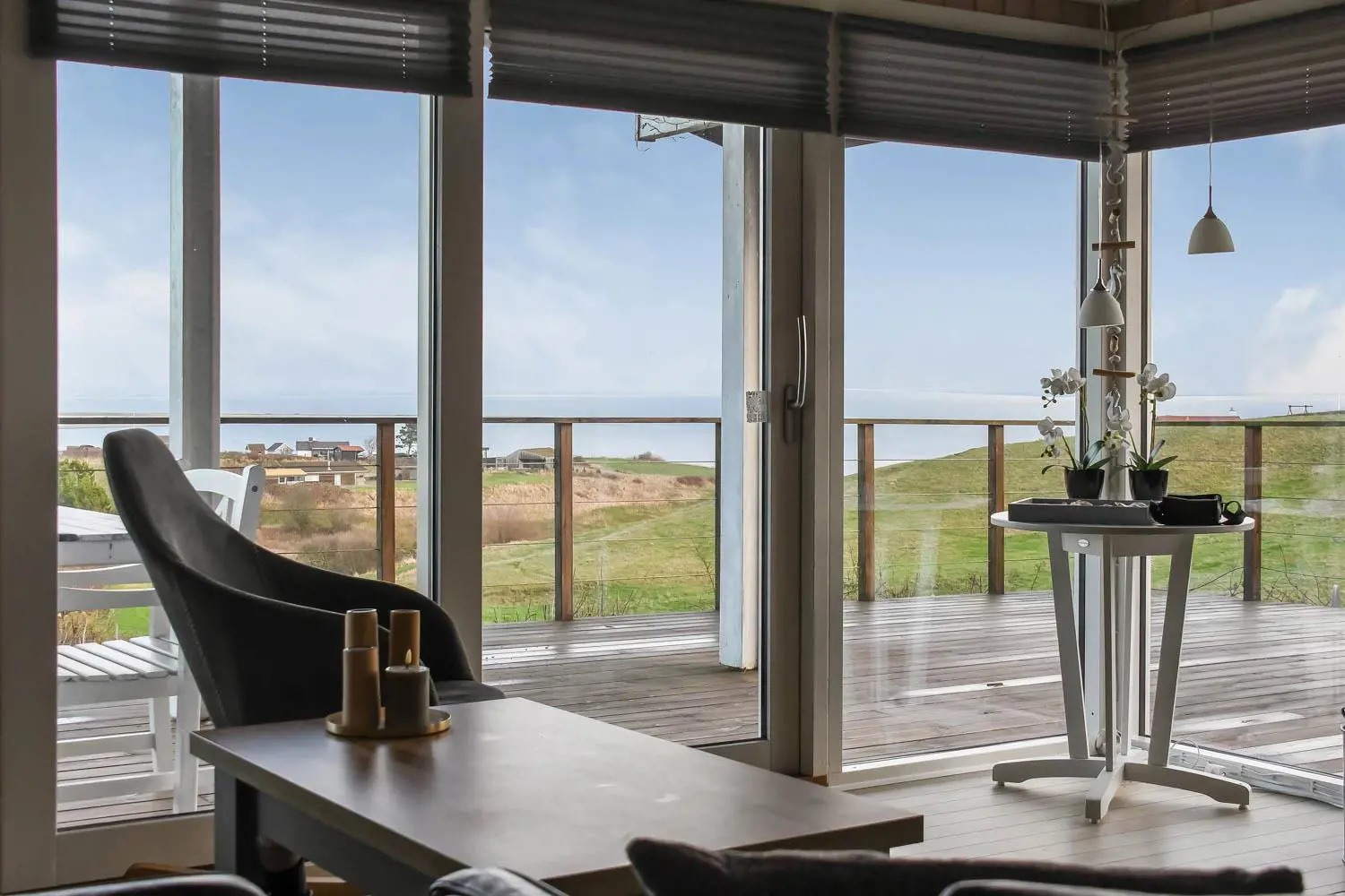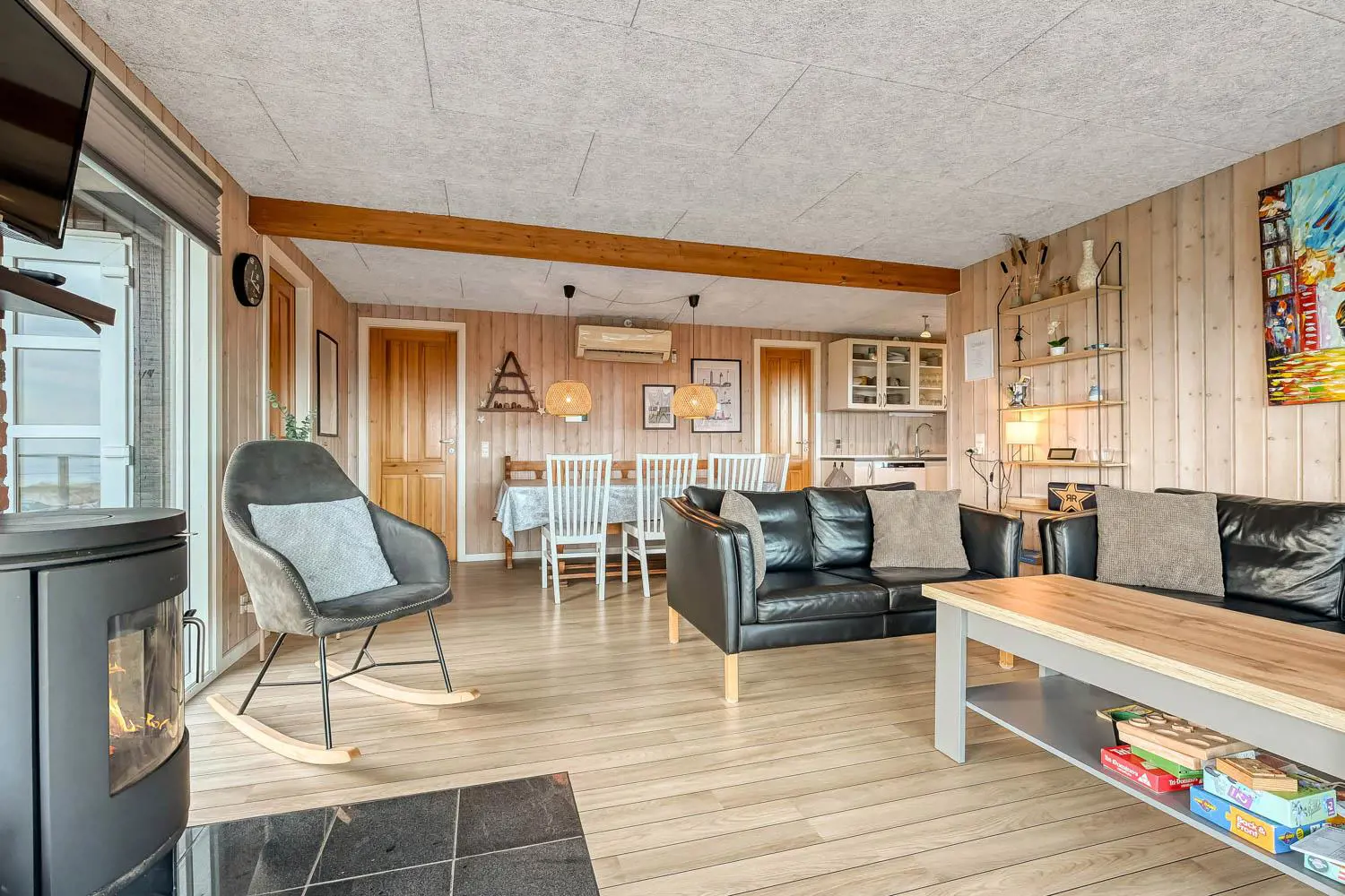 Im Wohnbereich befinden sich komfortable Ledermöbel, Esstisch, Radio, TV mit dänischen und deutschen Programmen, Chromecast sowie die Möglichkeit, eigene Streaming-Dienste zu nutzen.
