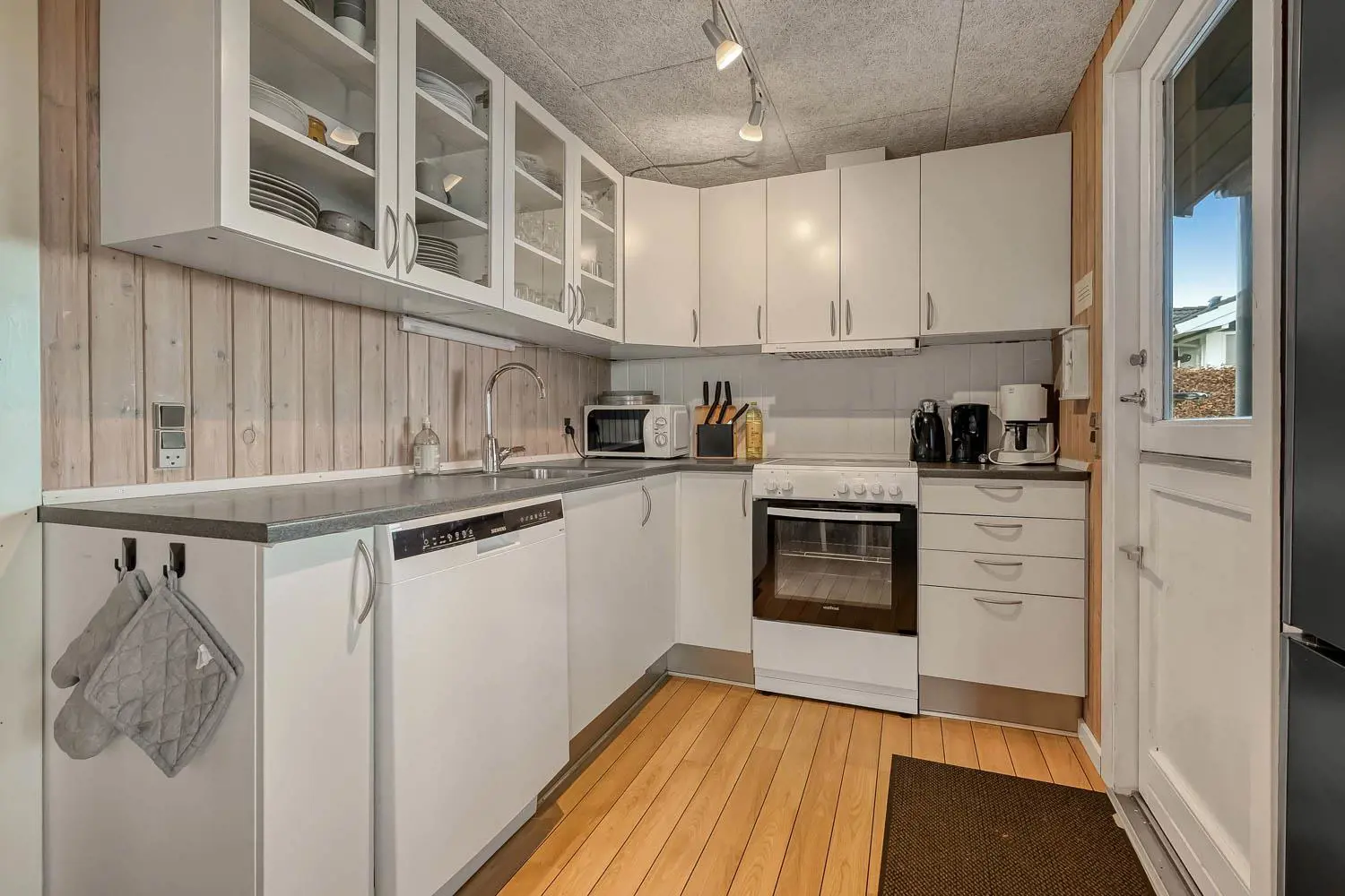 Die Küchenecke ist bestens ausgestattet mit komplettem Service und Kochgeschirr sowie Herd mit Glaskeramikkochfeld, Dunstabzugshaube, Mikrowelle, Geschirrspüler, Kühlschrank und Gefrierfach.