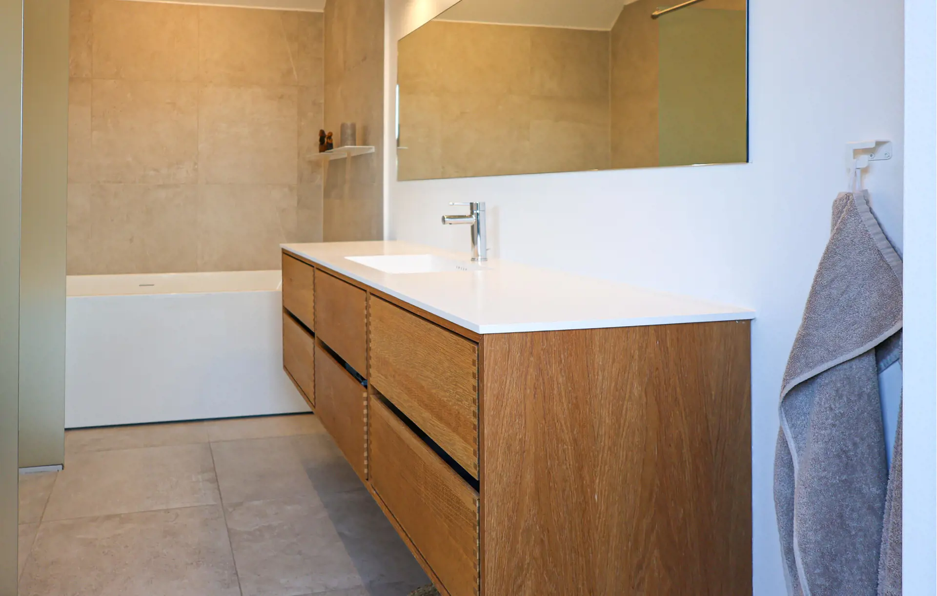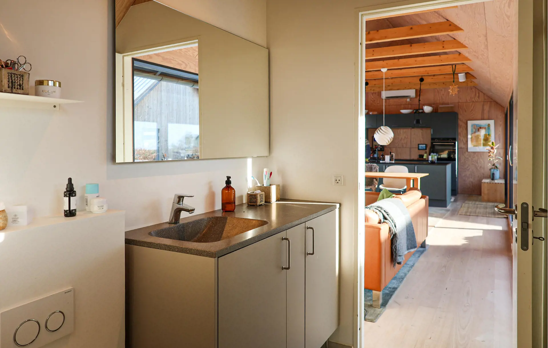 Dieses Haus besticht durch seine moderne Atmosphäre mit viel Holz und großzügigen Fensterfronten, die den Blick ins Grüne freigeben. Plaudern Sie gemütlich bei einer Tasse Kaffee im lichtdurchfluteten Wohnbereich und genießen Sie dabei die schöne Aussicht. Verbringen Sie entspannte Fernsehabende auf dem Sofa oder kochen Sie gemeinsam in der modernen Küche und lassen Sie den Tag in geselliger Runde ausklingen.