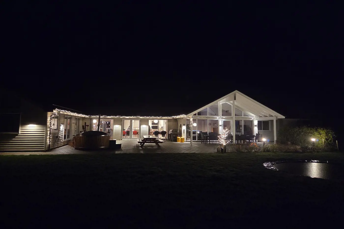 Der Aufenthaltsbereich ist mit Sofagruppe, Küche und dem langen Tisch der natürliche Mittelpunkt des Hauses und lädt zum gemeinsamen Essen und zum Planen der täglichen Unternehmungen ein. Die geräumige Küche ist selbstverständlich mit zwei Geschirrspülmaschinen, zwei Backöfen, zwei Kühlschränken und zwei Waschbecken ausgestattet, sodass hier für alle gekocht werden kann. Die große und teilweise überdachte Terrasse mit Infrarotheizung kann zu allen Jahreszeiten genutzt werden und bietet mit einem Weber-Kugelgrill und einem Weber-Gasgrill optimale Möglichkeiten, das Abendessen zuzubereiten.