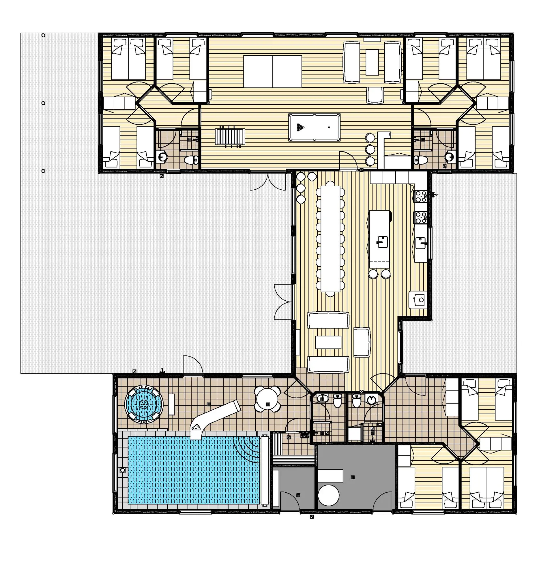 Dieses geräumige Luxusferienhaus am Hostrup Strand am Limfjord bietet Platz für 24 Gäste und eine Vielzahl von Freizeitaktivitäten. Es liegt in einer ruhigen Gegend, in der man angeln, am kinderfreundlichen Strand entspannen oder lokale Attraktionen wie die Burg Spøttrup und das Vogelschutzgebiet Geddal Enge besuchen kann. Das Haus verfügt über drei Schlafbereiche mit jeweils drei Doppelzimmern und einem Badezimmer, ideal für mehrere Familien. Zusätzliche Schlafplätze gibt es auf dem ausgebauten Dachboden. Das Ferienhaus bietet einen großen Innenpool mit römischer Treppe, Wasserrutsche und Gegenstromanlage, einen Whirlpool für sechs Personen und eine Sauna. Für Unterhaltung sorgt ein Aktivitätsraum mit Billardtisch, Tischtennistisch, Dart, Tischfußball und PlayStation 4, sowie eine Hausbar. Der zentrale Wohn-/Essbereich ist mit einem langen Esstisch und einer gemütlichen Sofaecke ausgestattet. Die Küche bietet alles, was man für die Zubereitung von Mahlzeiten für eine große Gruppe benötigt, einschließlich doppelter Geschirrspüler, Herd und Spüle. An kalten Tagen sorgt ein Kaminofen für zusätzliche Wärme. Im Außenbereich gibt es eine teilweise überdachte Terrasse mit Gartenmöbeln und Grills. Für Kinder stehen im Garten eine Schaukel, eine Sandkiste und ein Trampolin bereit.