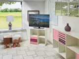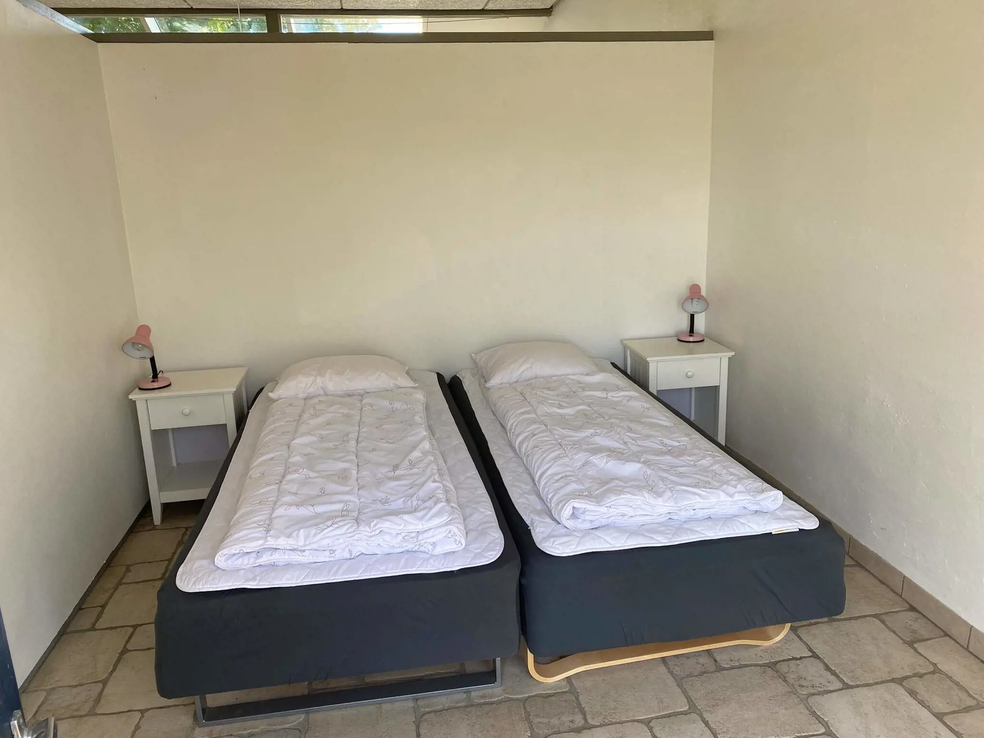 Offene Wohnküche mit Essbereich, Sofa, Fernseher und Billardtisch. Vom Wohnbereich aus hat man Zugang zu beiden Schlafzimmern; eines davon mit einem Doppelbett (kann zu zwei Einzelbetten auseinander geschoben werden), das andere mit zwei Einzelbetten. Vom Wohnzimmer und einem Schlafzimmer gibt es Zugang zu einer Orangerie mit verschiedenen Pflanzen an der Südseite des Gebäudes. Im Eingangsbereich steht zudem ein Etagenbett mit zwei Schlafplätzen für Kinder, wenn diese Bettdecken und Kissen mitbringen.