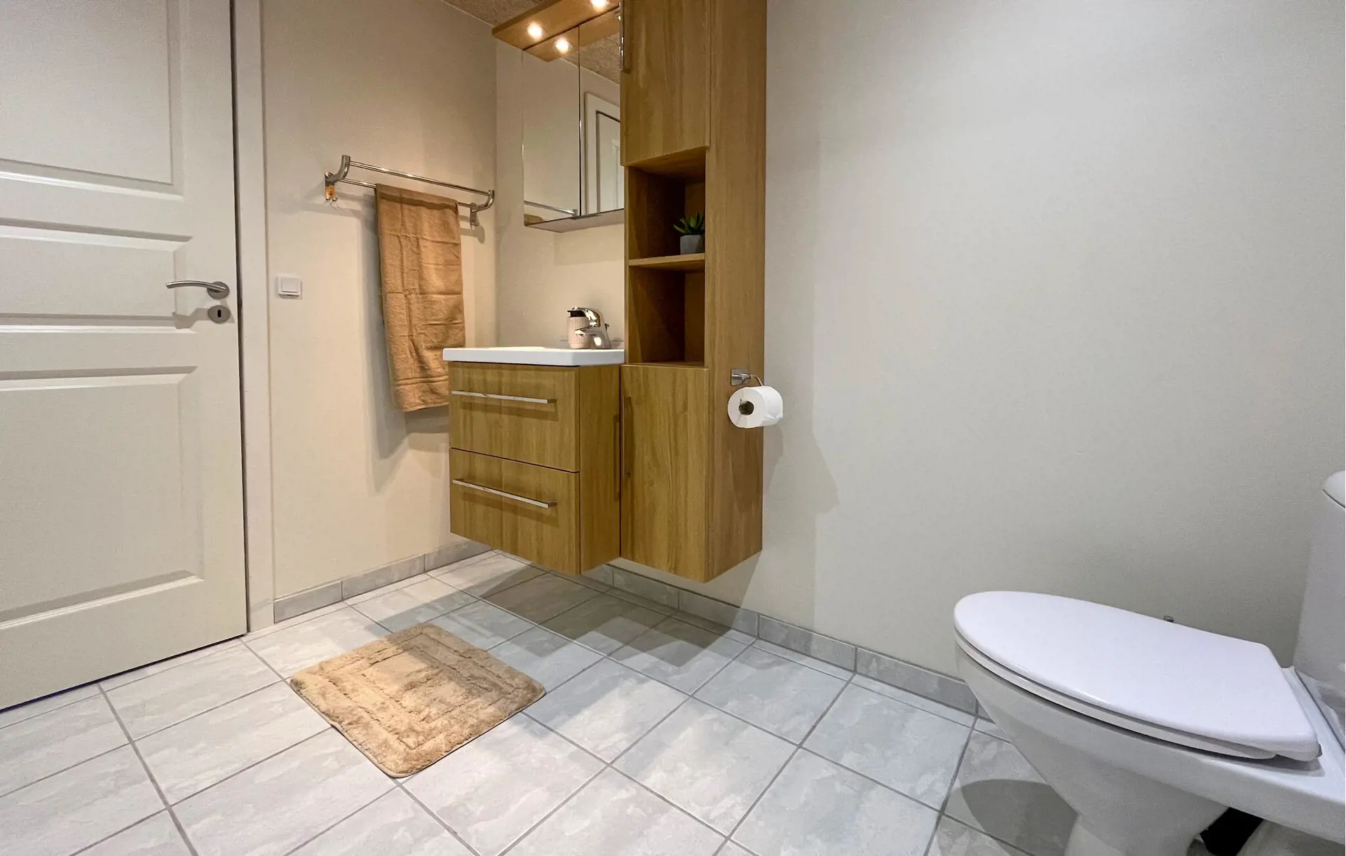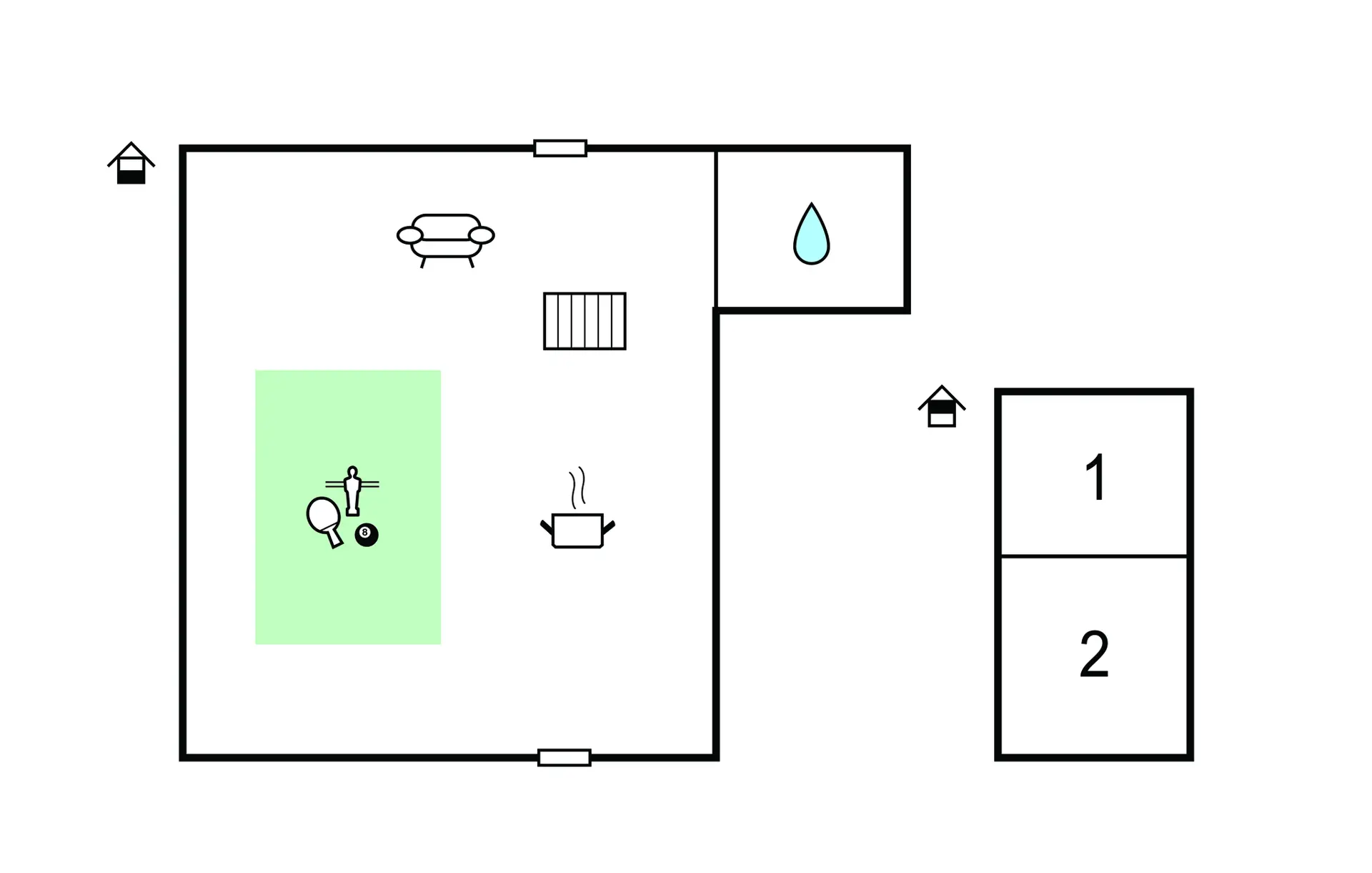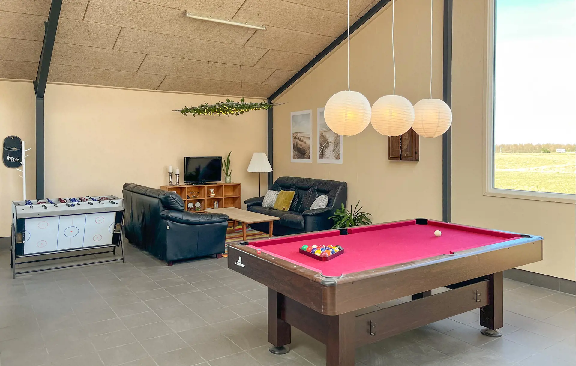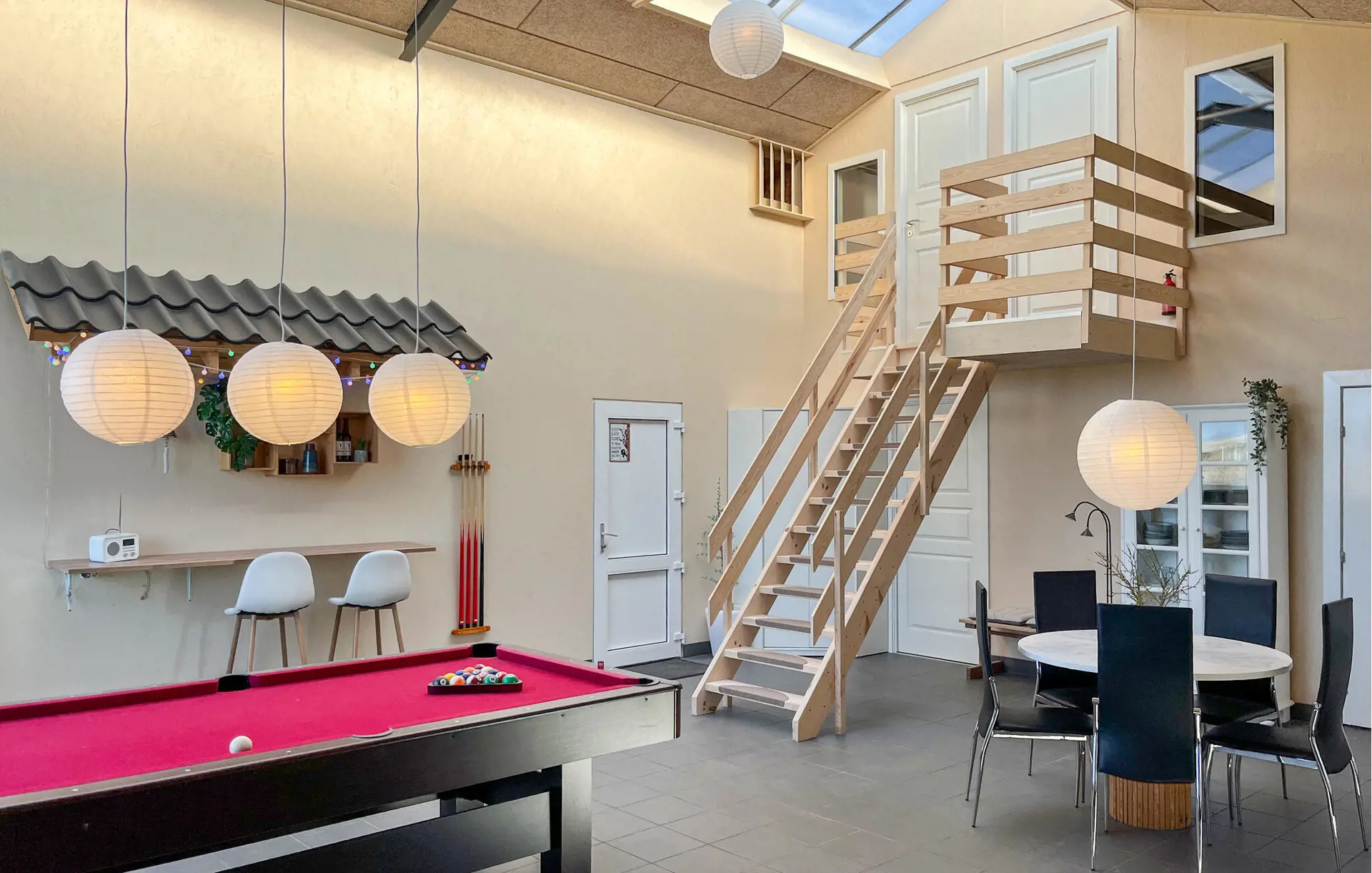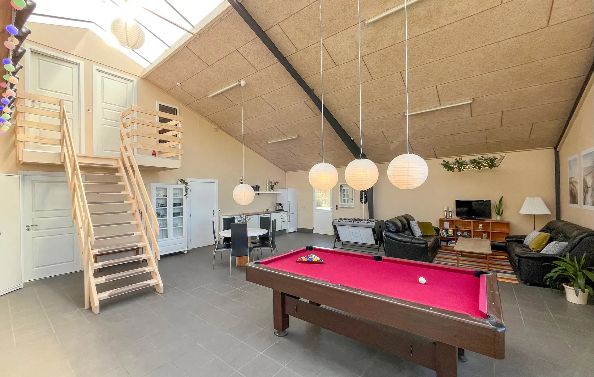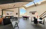 Nutzen Sie den offenen Wohnraum, der vielfältige Möglichkeiten für gemeinsame Stunden bietet. Hohe Decken und große Fenster sorgen für ein angenehmes Raumgefühl und viel Tageslicht. Spielen Sie eine Partie Billard oder Tischfußball und nehmen Sie anschließend auf den bequemen Sofas Platz. Entspannen Sie hier bei einem Film oder guten Gesprächen. Nutzen Sie die praktische Küchenzeile, um kleine Mahlzeiten zuzubereiten, und versammeln Sie sich am Esstisch für gemeinsame Runden.