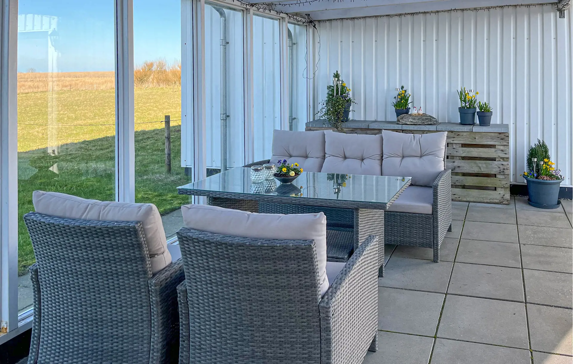 Treten Sie hinaus auf die überdachte Terrasse und genießen Sie den freien Blick über die offene Landschaft bis zum Wasser. Machen Sie es sich in den bequemen Gartenmöbeln gemütlich und lassen Sie die frische Luft auf sich wirken. Nutzen Sie den gepflegten Rasen für entspannte Stunden oder kleine Spiele im Freien.