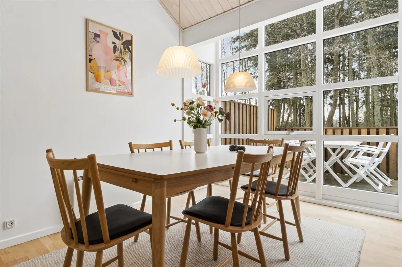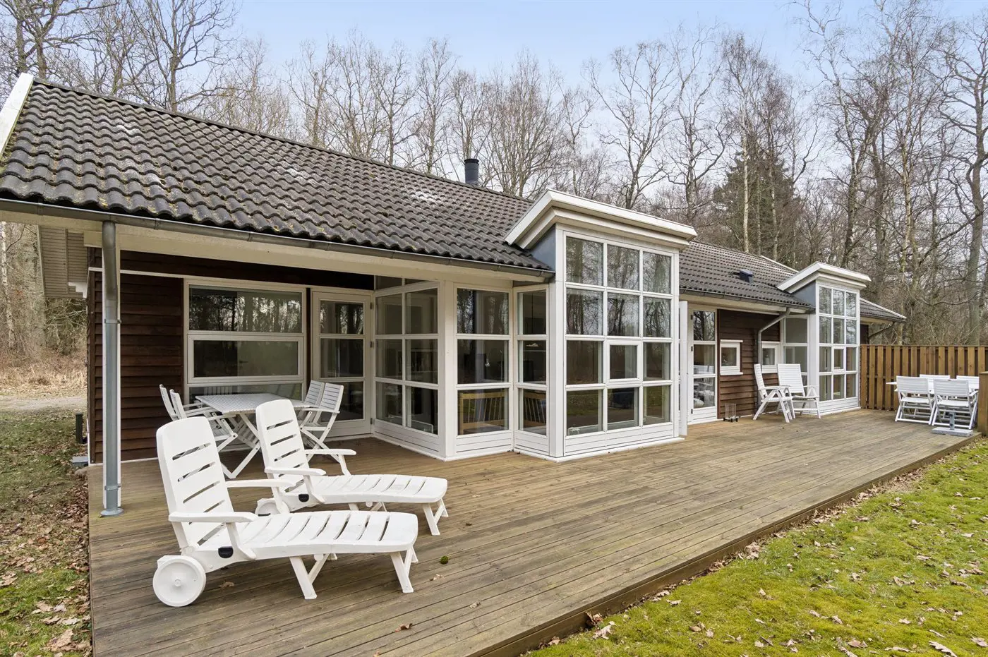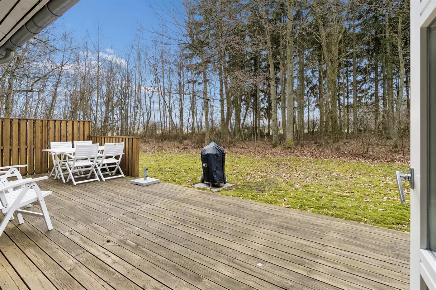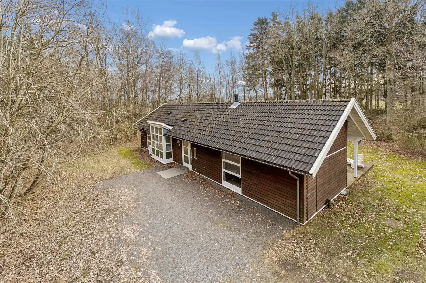 Auch außen präsentiert sich das Haus sehr gepflegt. Besonders die große, teilweise überdachte Terrasse lädt dazu ein, die Ruhe der grünen Umgebung zu genießen. Von hier aus erreichst du außerdem bequem die von Wald umgebenen Ufer des Rubinsøen – ein echtes Naturjuwel.