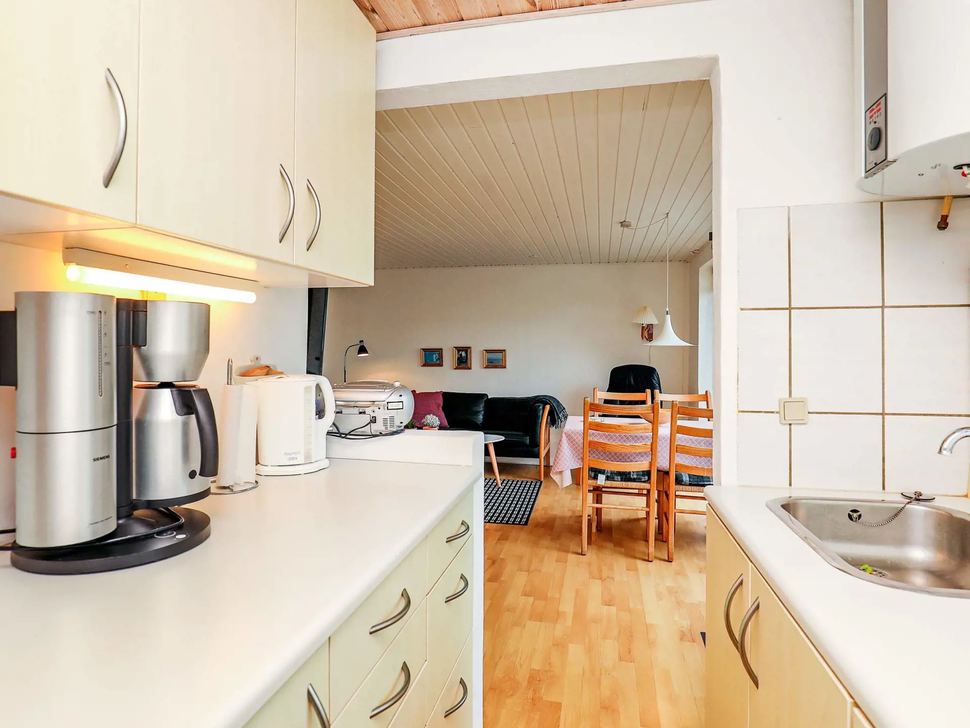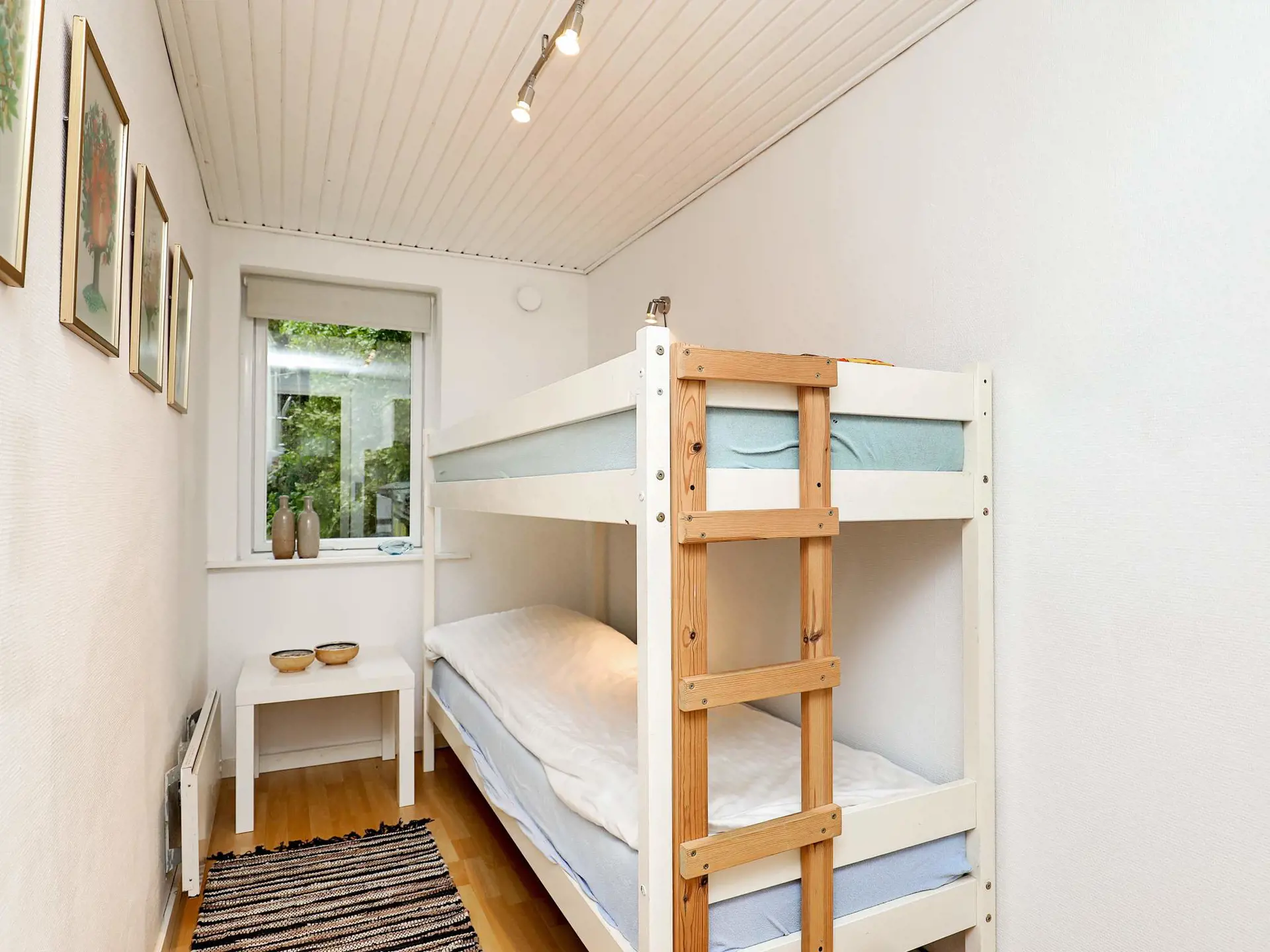 Das Ferienhäuschen hat einen kleinen, offenen Küchen-/Wohnbereich mit Ess- und Sitzecke sowie klimafreundlicher Wärmepumpe. Ein Schlafzimmer mit Doppelbett (140x200 cm), das zweite mit Etagenbett mit zwei Kojen. Kleineres dennoch zweckmäßiges Badezimmer mit Dusche. Perfekt für ein Paar oder eine Familie mit kleineren Kindern, die günstig aber zugleich zentral wohnen möchte.