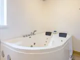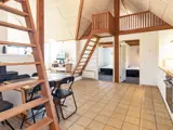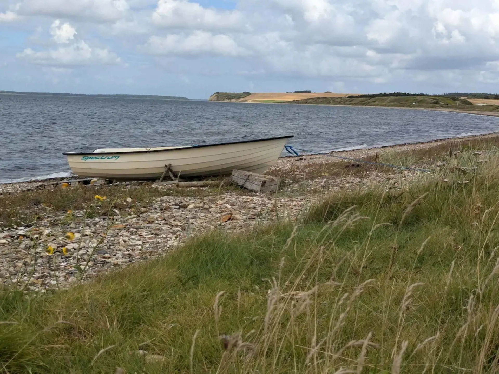 Ferienhaus Baujahr 2008, mit Whirlpool im Bad und sechs Schlafplätzen. Innen Eingang bzw. Hauswirtschaftsraum, Küche und Essecke mit hoher Decke, Holzofen und 2 Stufen hinab zum Wohnzimmer. Vom Wohnzimmer aus hat man einen schönen Blick über das Gelände. Über die Hecke blicken Sie auf das Feld und vom Wohnzimmer, Dachboden und Garten aus haben Sie sogar Ausblick bis zum Limfjord. Das Grundstück befindet sich neben Feldern.