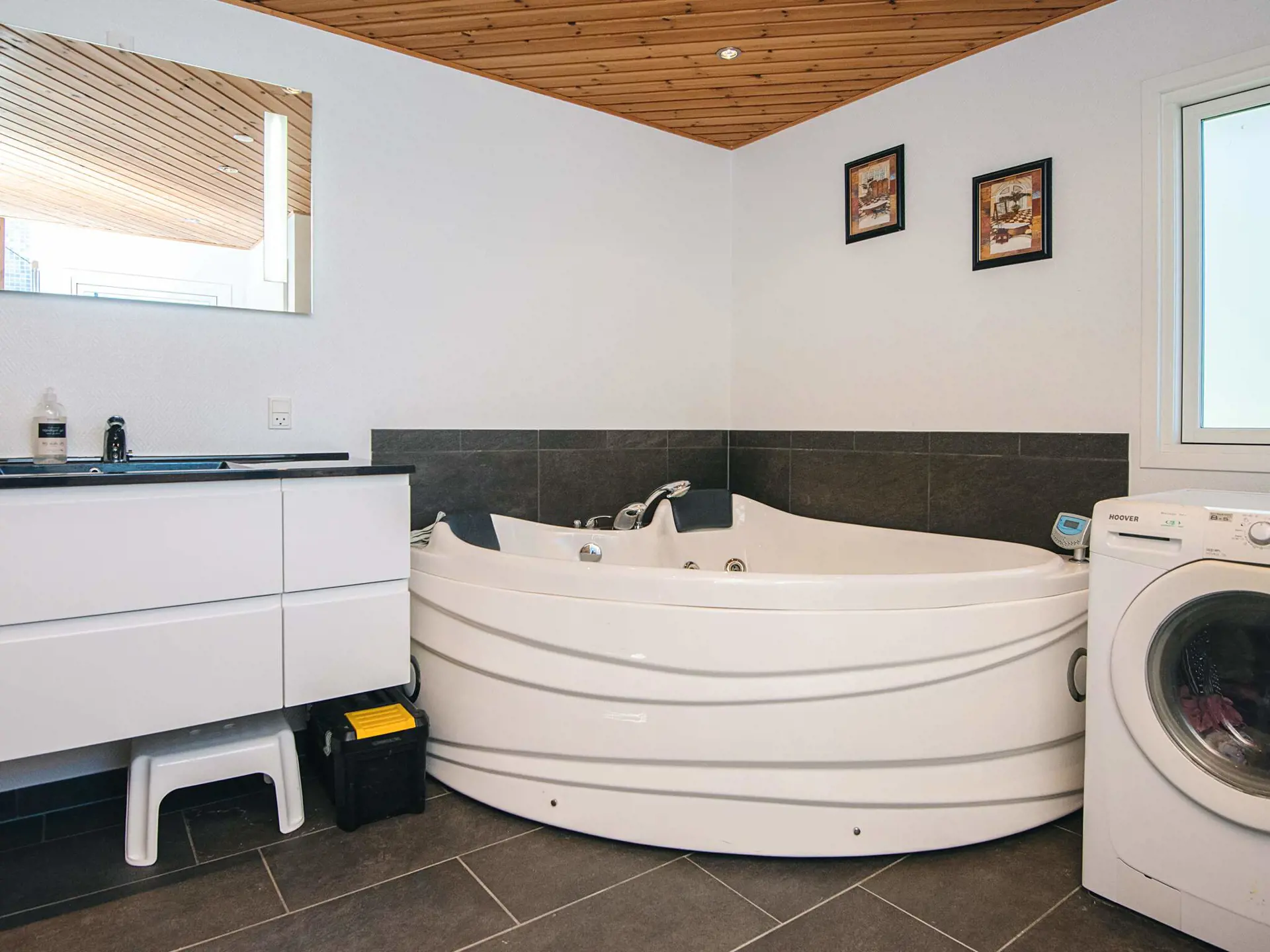 Das Ferienhaus ist gepflegt und modernisiert und liegt auf einem großen Naturgrundstück. Es gibt ein Badezimmer mit Whirlpool, ebenerdiger Dusche, Waschtrockner und angenehmer Fußbodenheizung.