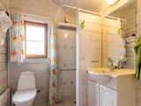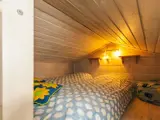 Das gut instand gehaltene Häuschen hat einen luftigen Küchen-/Wohnbereich mit hellem Holzboden und viel Platz für das Familienleben. Außerdem gibt es zwei Schlafzimmer im Haus: eines mit Doppelbett, das zweite mit Etagenbett und separatem Zugang über die Veranda. Oben unter der Dachschräge findet man den Hems mit zwei weiteren Schlafplätzen. Außerdem Bad mit Dusche/WC im Haus.