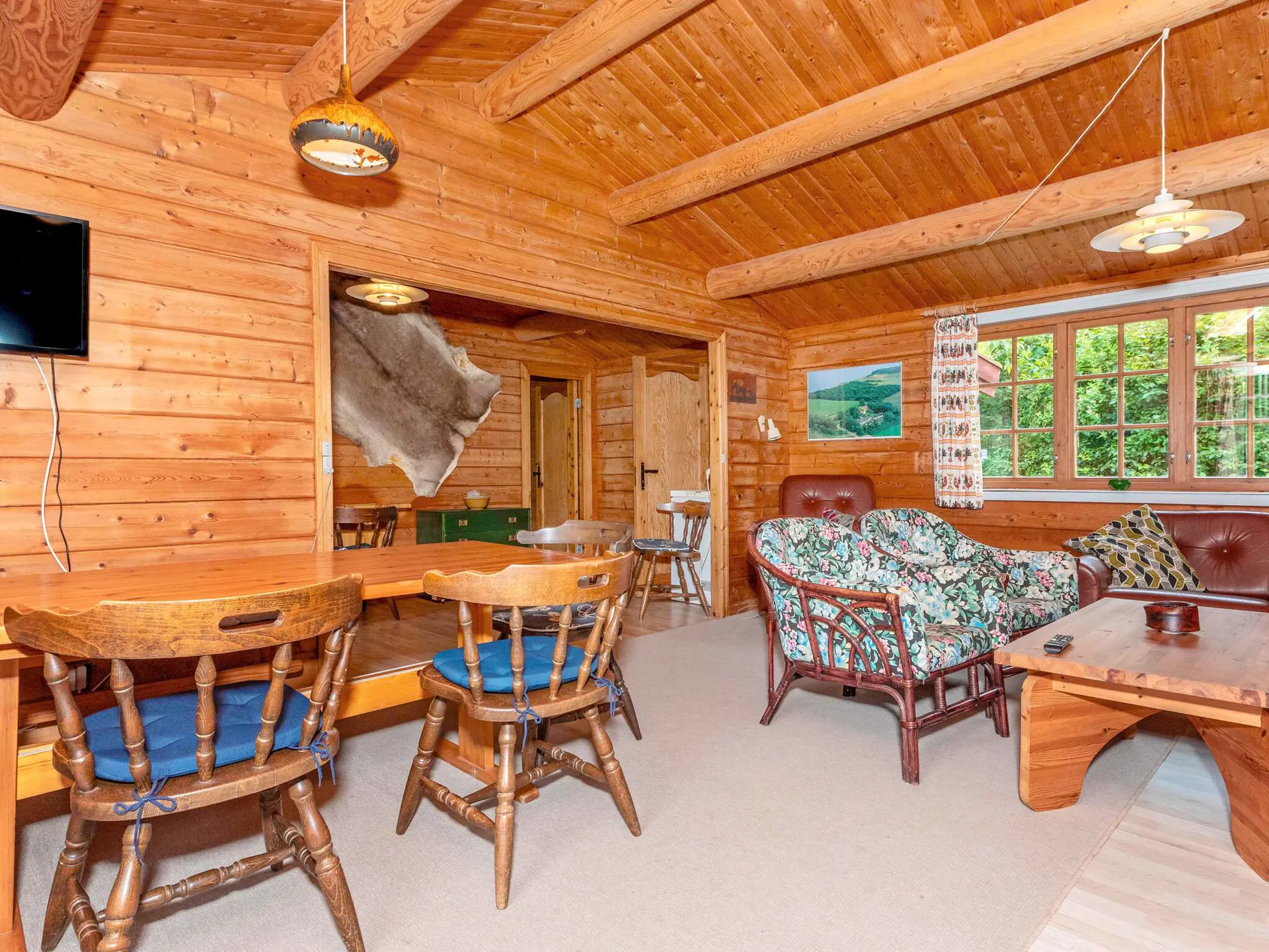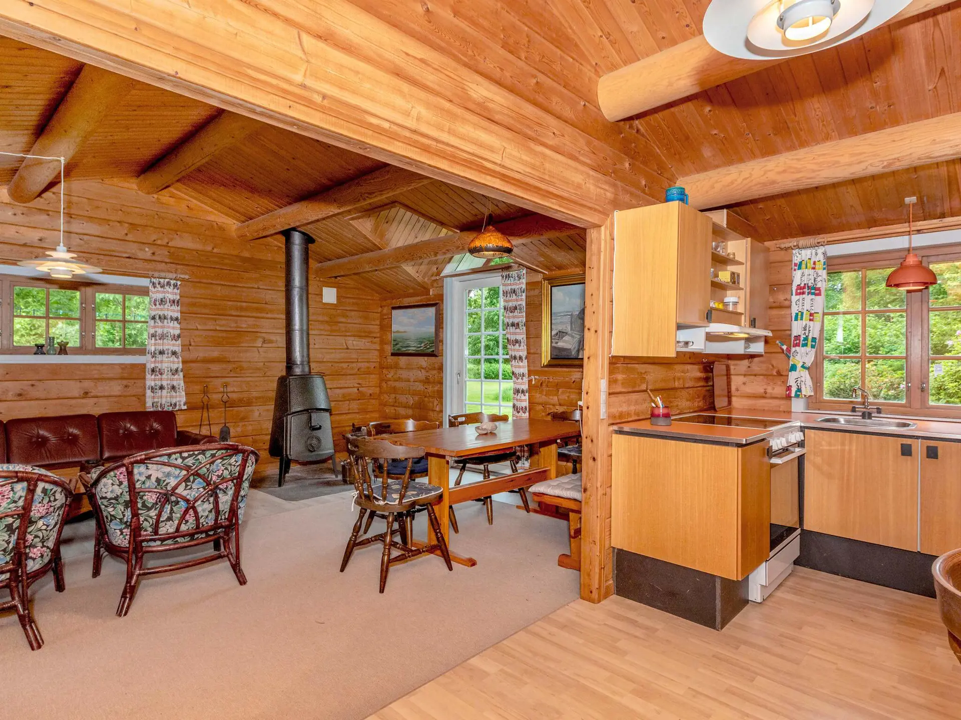 Im rustikalen Inneren des Ferienhauses gibt es eine offene Wohnküche mit Holzofen, Essecke mit Sitzbank und eine gemütliche Sitzgruppe. Der Fernseher im Wohnzimmer hat sowohl deutsche als auch dänische Sender zur Auswahl. Im Wohnbereich offene Decke bis zum First für luftiges Ambiente.