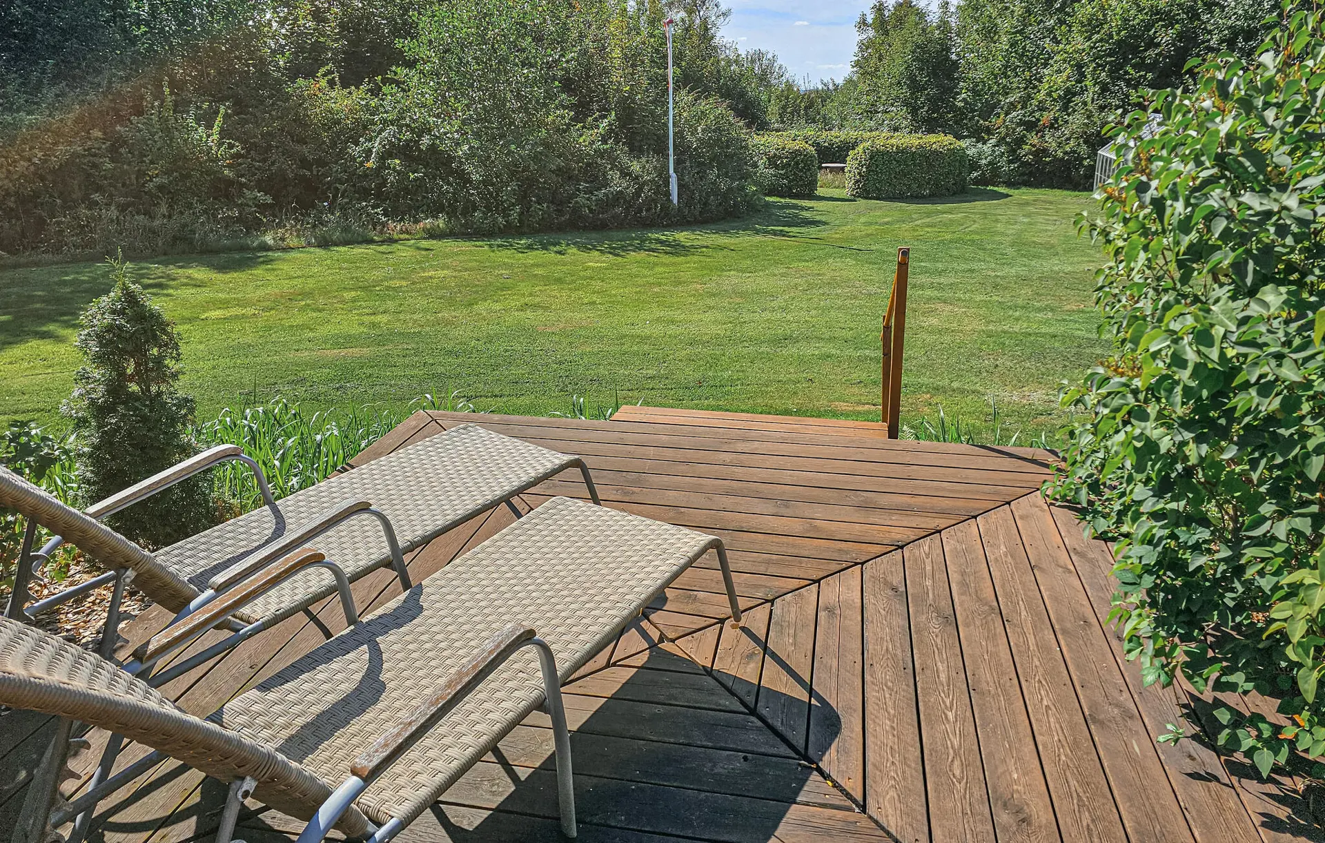 Treten Sie hinaus auf die weitläufige Holzterrasse und genießen Sie die frische Luft. Entspannen Sie in den Sonnenliegen, speisen Sie im Freien oder beobachten Sie den Sonnenuntergang über dem Garten. Der große, gepflegte Rasen bietet viel Platz zum Spielen oder für ruhige Momente im Grünen.