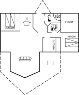 Die Schlafplätze verteilen sich auf 3 Schlafräume. 2 Schlafplätze in einem Doppelbett. 2 Schlafplätze in Einzelbetten. 2 Schlafplätze in einem Etagenbett. 2 Schlafplätze auf Matratzen. 2 von diesen Schlafplätzen befinden sich im offenen Obergeschoss.