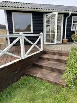 Die Terrasse lädt zu entspannten Morgenstunden mit Kaffee oder gemütlichen Grillabenden im Freien ein. Das große Grundstück bietet viel Platz zum Spielen und Entspannen, während die grüne Umgebung eine friedliche Atmosphäre schafft – ideal für Familien oder Paare, die eine Auszeit suchen.