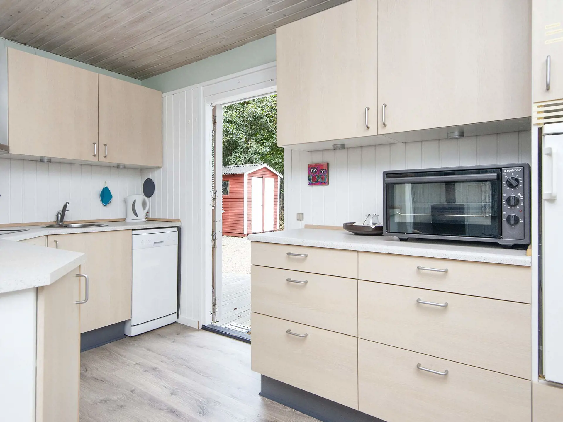 Das Ferienhaus ist hell und gemütlich eingerichtet und hat ein großes Wohnzimmer mit direktem Zugang zur Terrasse. An das Wohnzimmer schließt sich ein schöner, heller Wintergarten an, von dem aus man Panoramablick ins Grüne hat. Praktische Einrichtung und familienfreundliche Wohnküche im Haus. Die Küche ist u.a. ausgestattet mit Ceranfelder, Minibackofen, Mikrowelle und Geschirrspüler. Im Wohnzimmer gibt es bequeme Möbel, Flachbildfernseher mit freien dänischen Sendern und WLAN. Für kühlere Tage steht ein gemütlicher Holzofen bereit.