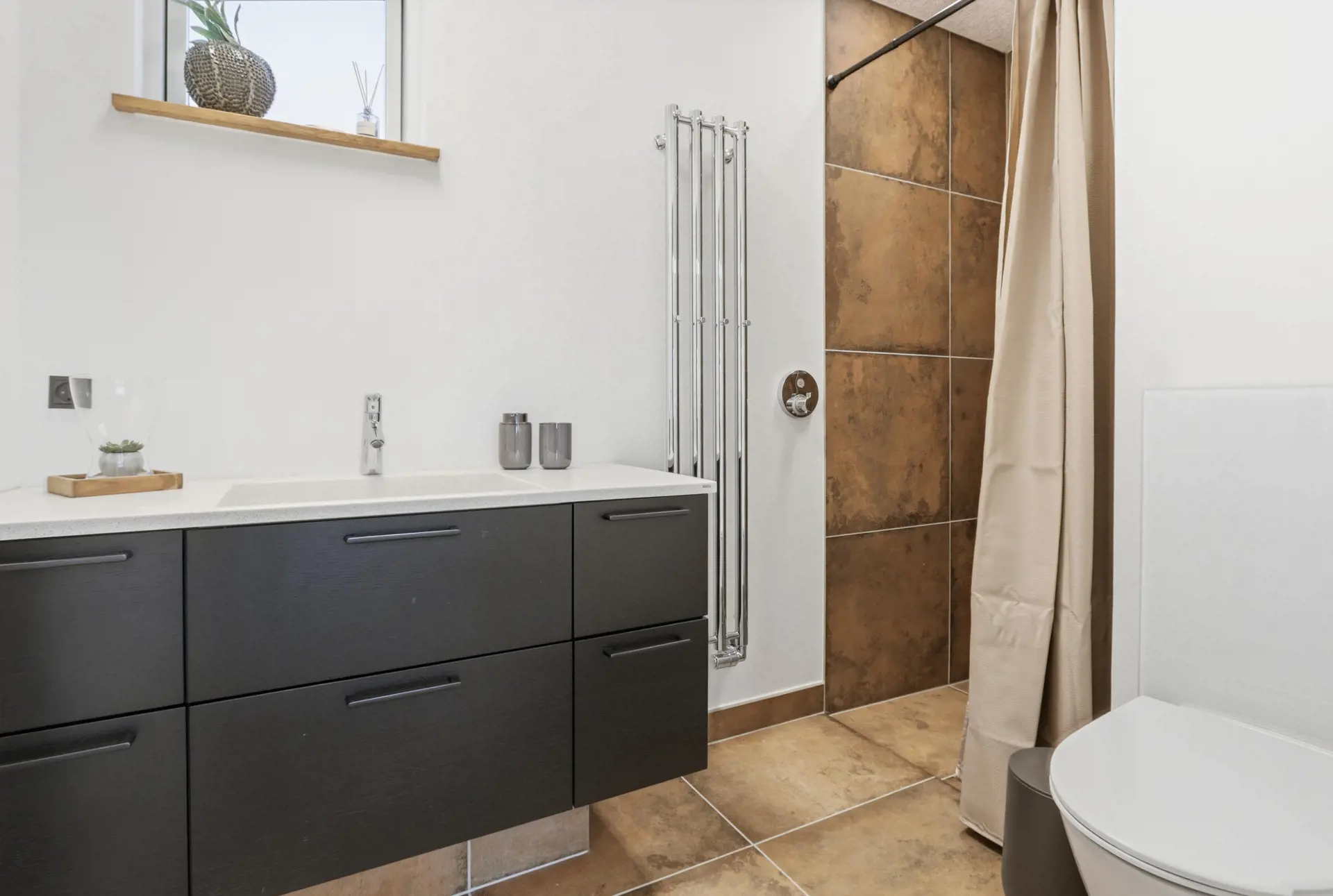 Das Haus bietet Platz für bis zum 6 Personen und 1 Hund, verteilt auf 3 schöne Schlafzimmer. Der große, offene Wohnbereich ist nach Süden ausgerichtet und verfügt über große Panoramafenster, die sich vollständig öffnen lassen – so fühlt man sich der Natur ganz nah.