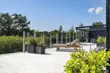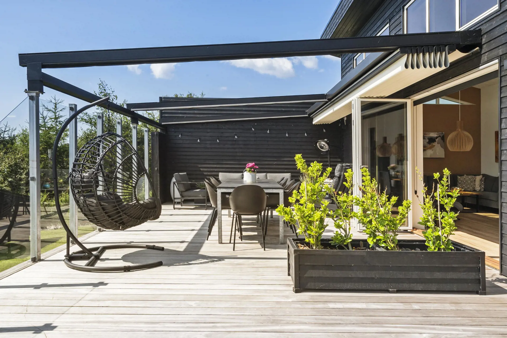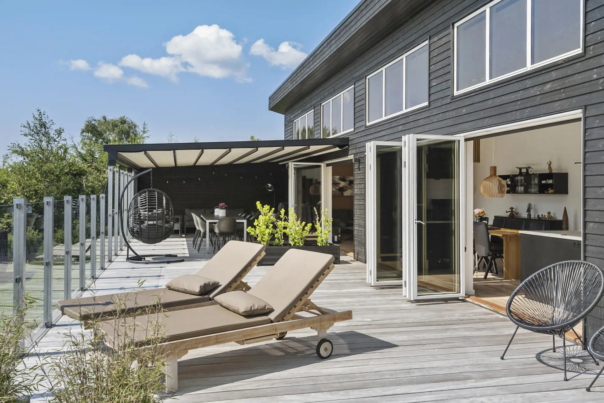 Die große, einzigartige, nach Süden ausgerichtete Holzterrasse ist abgeschirmt und bietet zu jeder Zeit windgeschützte Plätze. Von morgens bis abends können Sie hier die Sonne genießen – ideal für den Morgenkaffee, ein Sonnenbad oder das Abendessen unter freiem Himmel. Bequeme Gartenmöbel, Liegestühle und eine Lounge-Sofaecke machen das Erlebnis perfekt.