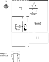 Es gibt einen Schlafraum. 2 Schlafplätze in einem Doppelbett. 2 Schlafplätze in Einzelbetten. 2 Schlafplätze auf einer Doppelschlafcouch. 2 von diesen Schlafplätzen befinden sich im Gästehaus und 2 im Wohnzimmer.