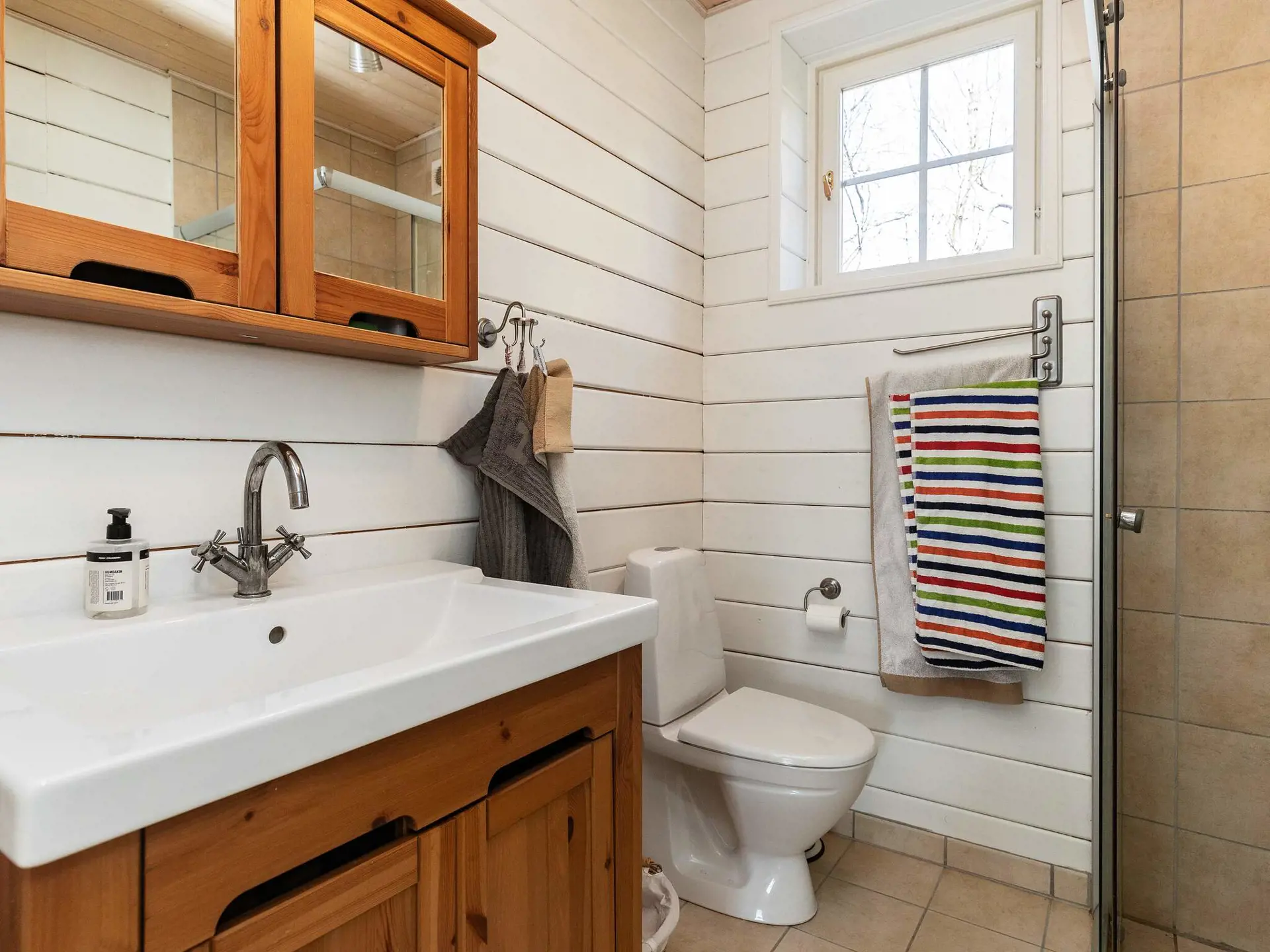 Das Badezimmer ist hell und praktisch und verfügt über eine Dusche, ein Waschbecken, eine Toilette und eine Waschmaschine, so dass Sie sich während Ihres gesamten Aufenthalts wohlfühlen werden.